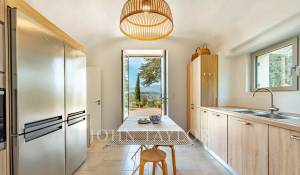 Die geräumige, voll ausgestattete Küche eröffnet einen freien Blick auf die Hügel von Grasse, während das Esszimmer direkten Zugang zur Terrasse und zum Garten bietet.