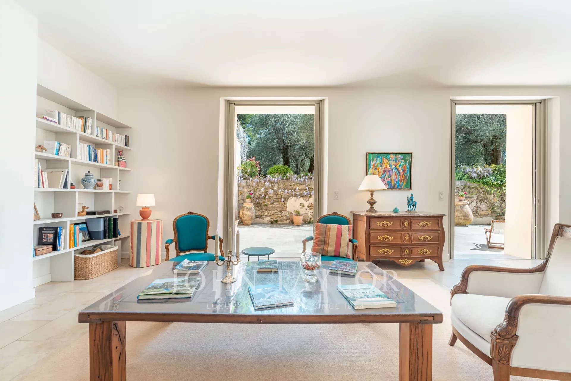 Das Grundstück umfasst gepflegte Rasenflächen, terrassierte Gärten mit Cailletier-Olivenbäumen – einer für die Region typischen Sorte –, mediterrane Pflanzen und Sträucher sowie Wald- und Ackerflächen.