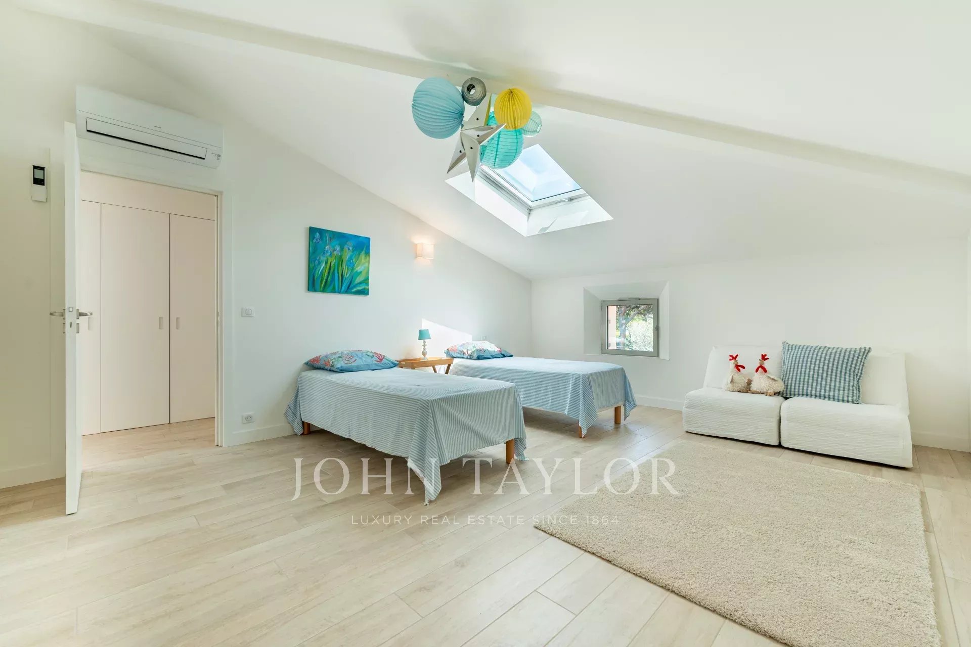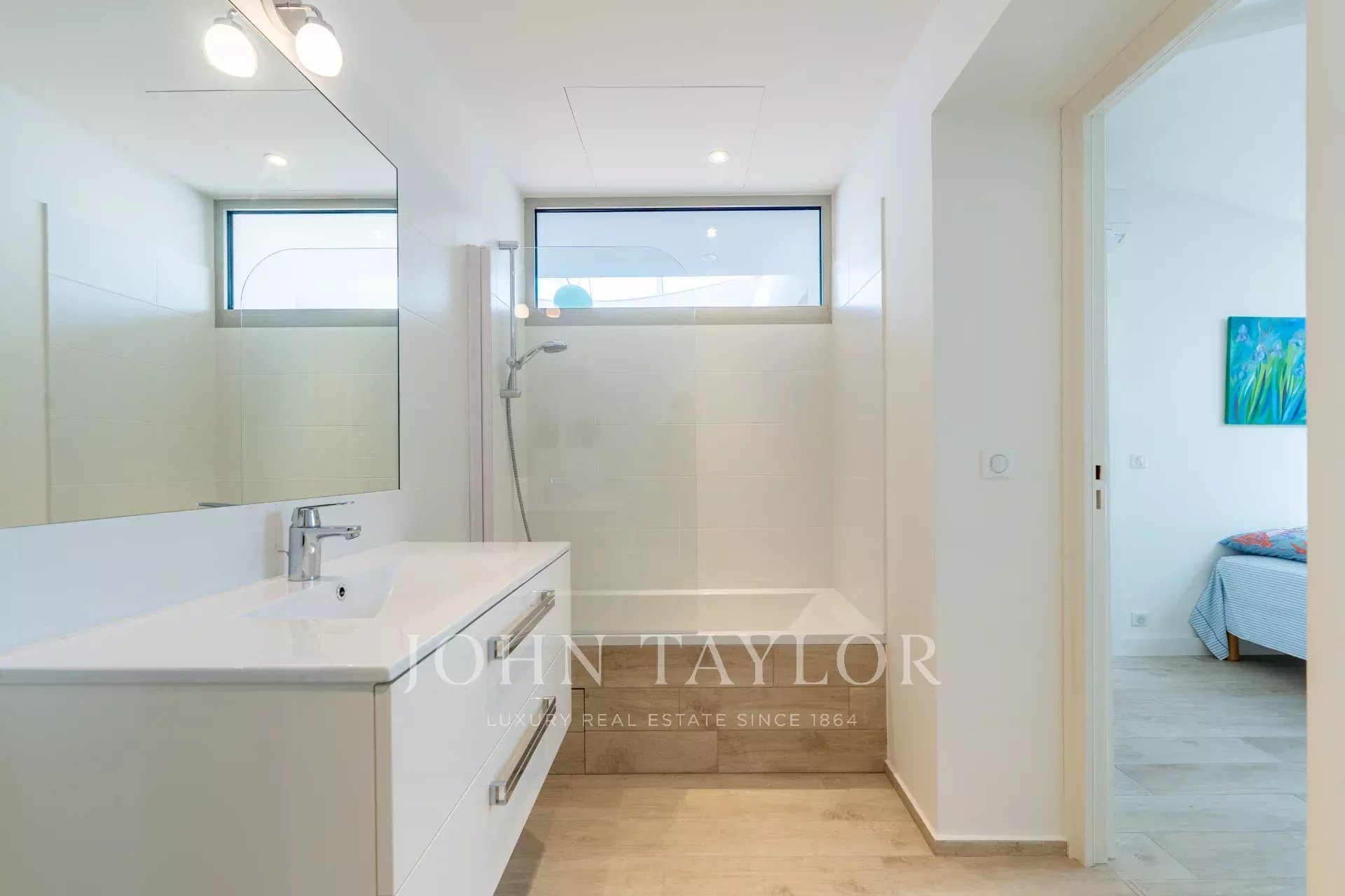 Im Obergeschoss befindet sich das Hauptschlafzimmer mit eigenem Bad, Ankleidezimmer und teilweisem Meerblick auf die Bucht von Mandelieu.