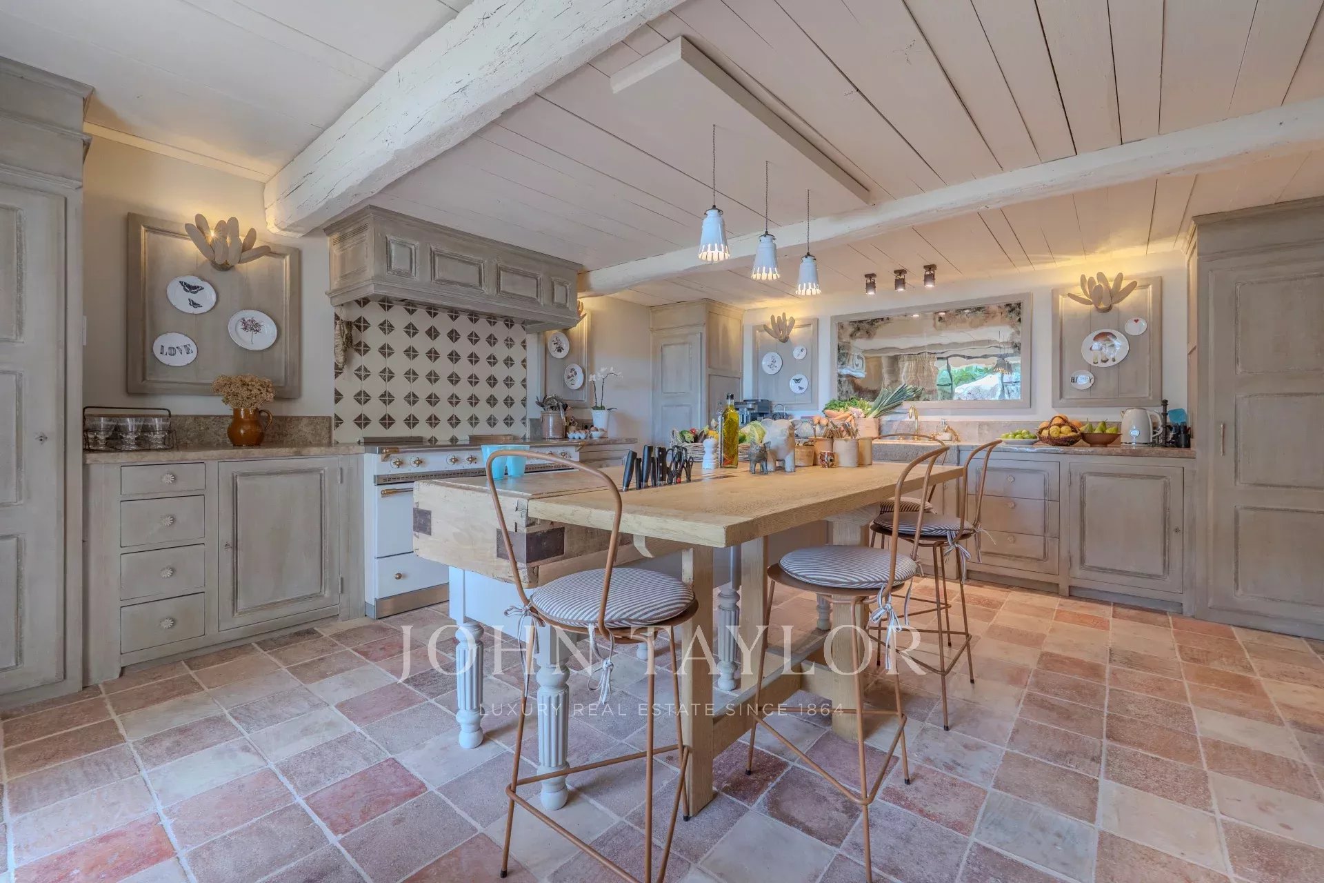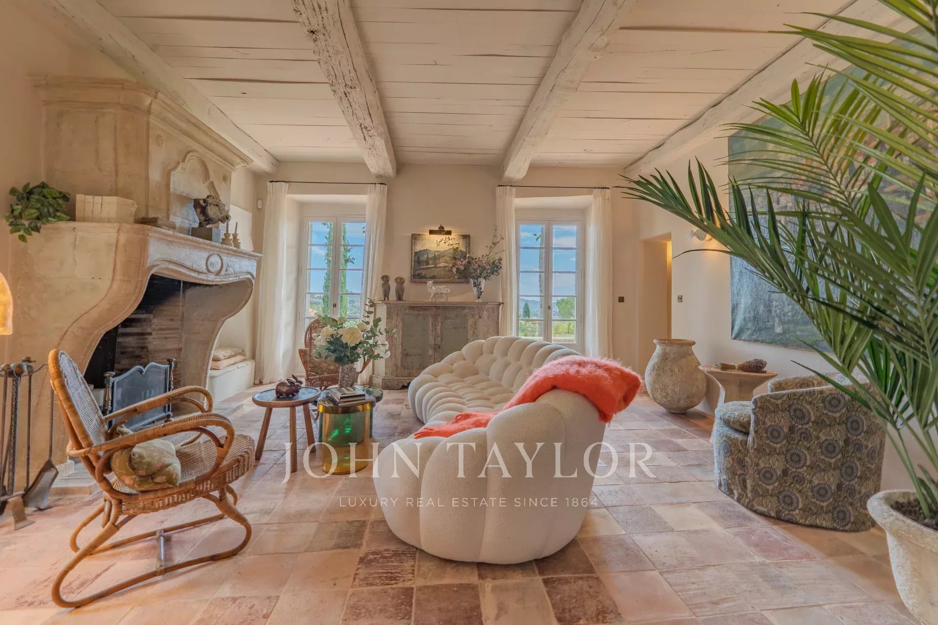 Die Bastide erstreckt sich über drei Ebenen und verbindet authentischen Charme mit modernstem Komfort. Der Wohnbereich umfasst einen eleganten Salon mit großem Kamin, eine TV-Lounge, ein stilvolles Esszimmer – ebenfalls mit Kamin – sowie eine großzügige, provenzalische Küche mit Zugang zu einer einladenden Terrasse. Ein klimatisierter Weinkeller rundet das Erdgeschoss ab.