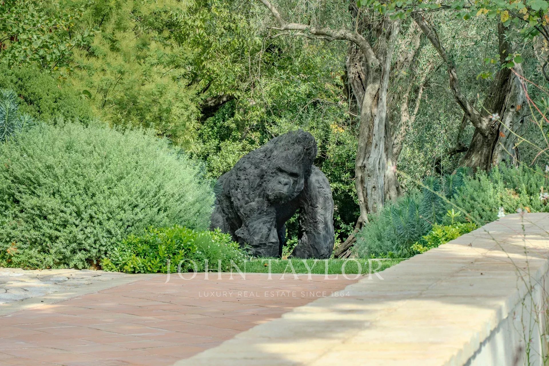 Der weitläufige Park begeistert mit zwei romantischen Naturstein-Wasserbecken, umgeben von hübschen Kaskaden, kunstvoll integrierten Skulpturen, einem Olivenhain, Weinreben und zahlreichen Rückzugsorten.