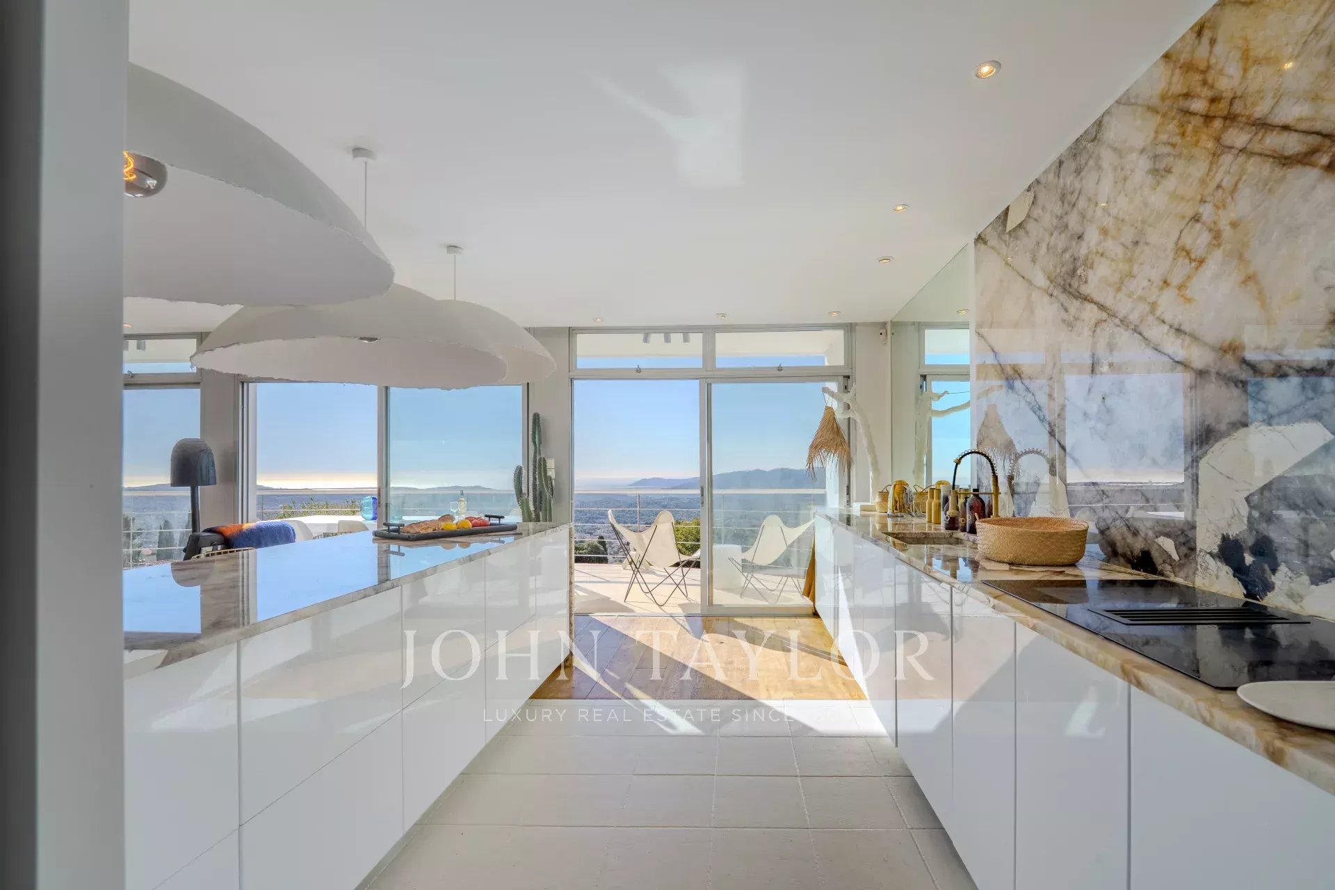 Die Hauptebene bietet einen Eingangsbereich, eine neue amerikanische Küche, ein Esszimmer, das durch große Fenster auf eine herrliche Terrasse mit Panoramablick bis zur Bucht von Mandelieu geöffnet ist, ein helles Wohnzimmer mit modernem Kamin sowie ein Fernsehzimmer.