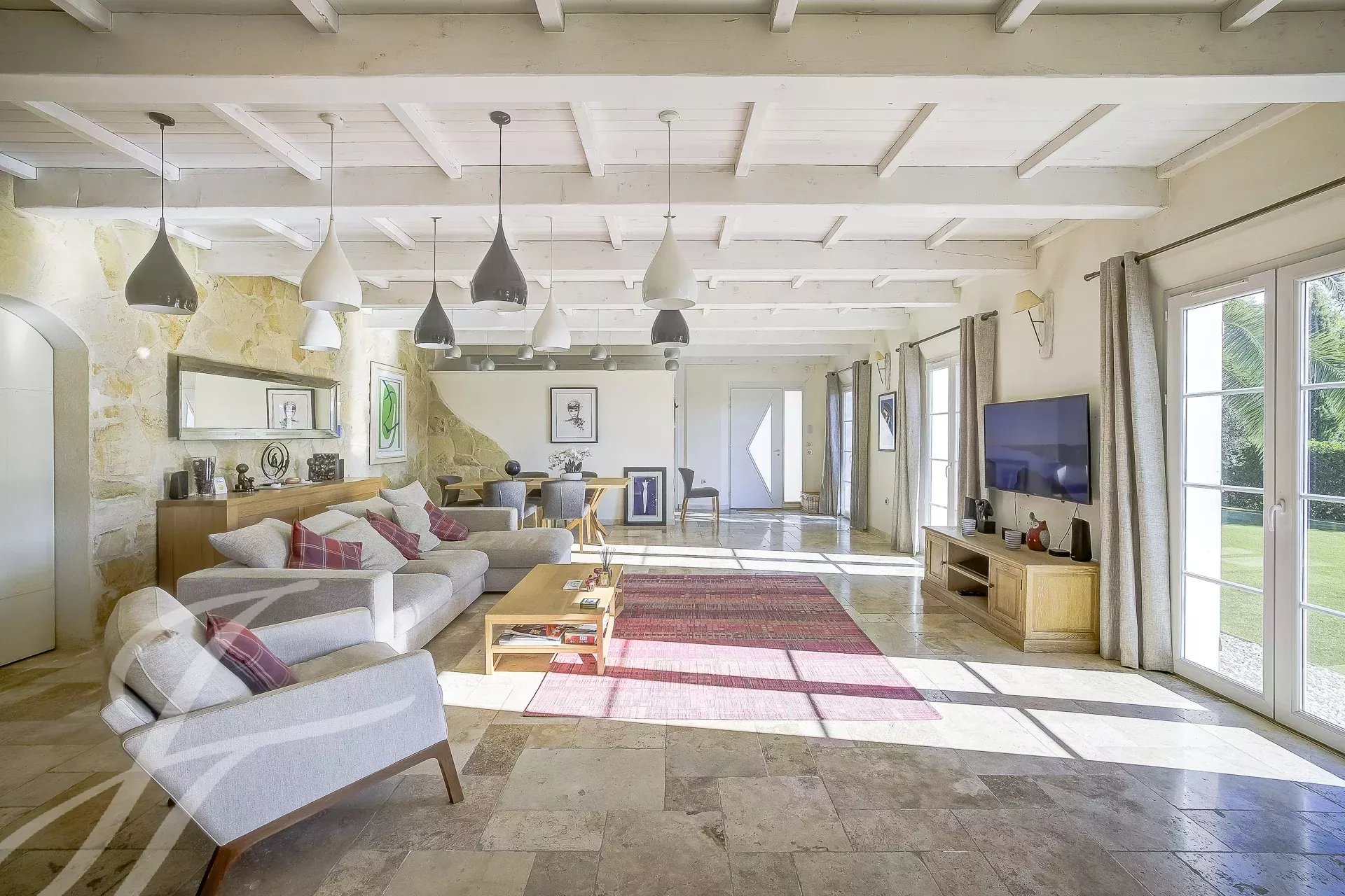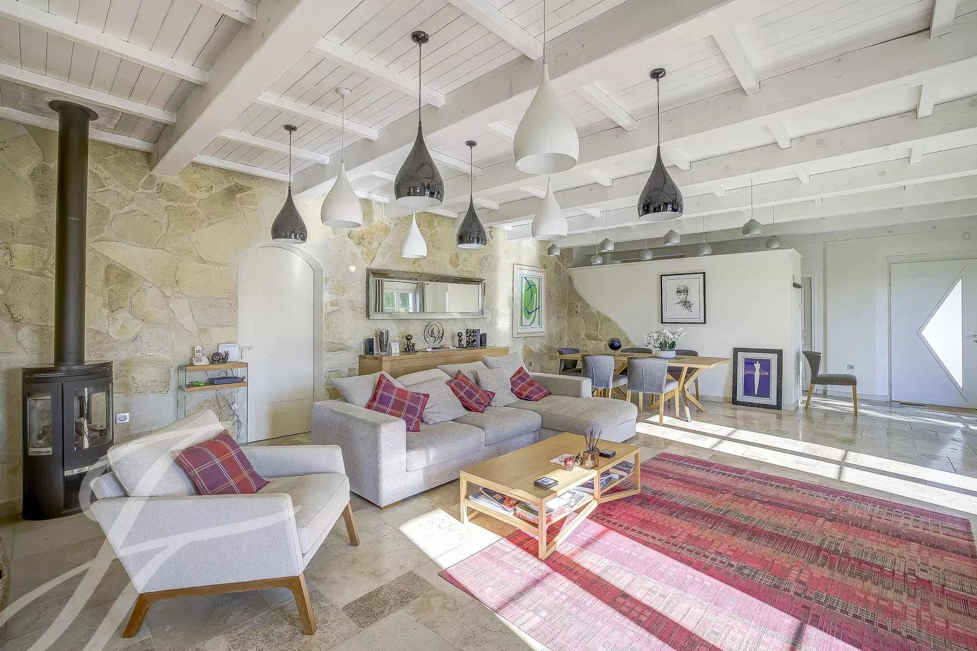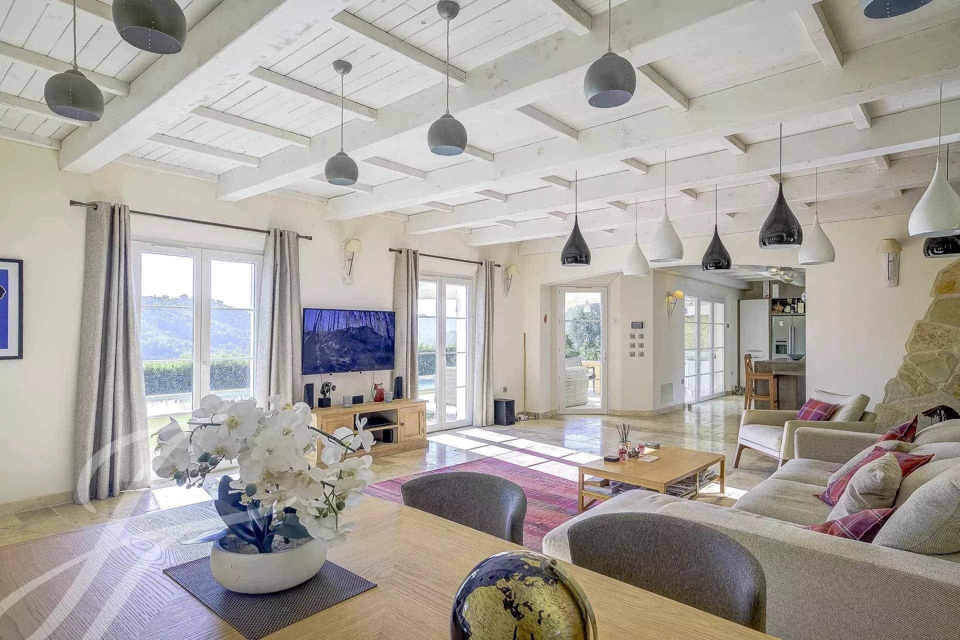 Der geräumige, offene Wohnbereich führt direkt in den Außenbereich und den Pool, von wo aus man die wunderschöne Landschaft der Region bewundern kann.