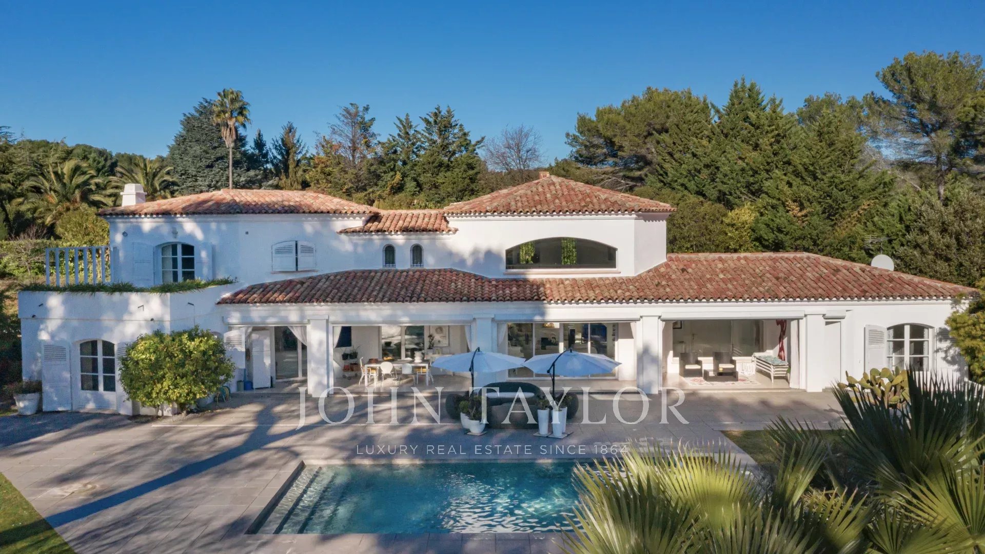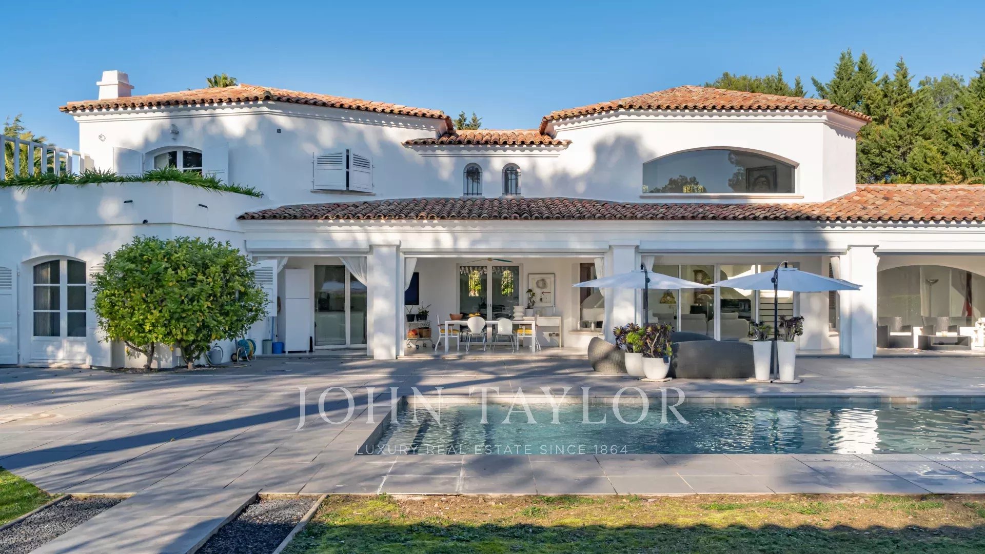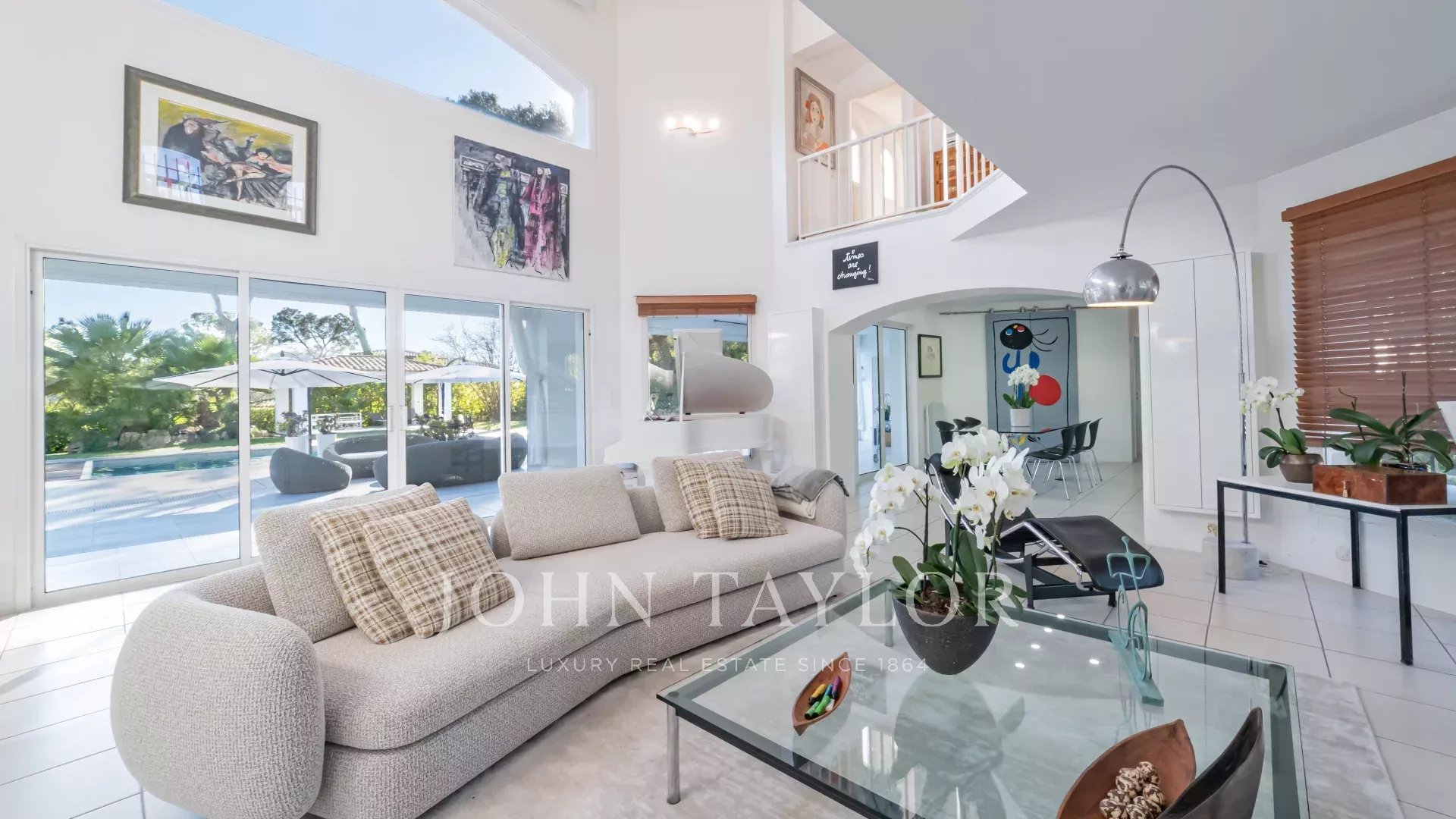 Auf einem 2.400 m² großen Parklandschaftsgarten errichtet, offenbart sie bemerkenswerte Empfangsräume, hervorgehoben durch ein spektakuläres kathedralenartiges Wohnzimmer, das lichtdurchflutet ist und sich harmonisch nach außen und zum Pool öffnet.