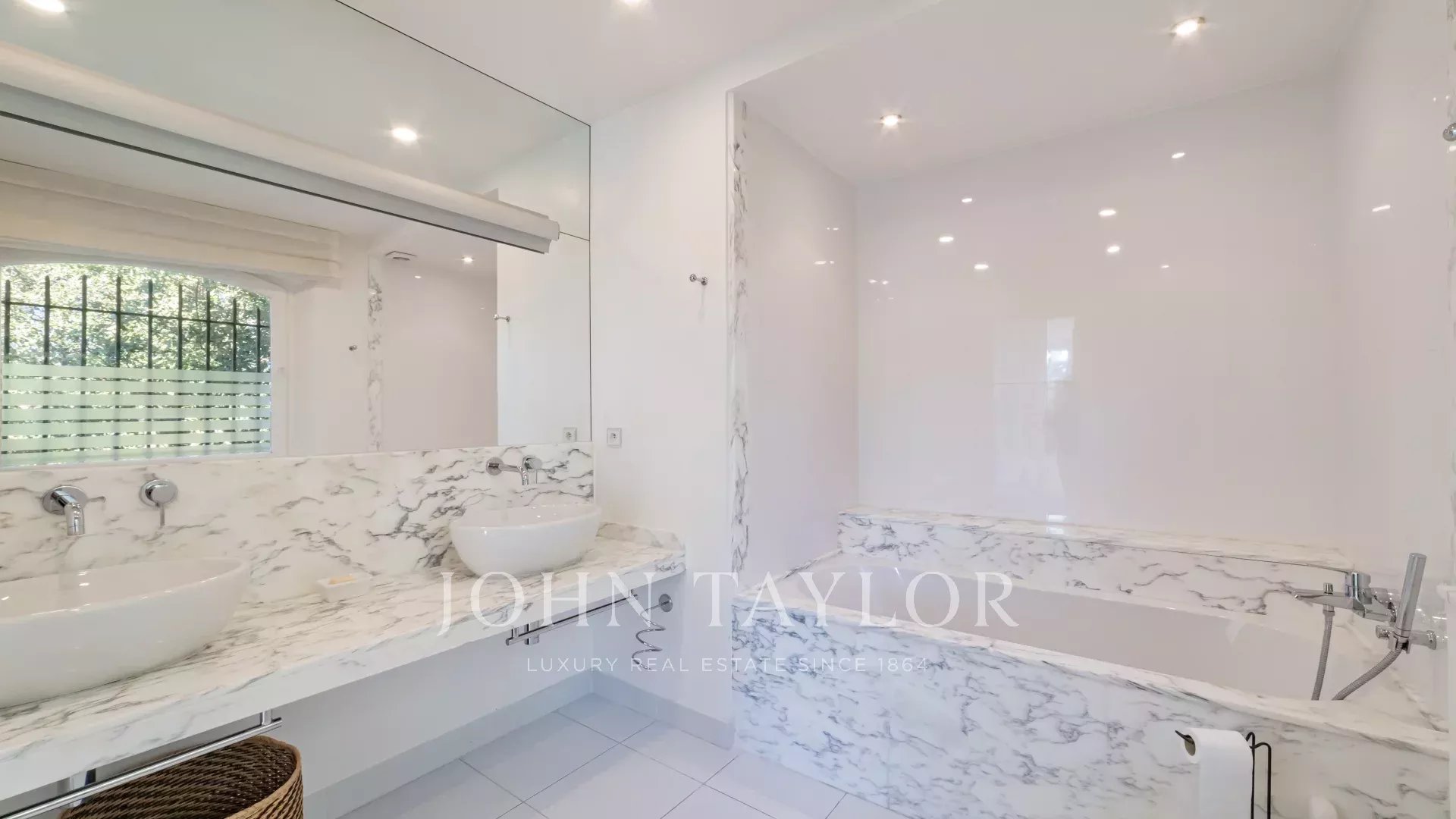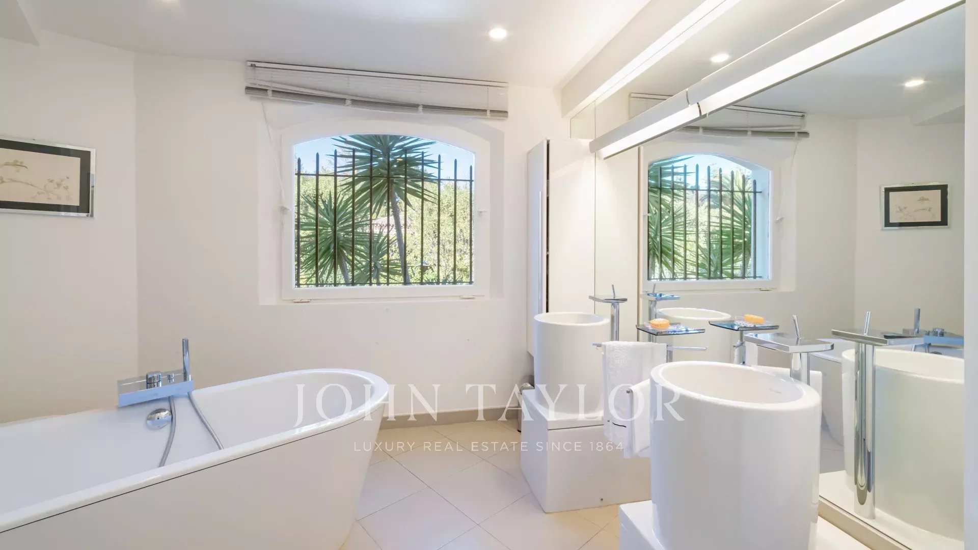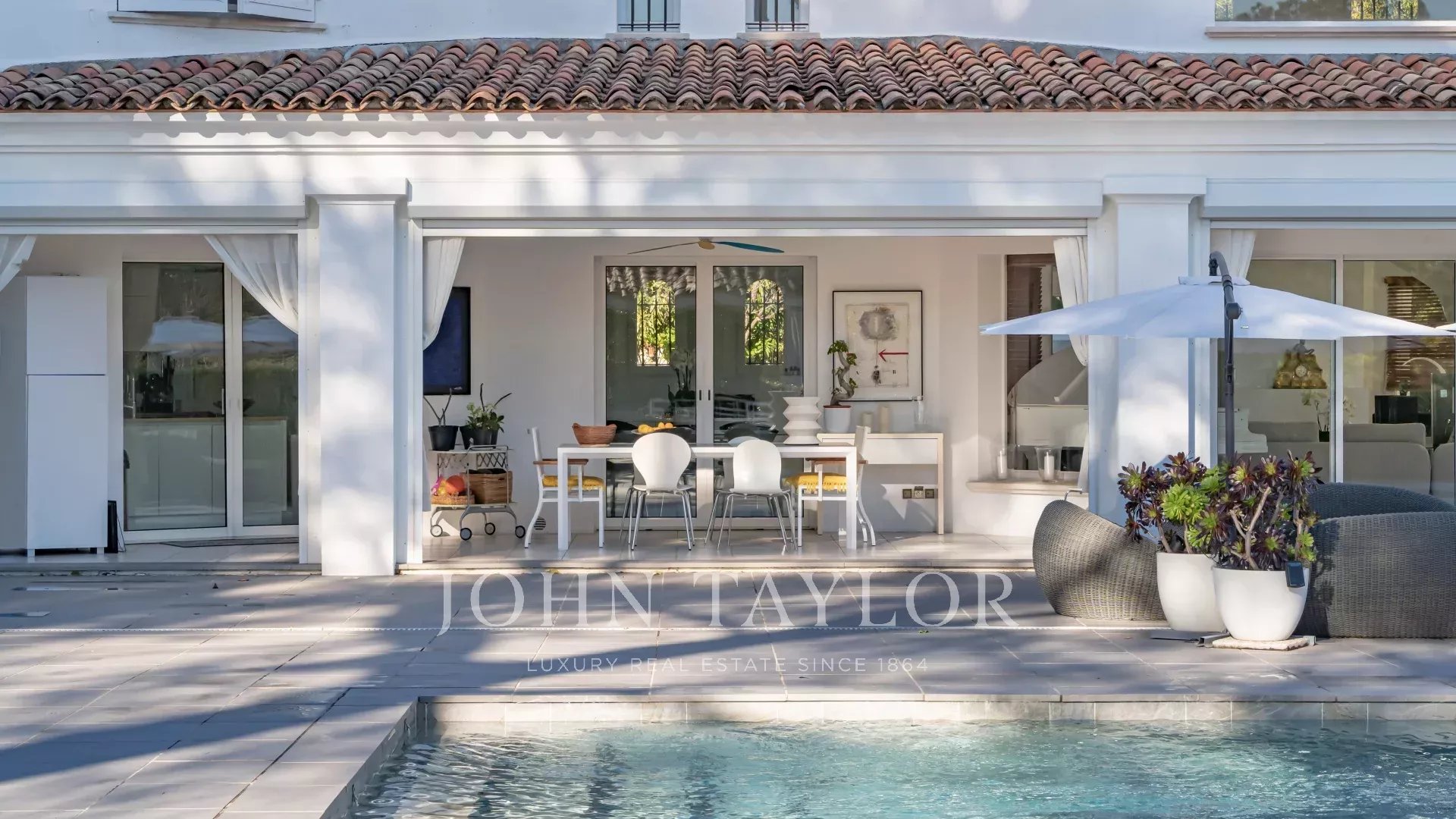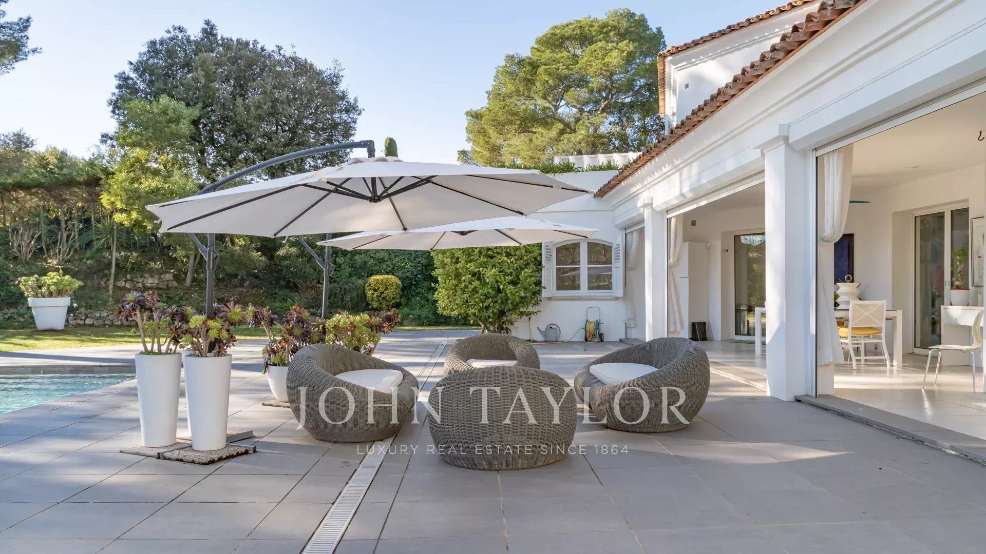 Auf einem 2.400 m² großen Parklandschaftsgarten errichtet, offenbart sie bemerkenswerte Empfangsräume, hervorgehoben durch ein spektakuläres kathedralenartiges Wohnzimmer, das lichtdurchflutet ist und sich harmonisch nach außen und zum Pool öffnet.