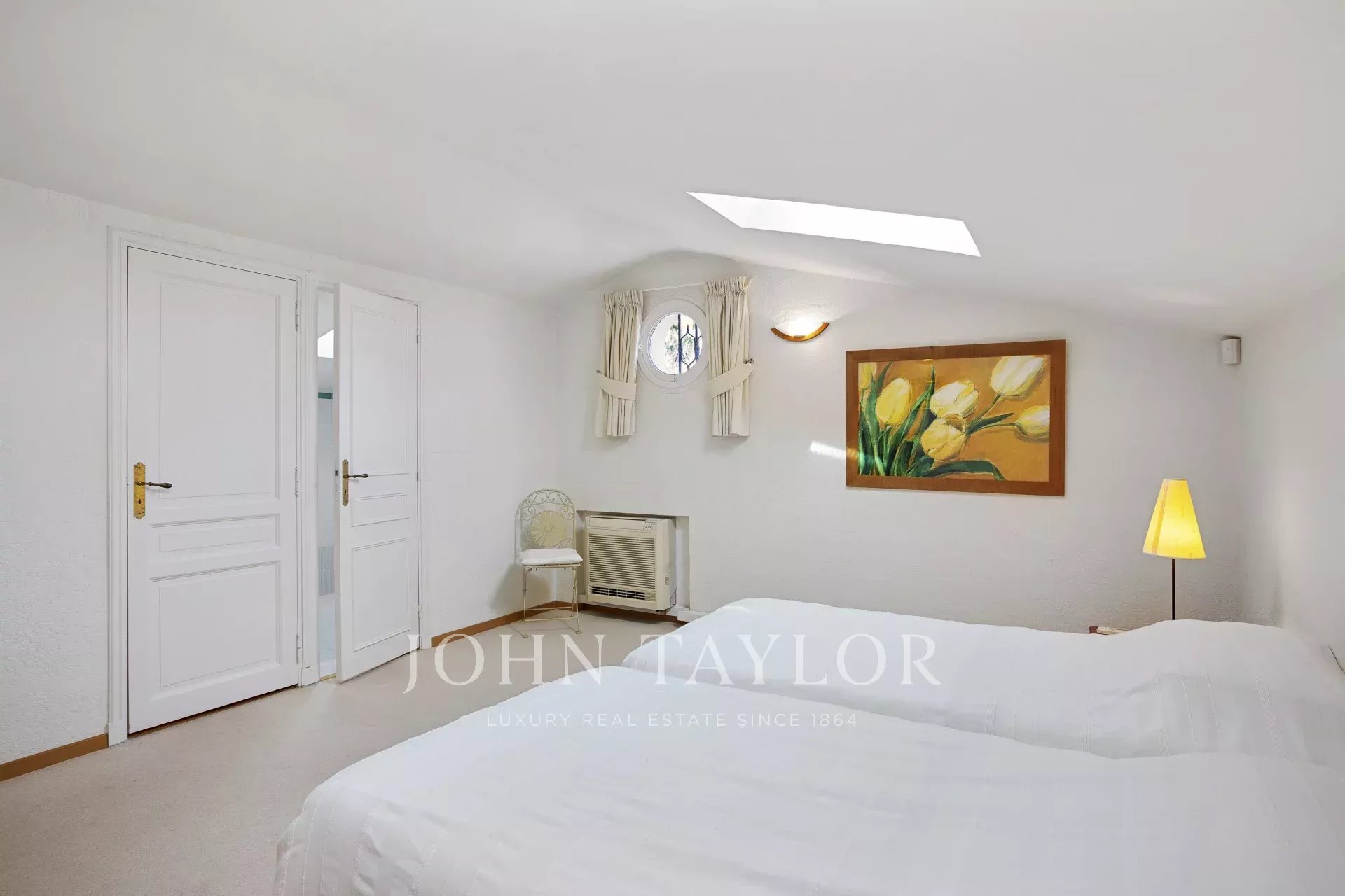 Im ersten Stock befindet sich ein Schlafzimmer mit Duschbad und ein großes Hauptschlafzimmer mit Ankleidezimmer und Badezimmer mit großer Terrasse und Blick auf den Park und den Pool.
