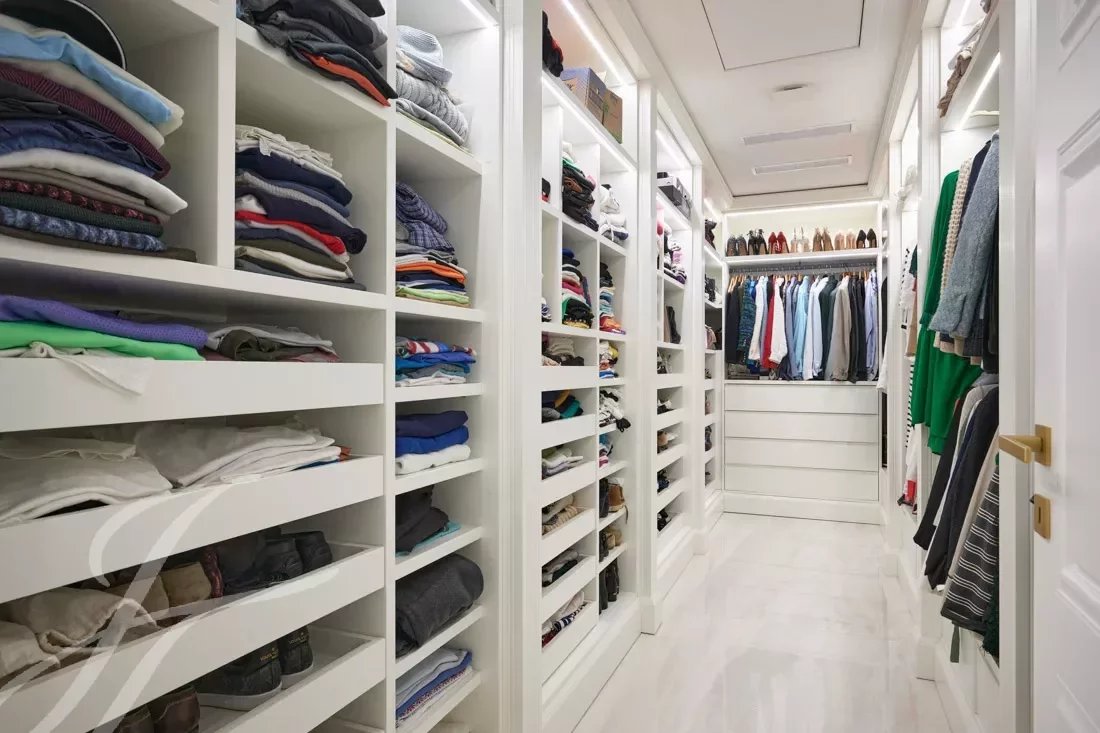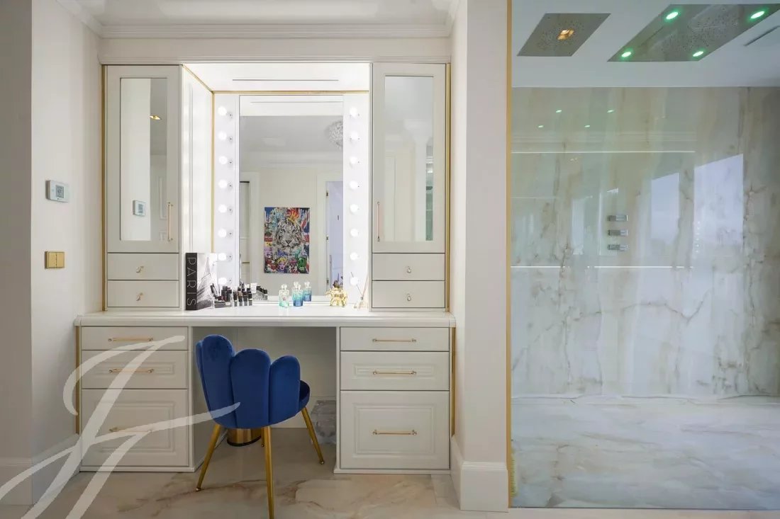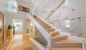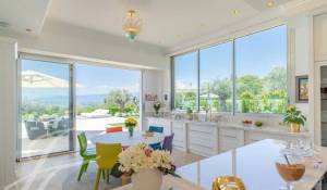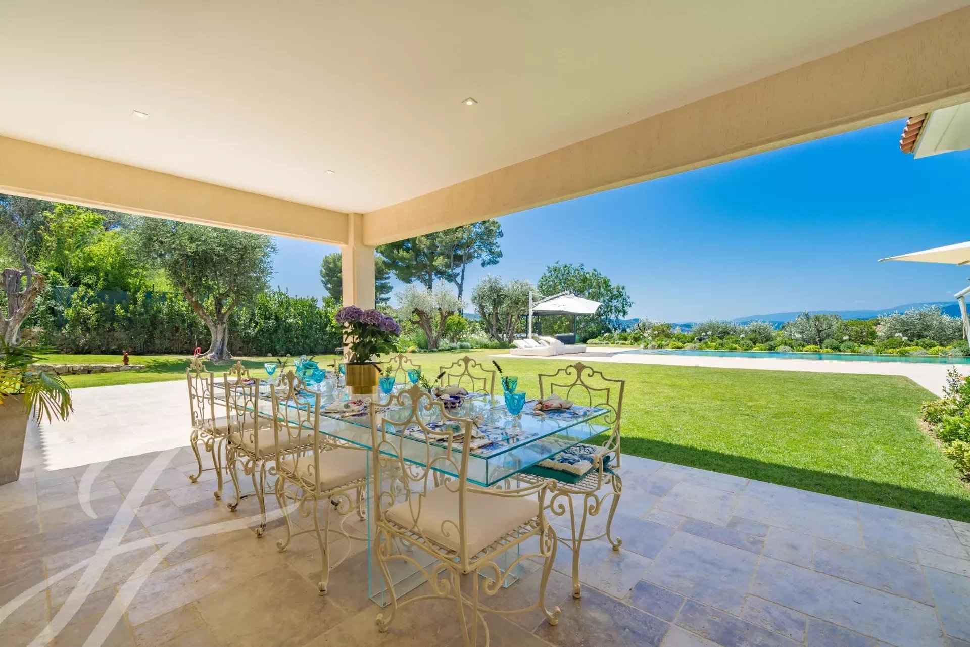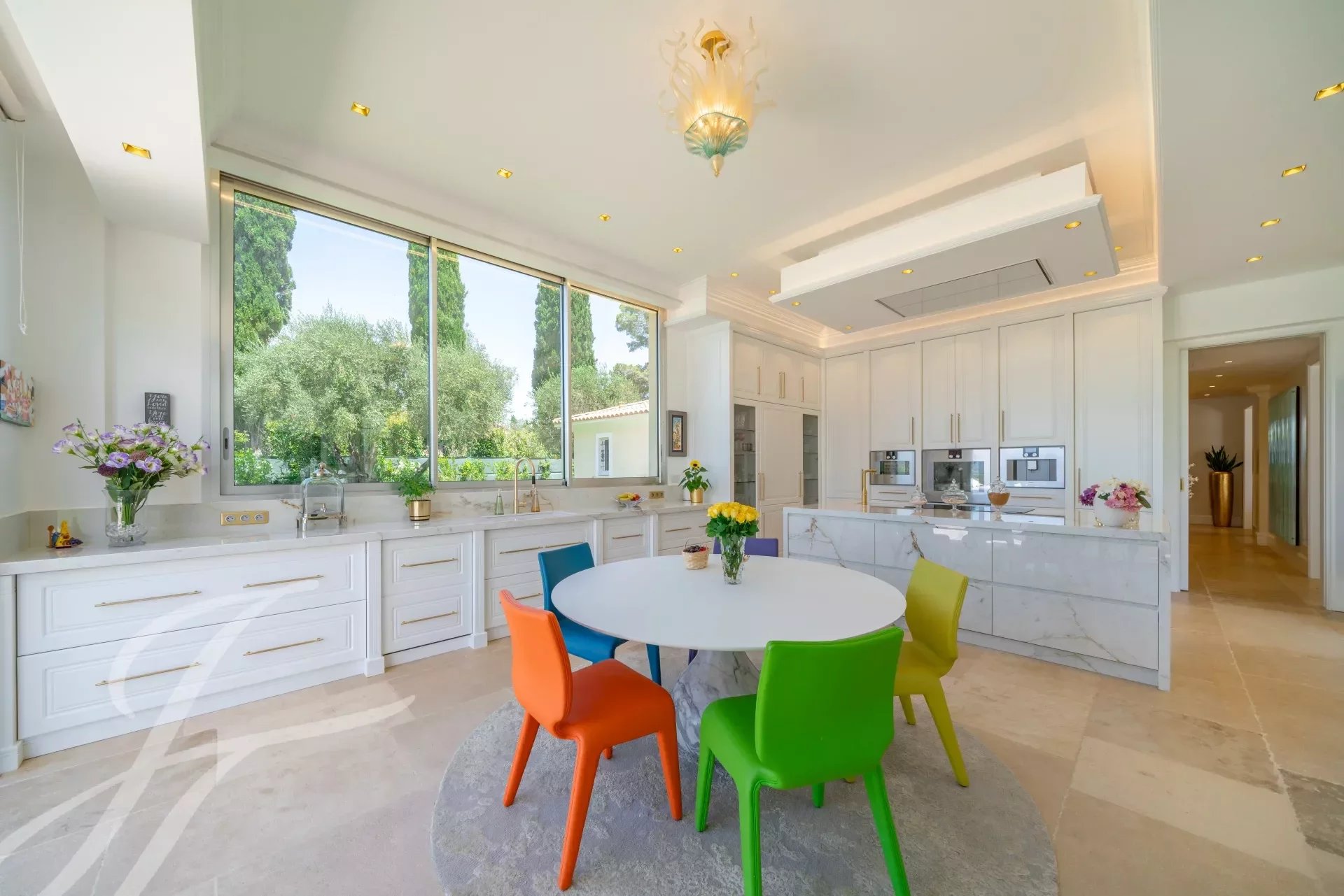 Der Haupteingang verfügt über handgefertigte Doppeltüren aus massiver Eiche, die sich zu einer prächtigen Eingangshalle öffnen, welche durch eine 6 Meter hohe Calacatta-Marmorwand akzentuiert wird. Der weitläufige, 110 m2 große Wohn- und Essbereich ist nach Westen ausgerichtet und bietet einen grandiosen 270-Grad-Panoramablick auf die Hügel und Berge der Alpes Maritimes.