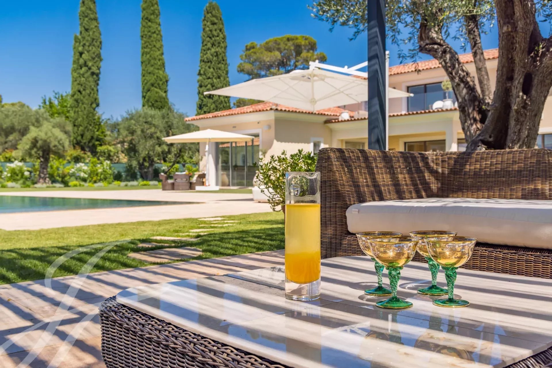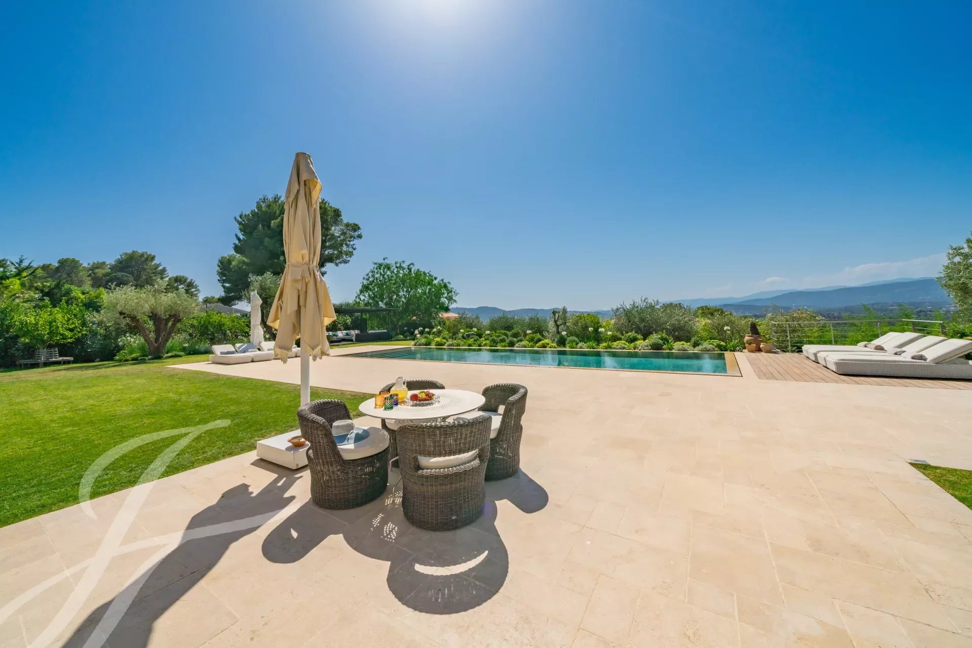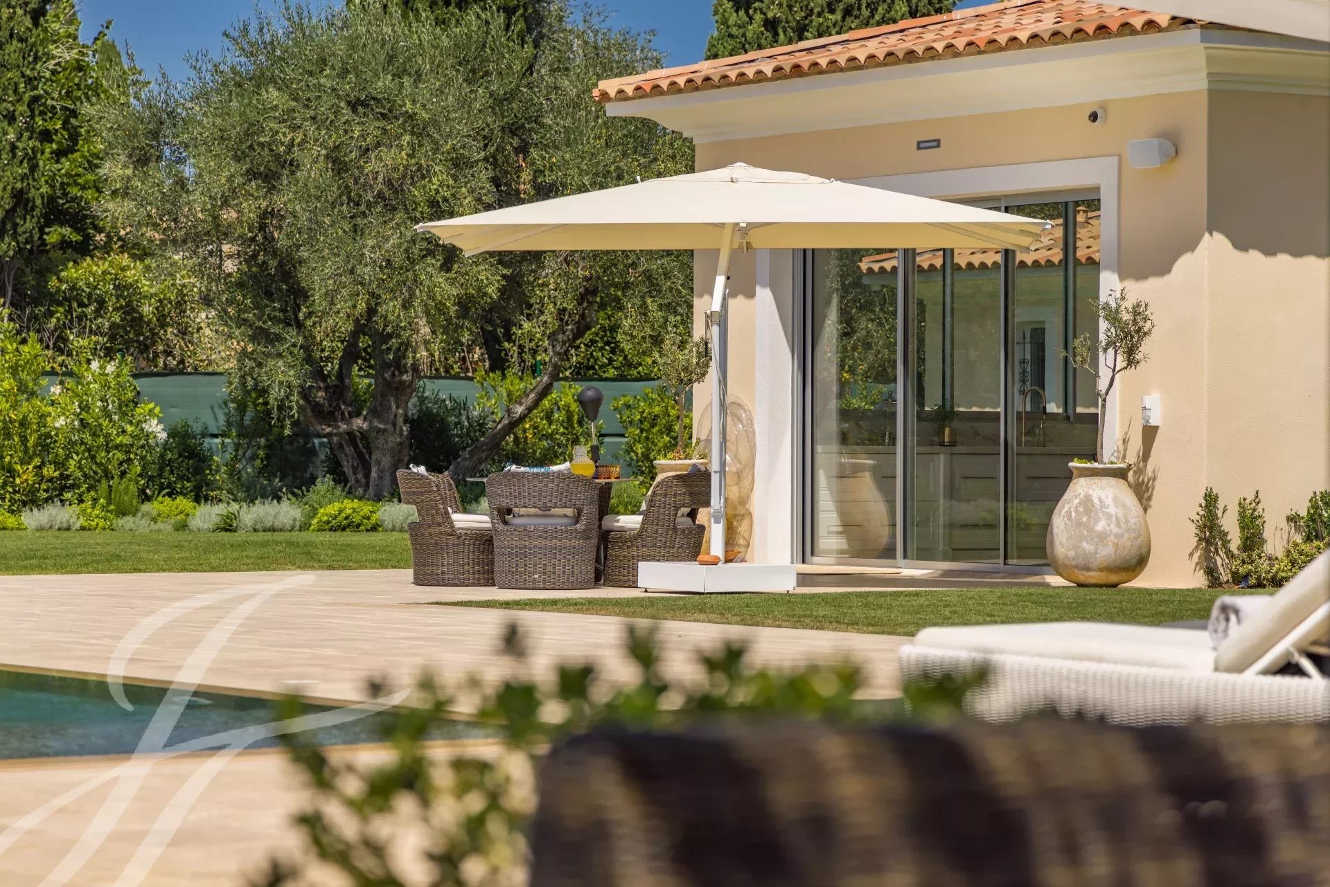 Eine prächtige provenzalische Bastide mit ultra-moderner Innenausstattung, die nach den höchsten Standards gebaut wurde, in dem sehr gefragten Wohnviertel von Mougins. Cannes (19 Minuten), Monaco (58 Minuten), internationaler Flughafen Nizza (27 Minuten), Flughafen Cannes Mandelieu (15 Minuten).