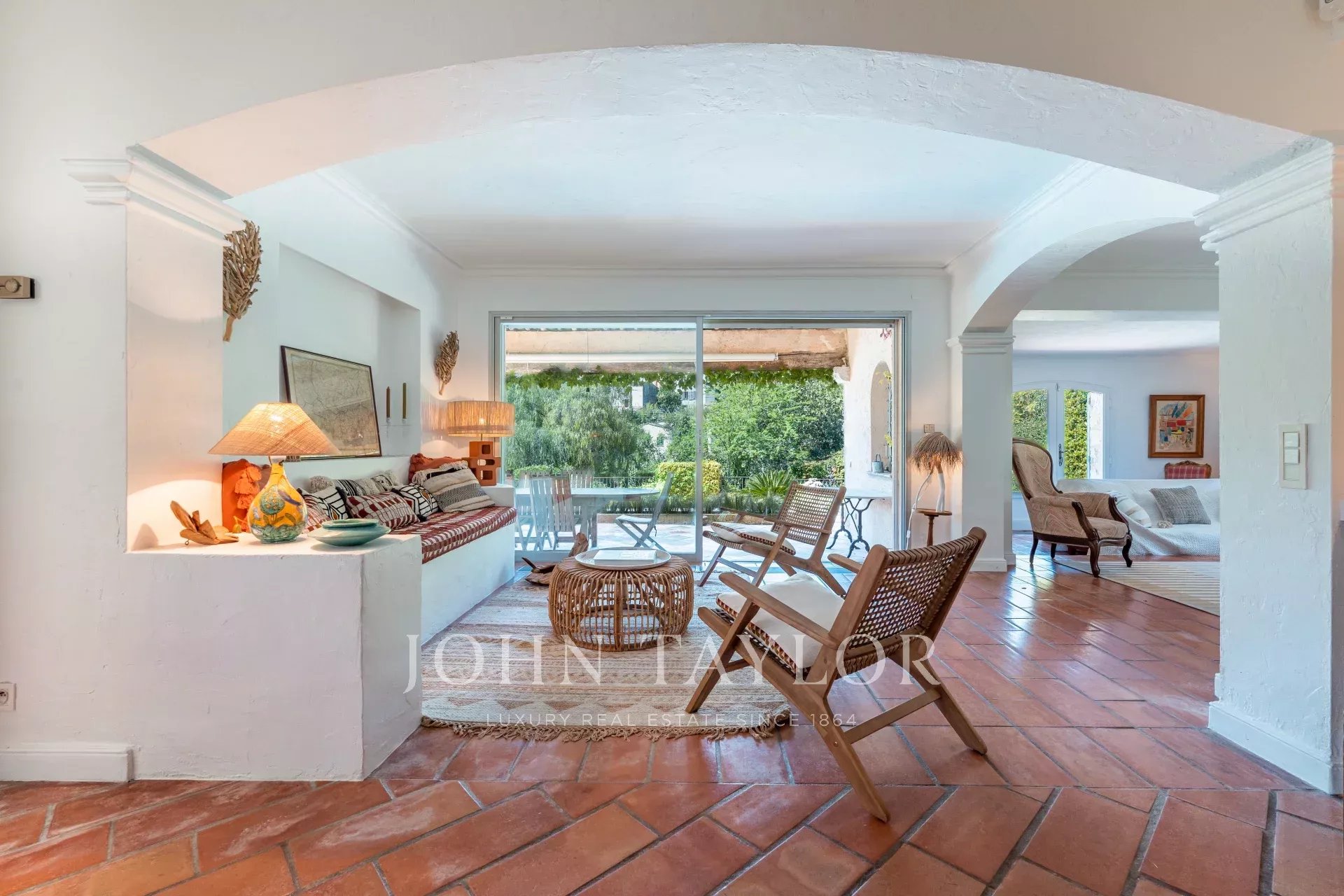 Das lichtdurchflutete Doppelwohnzimmer mit Kamin aus behauenem Stein öffnet sich zu einer nach Süden ausgerichteten Terrasse.