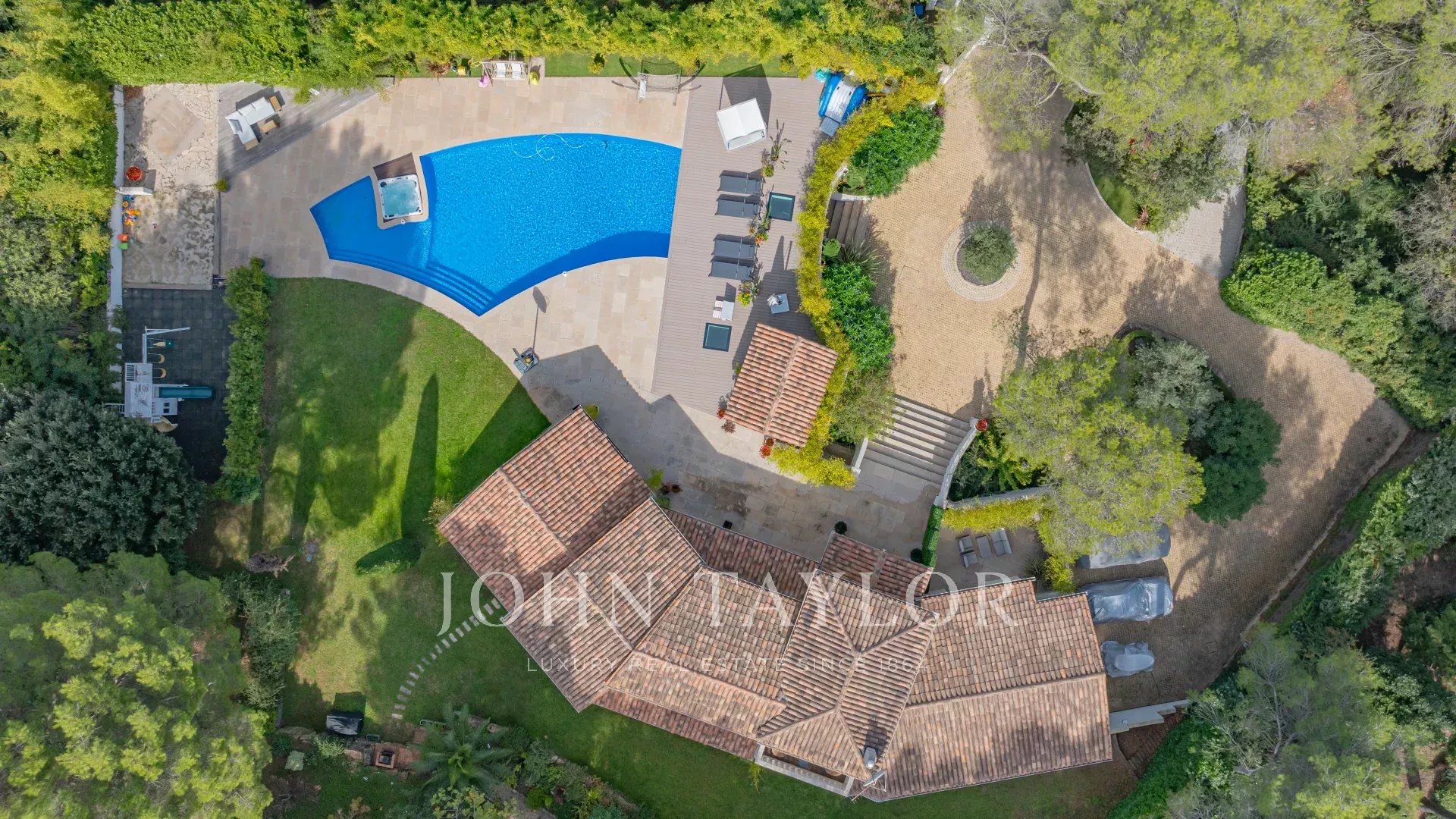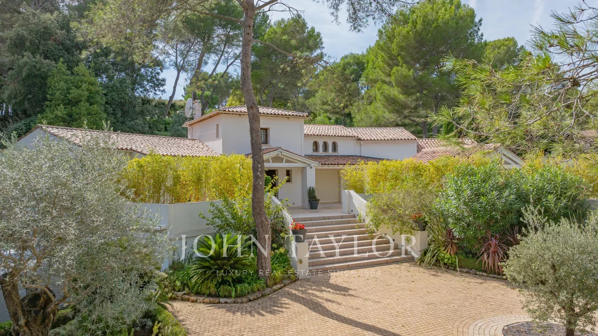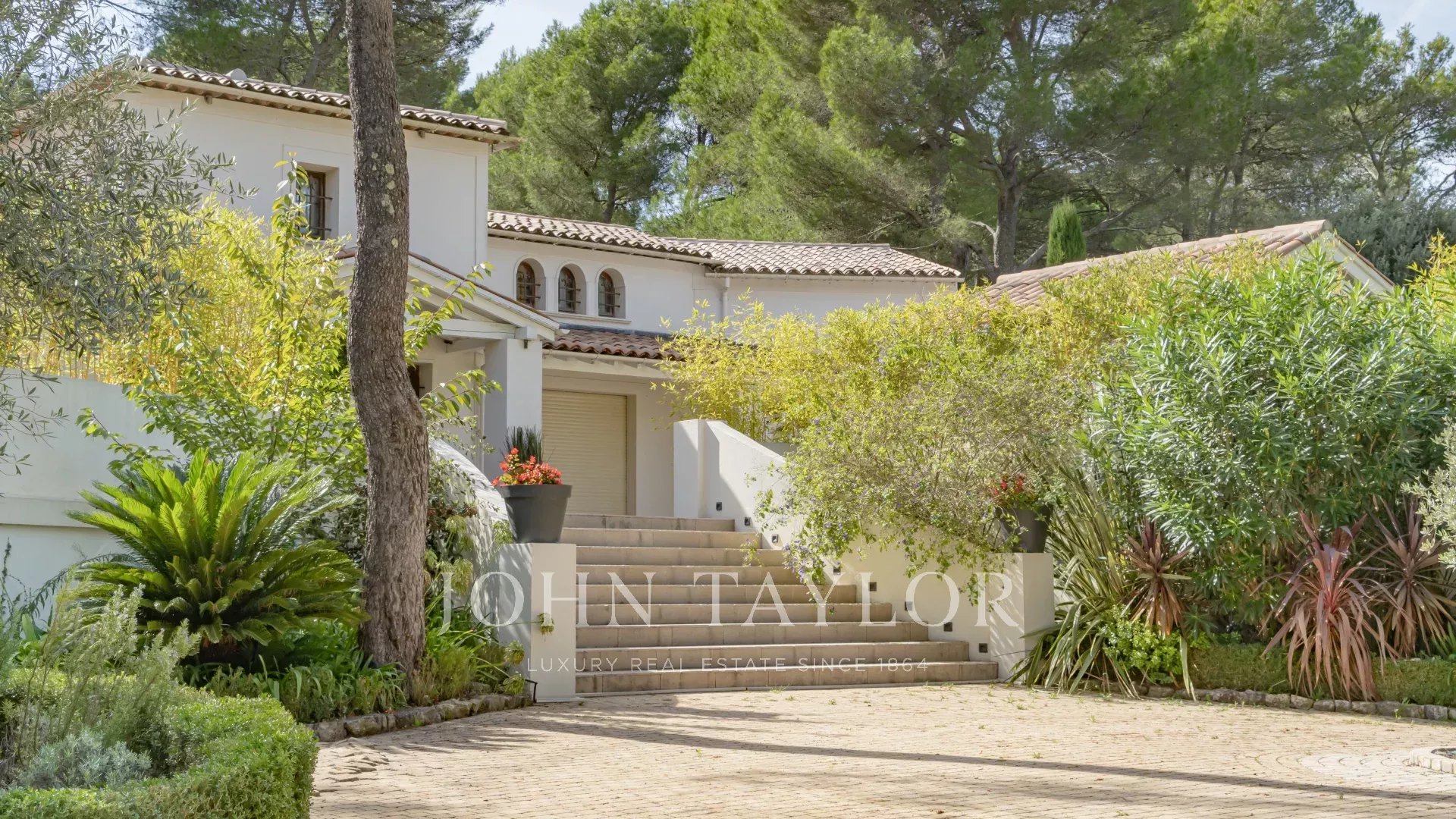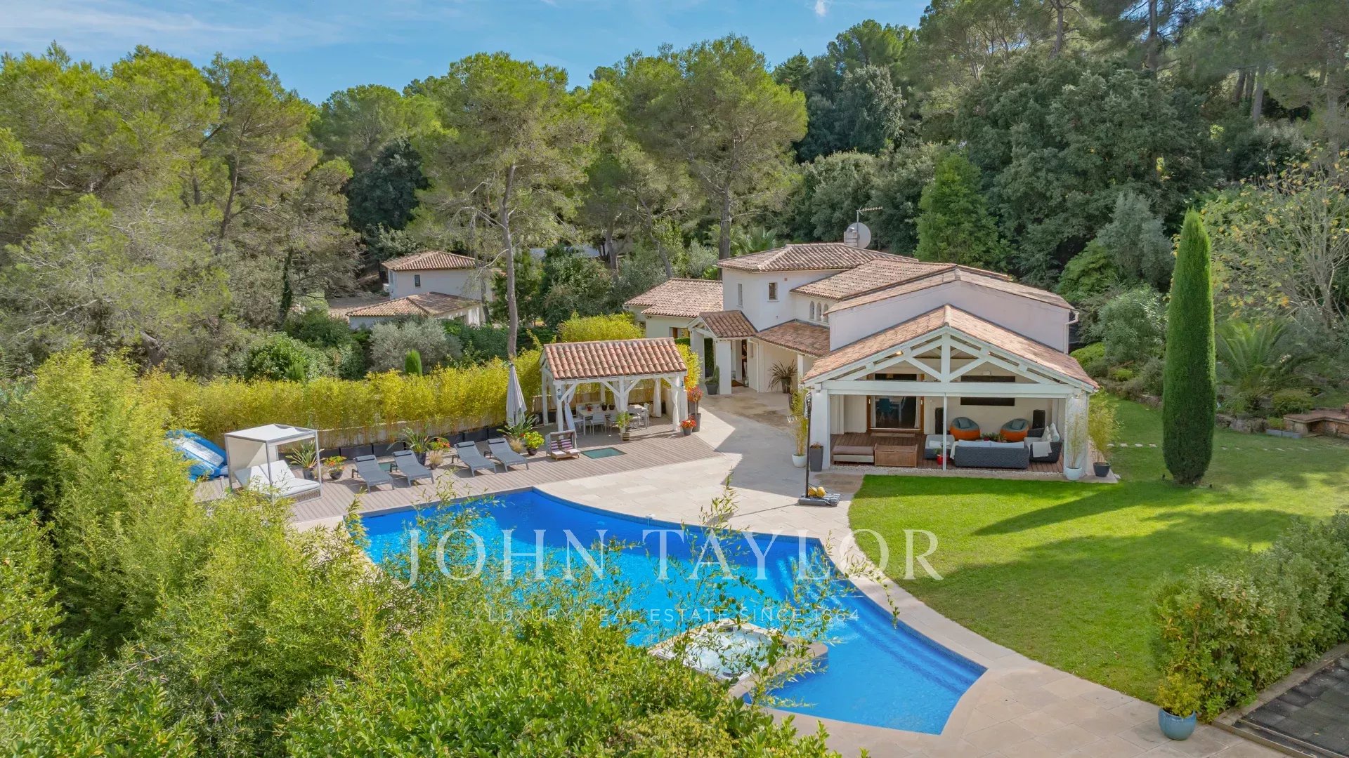 In der geschlossenen und gesicherten Domaine des Parcs de Mougins liegt diese komplett renovierte Villa von 362 m2 auf einem ca. 3200 m2 großen Landschaftsgarten mit Pool und Jacuzzi.