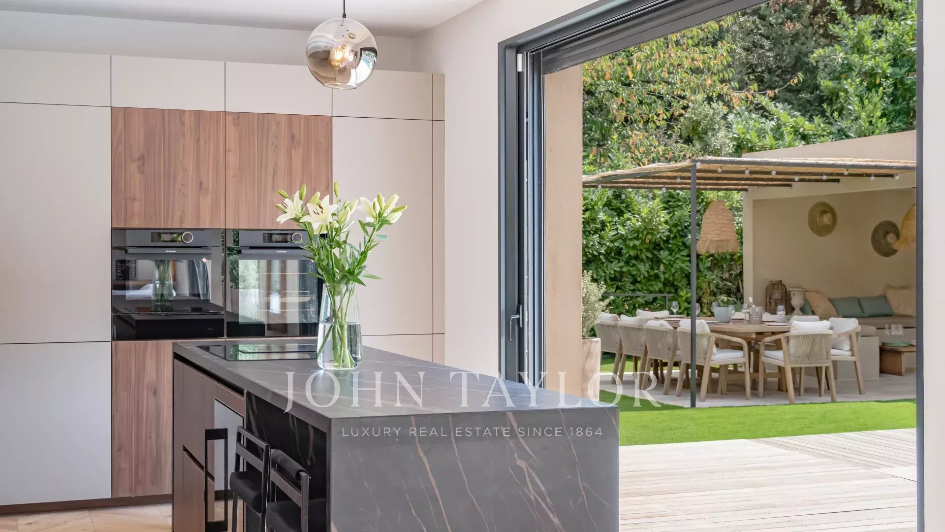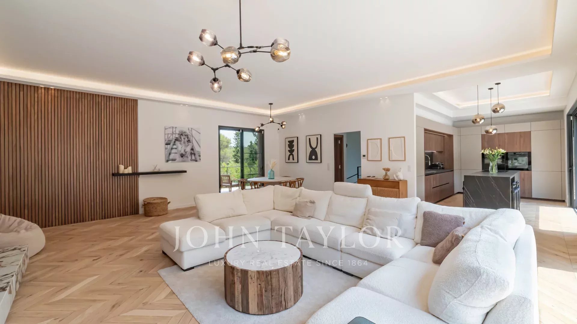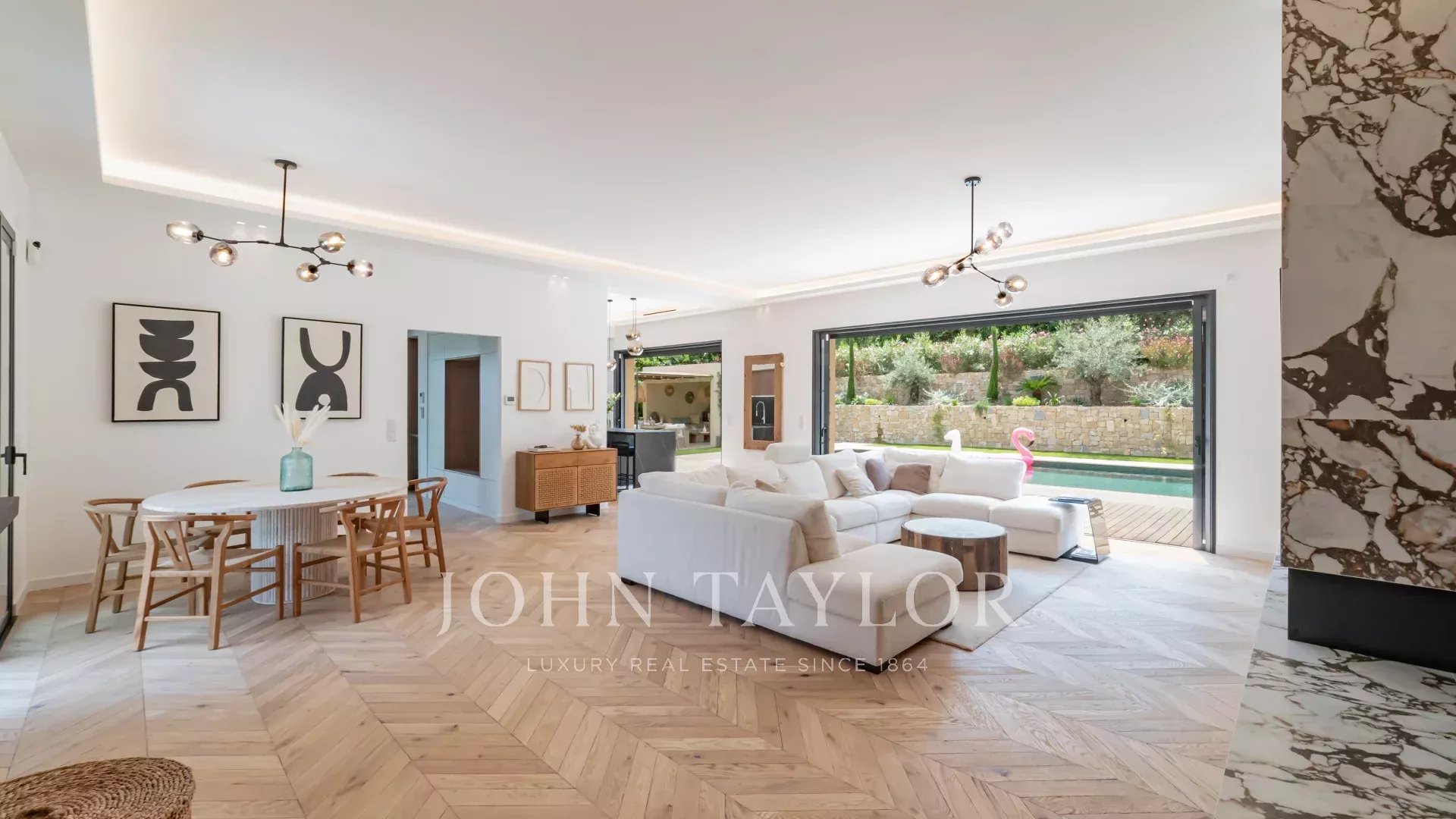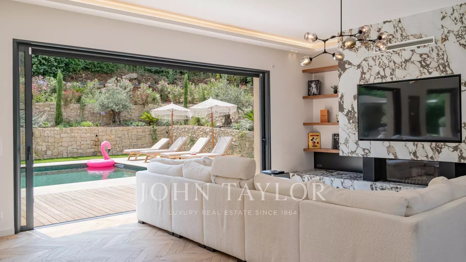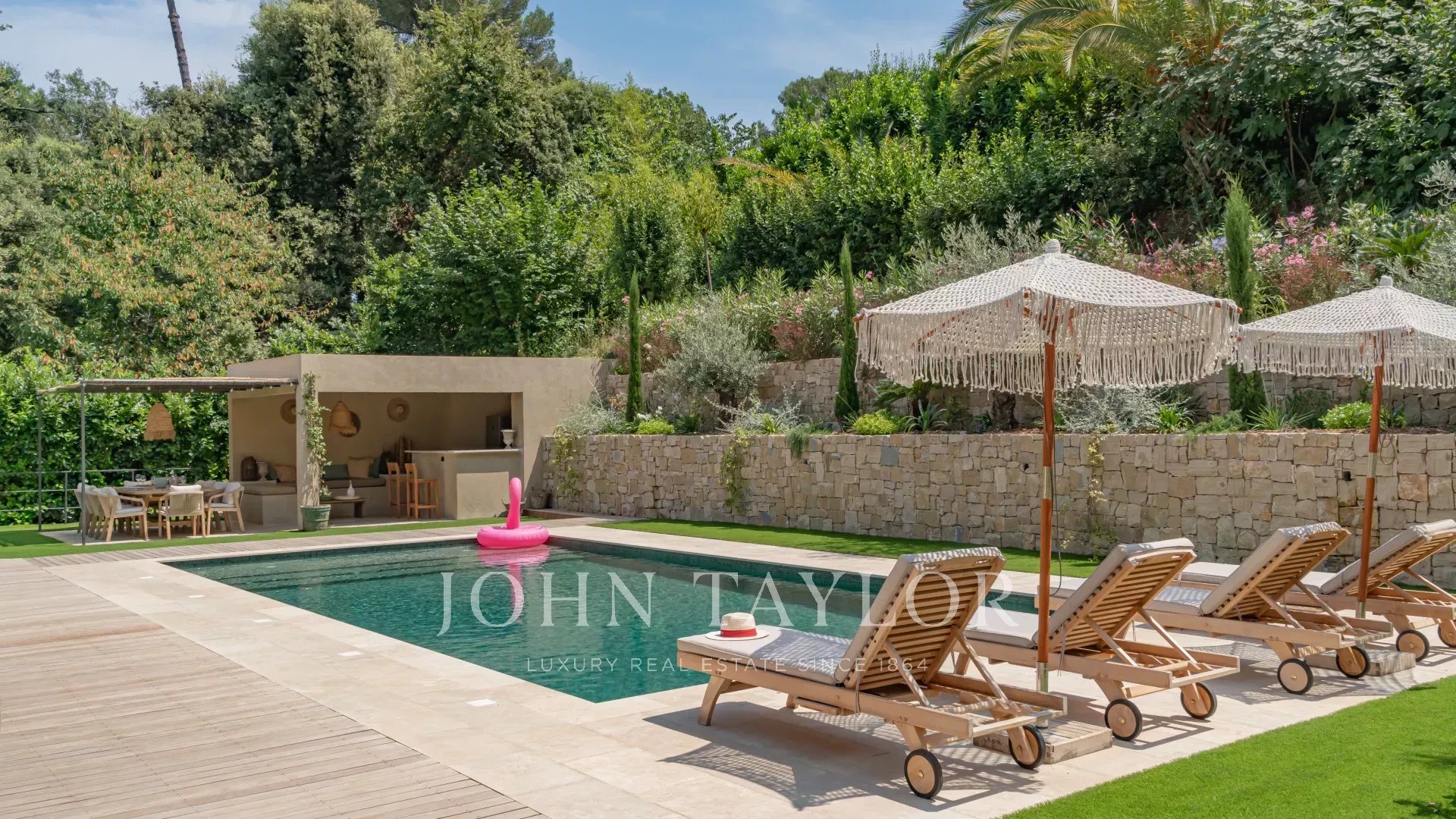 VERKAUFT: Eingebettet im Herzen eines begehrten Anwesens in Mougins liegt diese wunderschöne Villa, die komplett mit hochwertigen Materialien renoviert wurde, auf einem angelegten Garten, der absolute Ruhe bietet. Die Villa umfasst einen schönen Eingangsbereich, ein großes, helles Wohnzimmer mit Südausrichtung, eine amerikanische Küche, vier Schlafzimmer, darunter eine wunderschöne, ebenerdige Master-Suite mit eigenem Duschbad und Ankleidezimmer. Die hellen und geräumigen Wohnbereiche öffnen sich zu einem angelegten Garten und einem wunderschönen Pool, der zum Entspannen einlädt. Eine Sommerküche, die ideal für Empfänge im Freien ist, sowie eine Garage vervollständigen das Anwesen. Diese Villa befindet sich in einer ruhigen und sicheren Umgebung, in der Nähe der Mougins School und des Golfplatzes Cannes-Mougins.