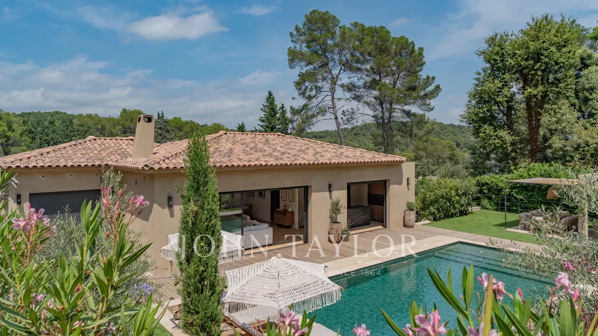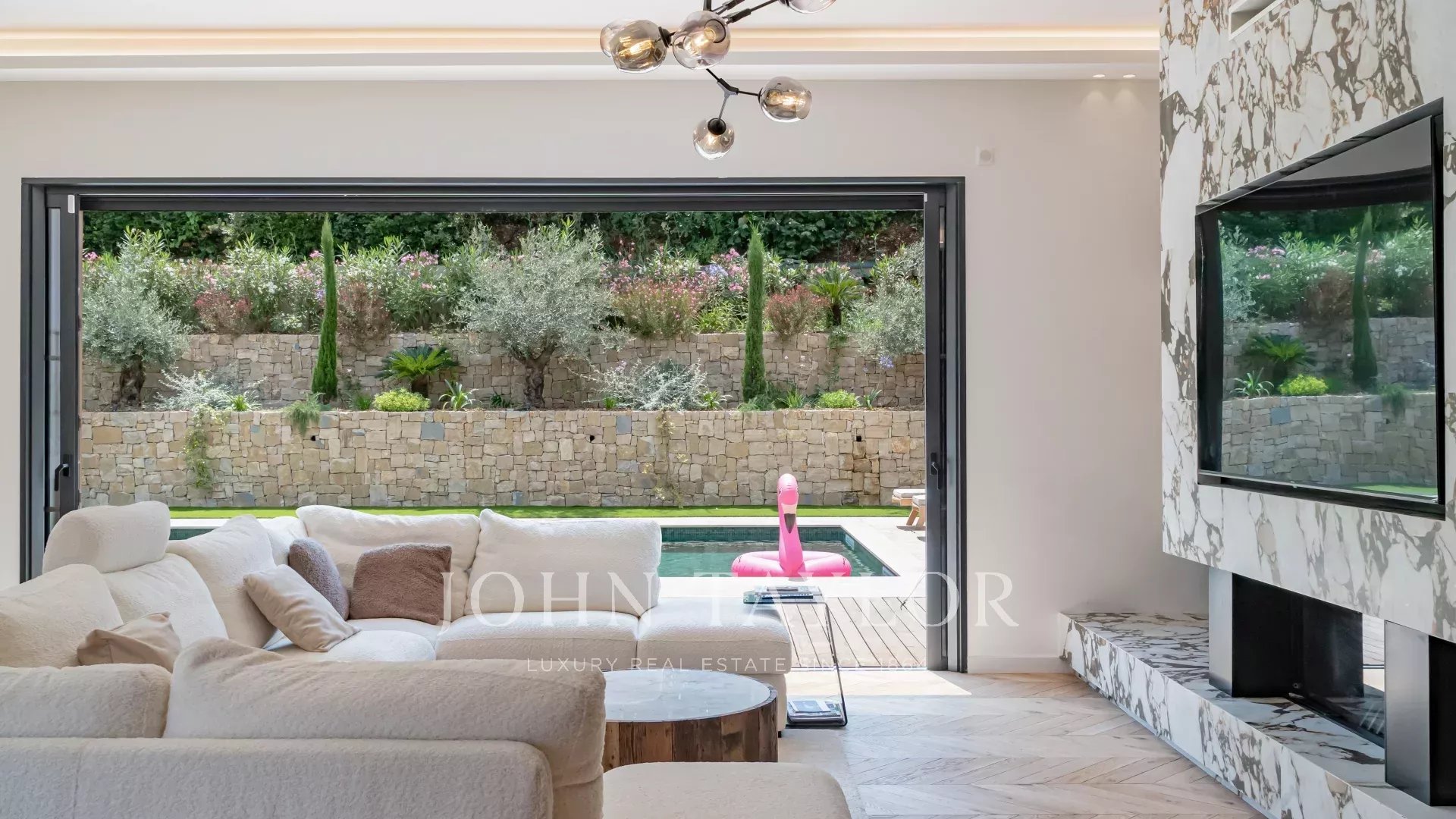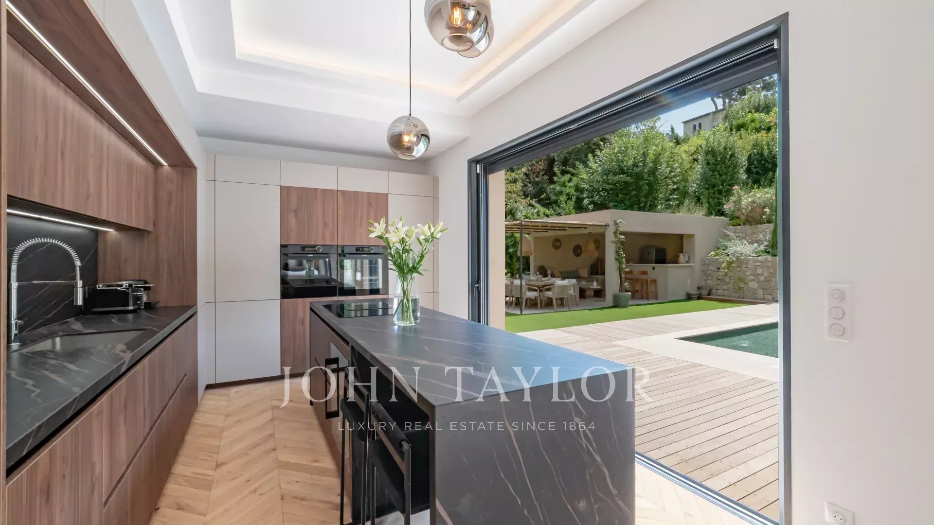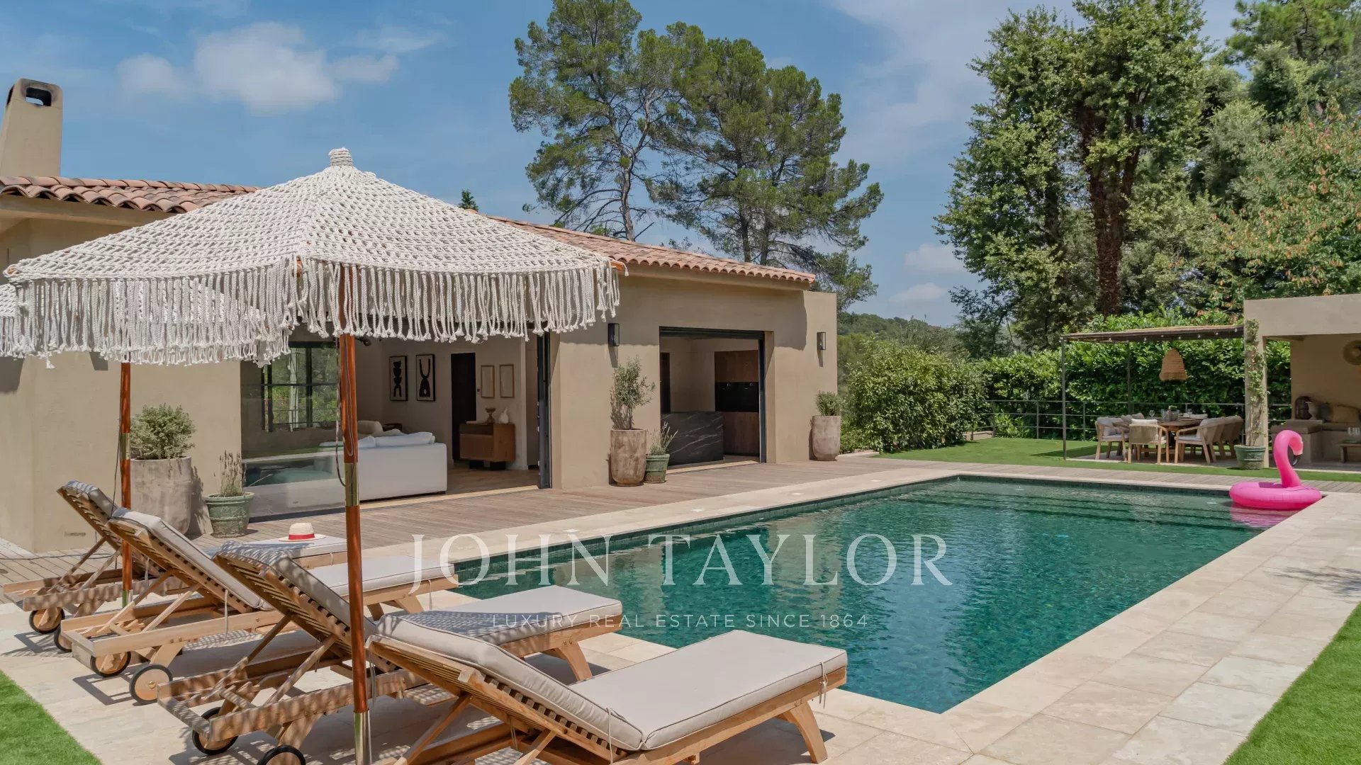VERKAUFT: Eingebettet im Herzen eines begehrten Anwesens in Mougins liegt diese wunderschöne Villa, die komplett mit hochwertigen Materialien renoviert wurde, auf einem angelegten Garten, der absolute Ruhe bietet. Die Villa umfasst einen schönen Eingangsbereich, ein großes, helles Wohnzimmer mit Südausrichtung, eine amerikanische Küche, vier Schlafzimmer, darunter eine wunderschöne, ebenerdige Master-Suite mit eigenem Duschbad und Ankleidezimmer. Die hellen und geräumigen Wohnbereiche öffnen sich zu einem angelegten Garten und einem wunderschönen Pool, der zum Entspannen einlädt. Eine Sommerküche, die ideal für Empfänge im Freien ist, sowie eine Garage vervollständigen das Anwesen. Diese Villa befindet sich in einer ruhigen und sicheren Umgebung, in der Nähe der Mougins School und des Golfplatzes Cannes-Mougins.