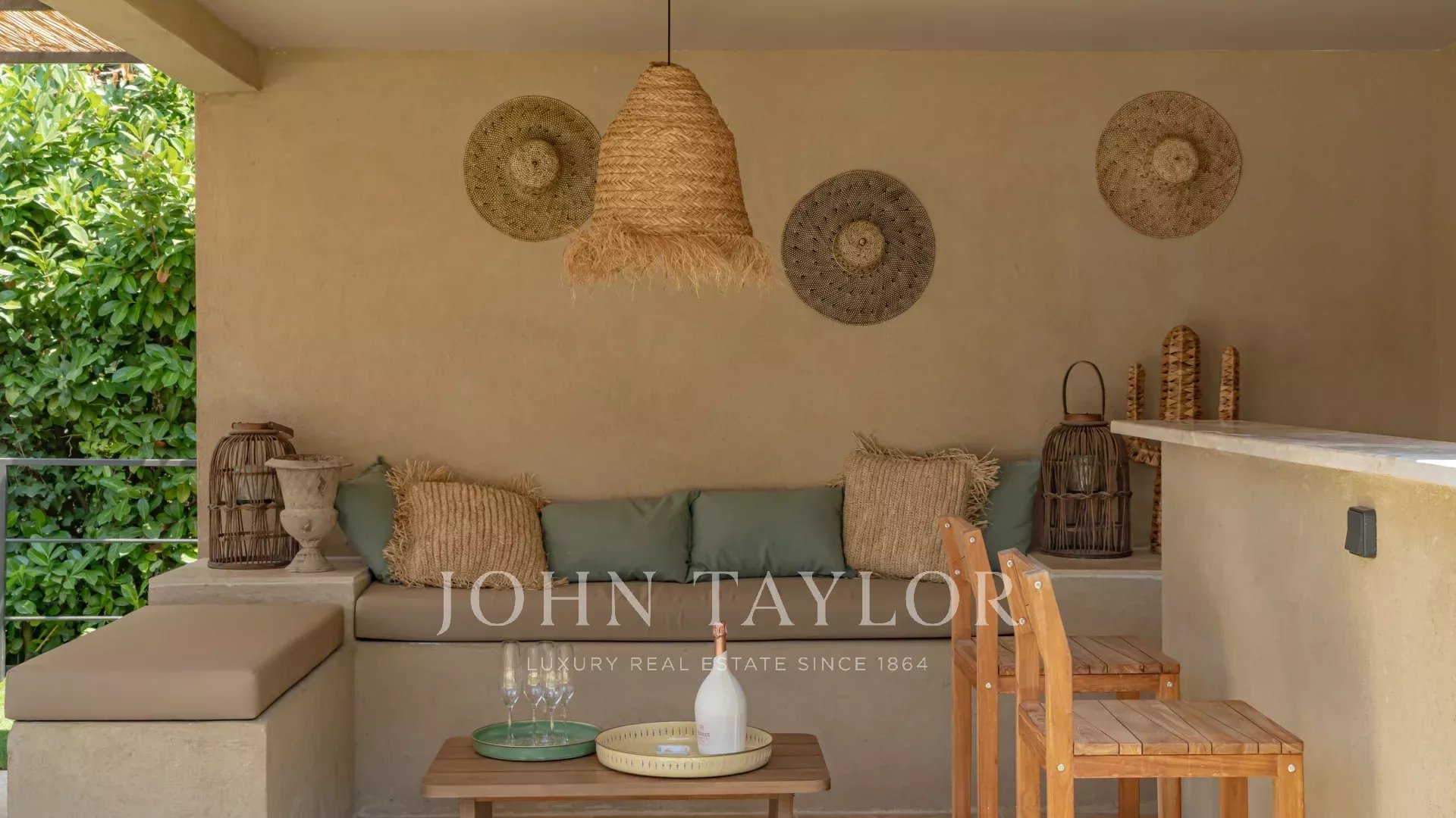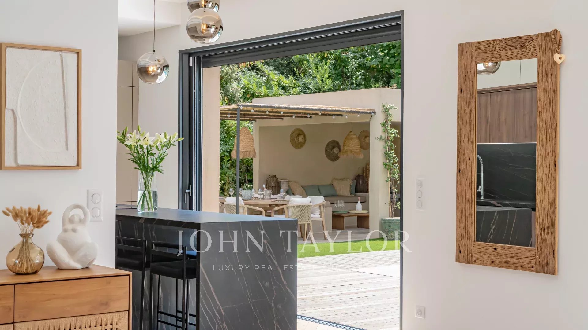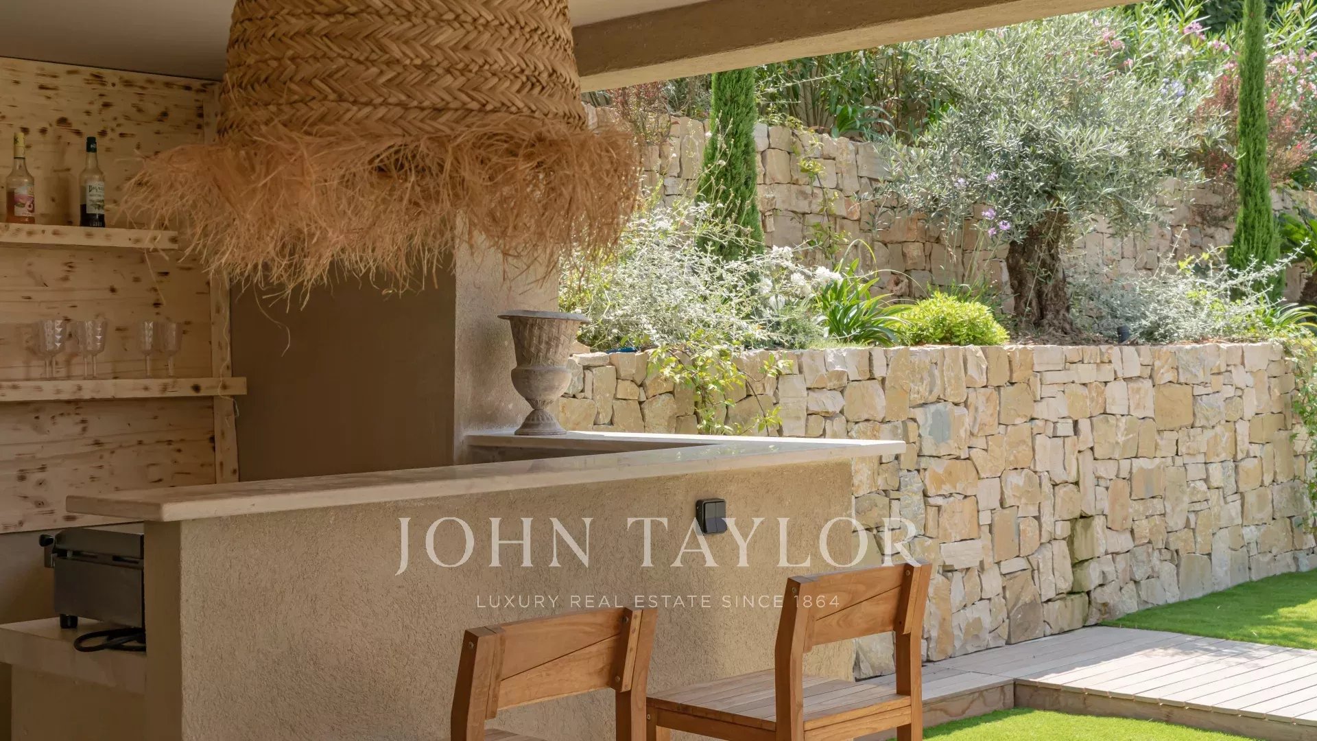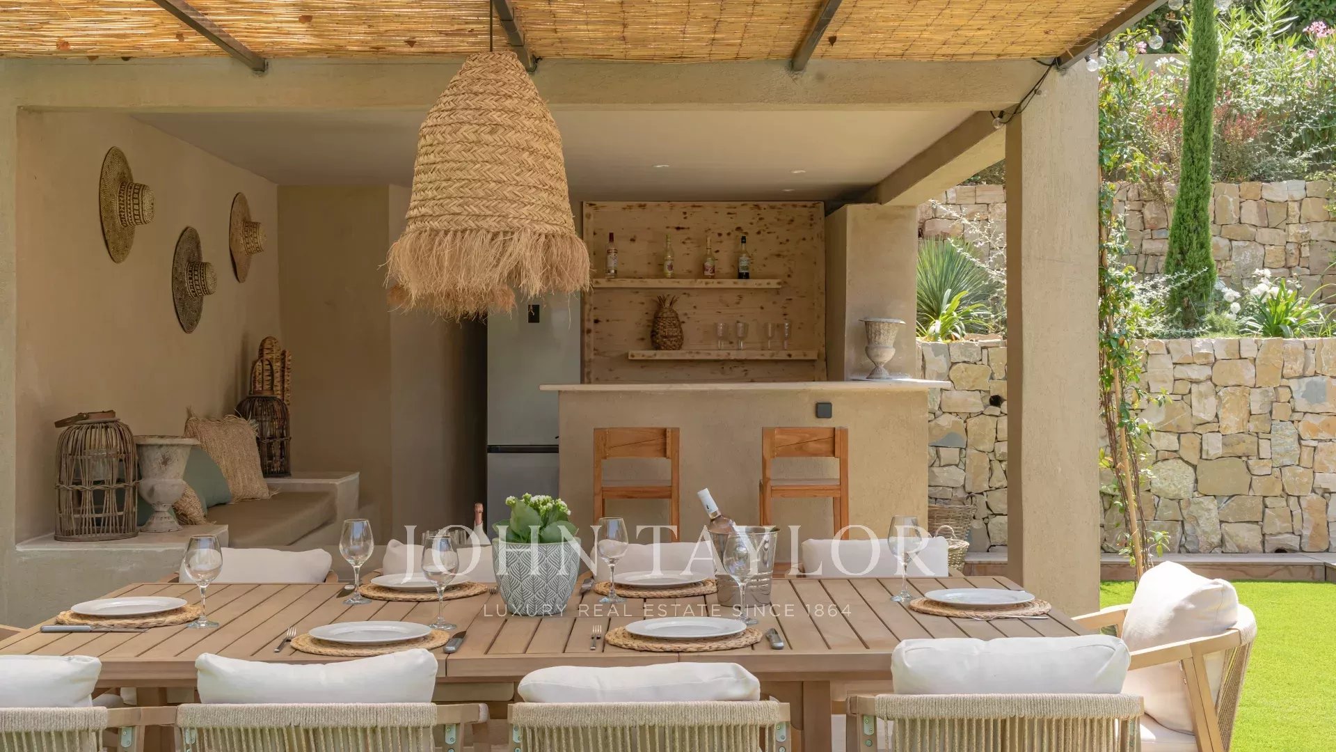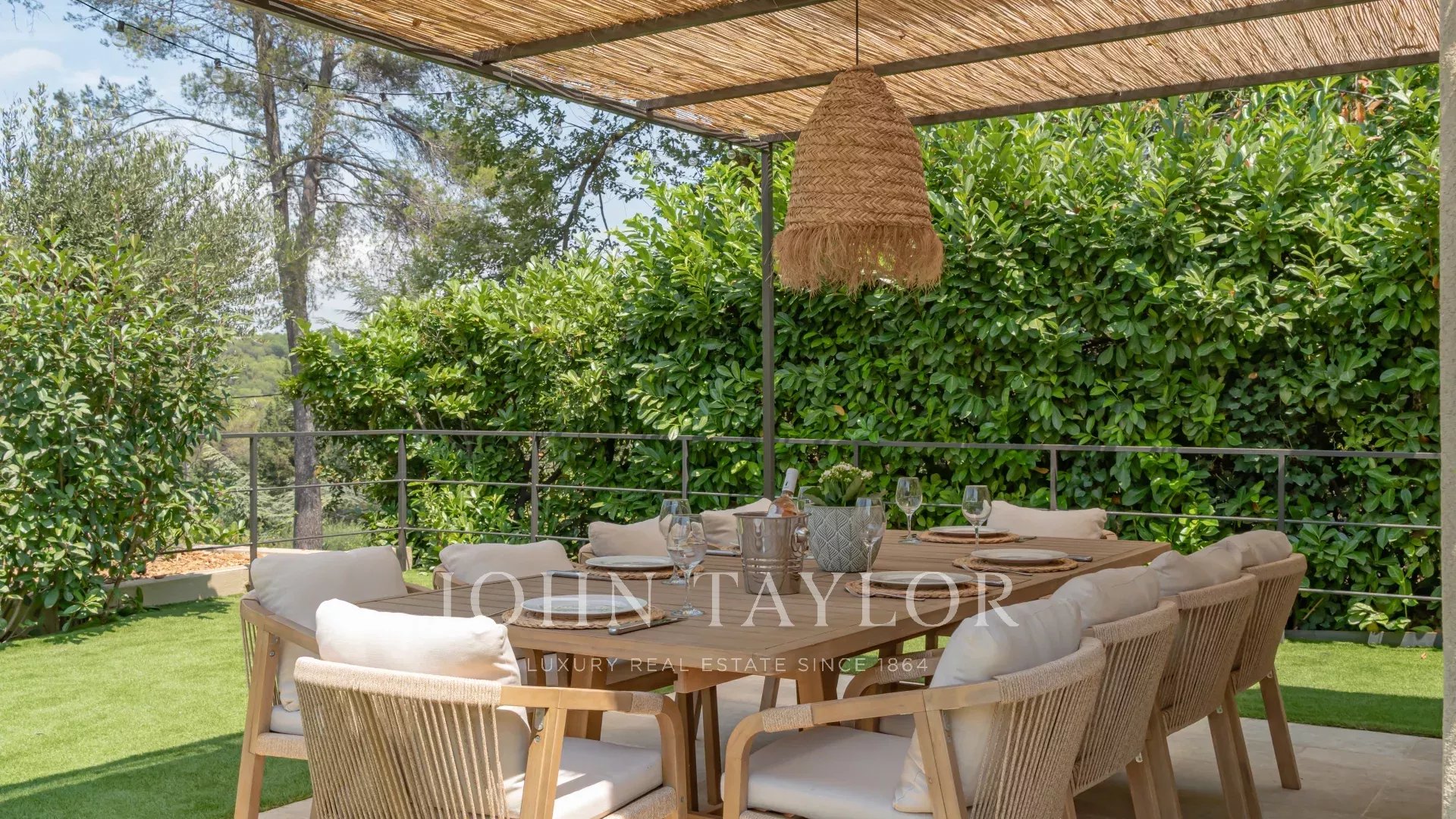 VERKAUFT: Eingebettet im Herzen eines begehrten Anwesens in Mougins liegt diese wunderschöne Villa, die komplett mit hochwertigen Materialien renoviert wurde, auf einem angelegten Garten, der absolute Ruhe bietet. Die Villa umfasst einen schönen Eingangsbereich, ein großes, helles Wohnzimmer mit Südausrichtung, eine amerikanische Küche, vier Schlafzimmer, darunter eine wunderschöne, ebenerdige Master-Suite mit eigenem Duschbad und Ankleidezimmer. Die hellen und geräumigen Wohnbereiche öffnen sich zu einem angelegten Garten und einem wunderschönen Pool, der zum Entspannen einlädt. Eine Sommerküche, die ideal für Empfänge im Freien ist, sowie eine Garage vervollständigen das Anwesen. Diese Villa befindet sich in einer ruhigen und sicheren Umgebung, in der Nähe der Mougins School und des Golfplatzes Cannes-Mougins.