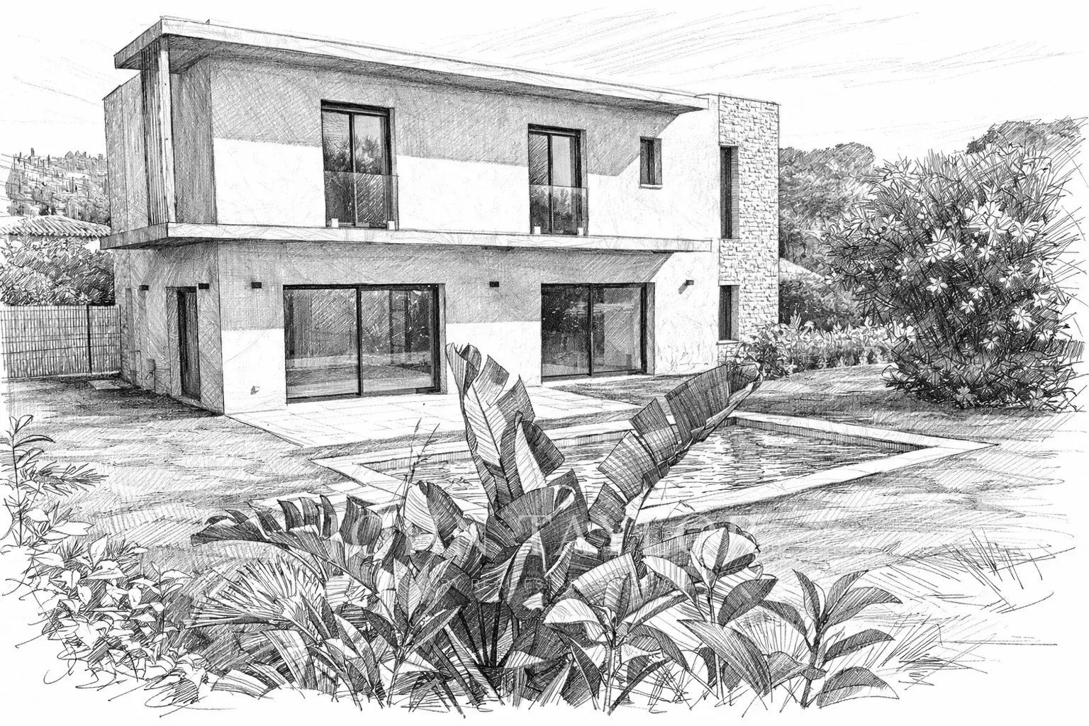 Neue kalifornische Villa von ca. 155 m² mit Aufzug, erbaut auf einem flachen Grundstück von 1.133 m², in absolut ruhiger Lage am Ende einer Sackgasse, aber dennoch in der Nähe der Hauptverkehrsachsen.