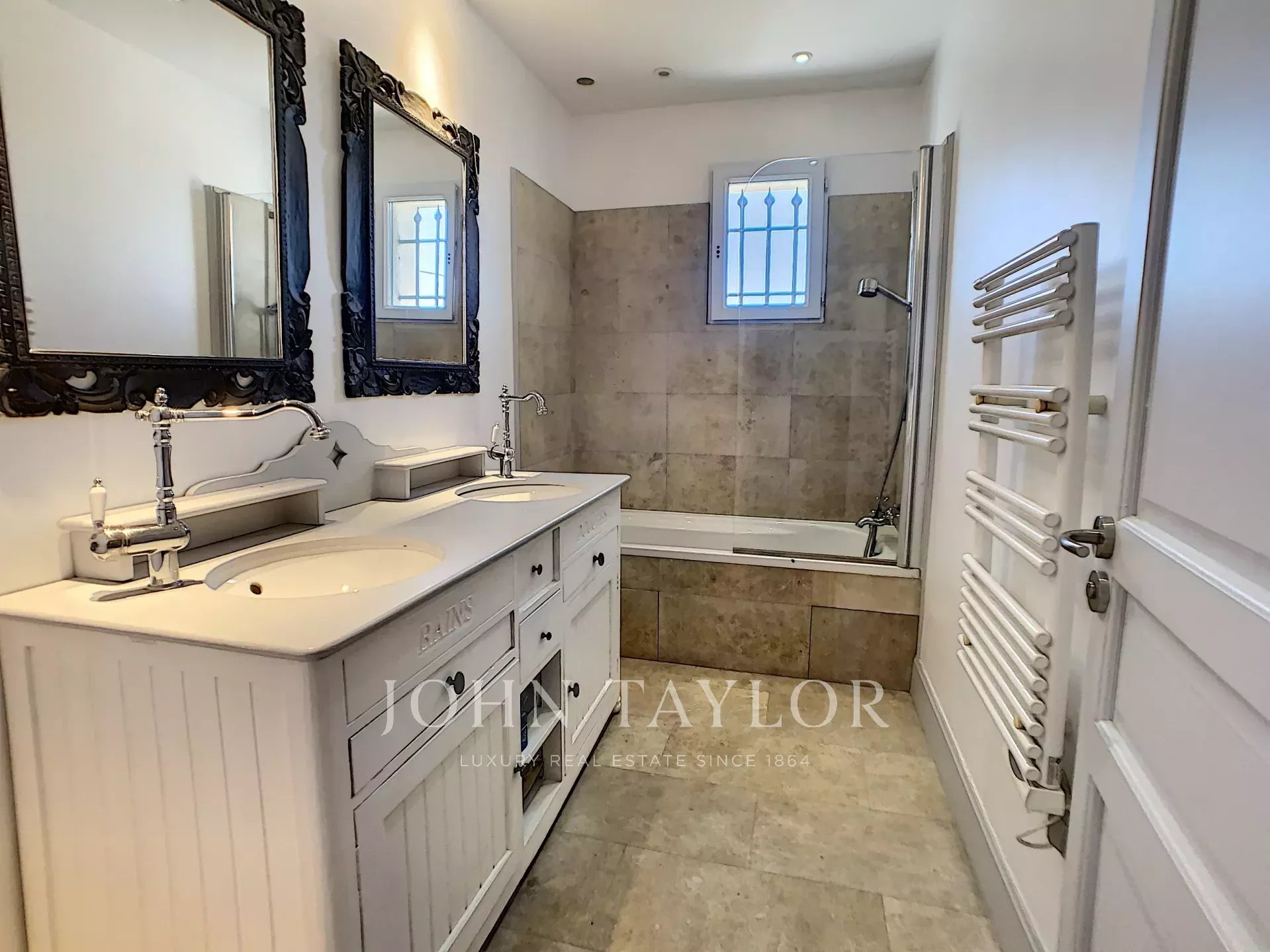 Im Obergeschoss entdecken Sie eine Elternsuite mit ihrer Tropezienner, ein zweites Schlafzimmer en suite sowie zwei weitere Schlafzimmer, die sich ein Badezimmer teilen.