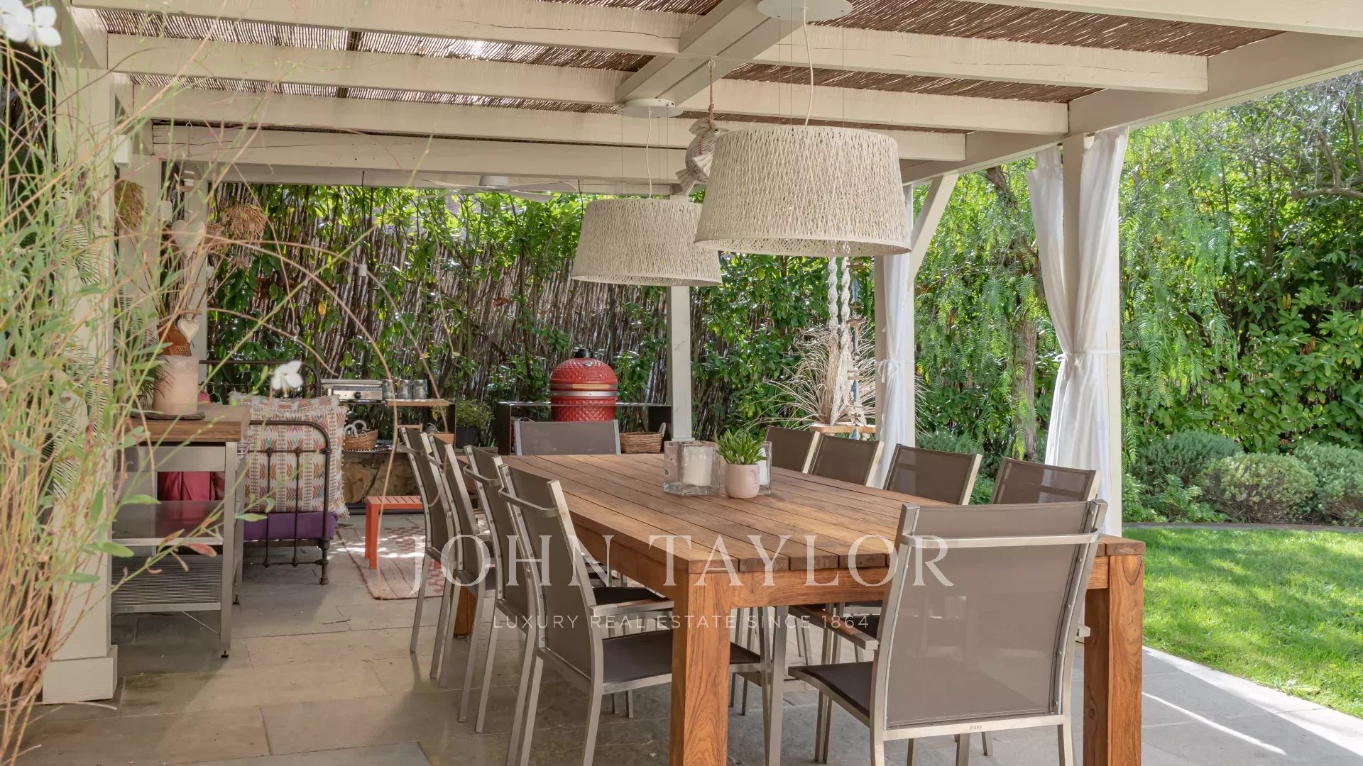 Ein erhabener Poolhausbereich mit Esstisch für mehr als 10 Personen, verlängert durch seine Sommerküche.