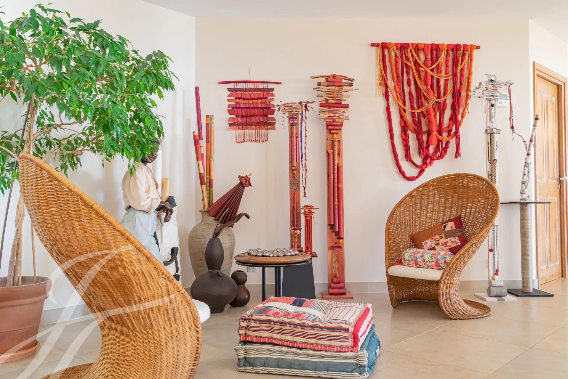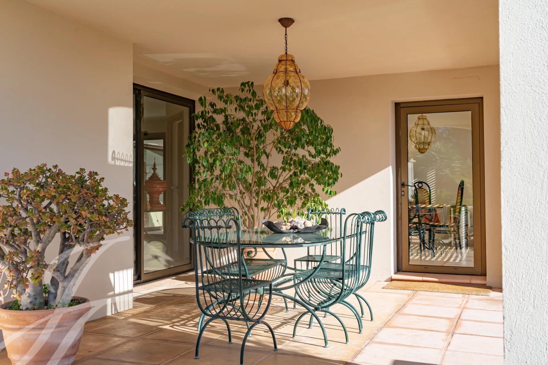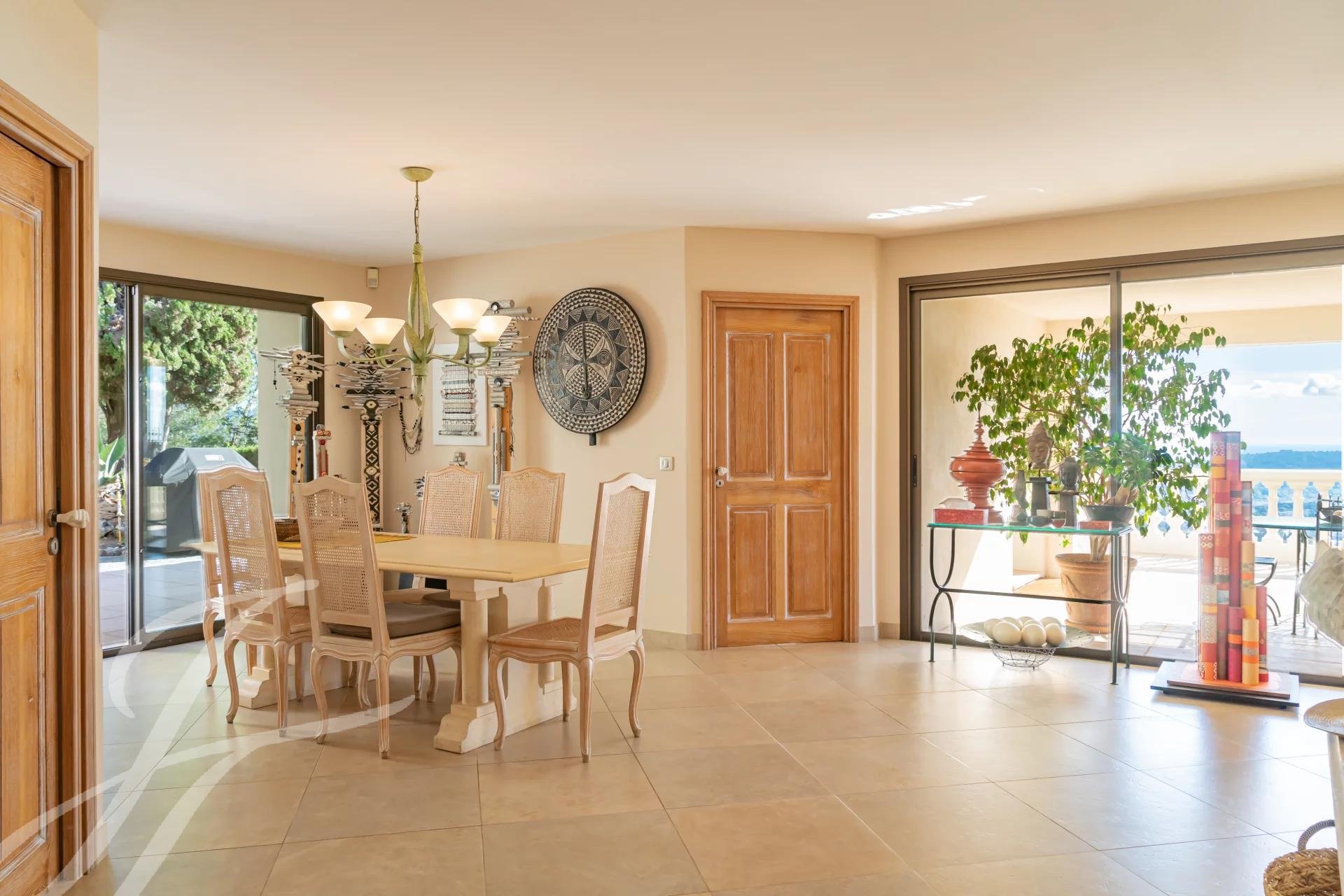 . ein großes, einladendes Wohn-/Esszimmer (ca. 105 m2), das von Licht und Sonne durchflutet wird, die sich durch die zahlreichen Fenster zum Außenbereich hin öffnet, der aus einer großen, runden, halb geschützten Terrasse besteht,