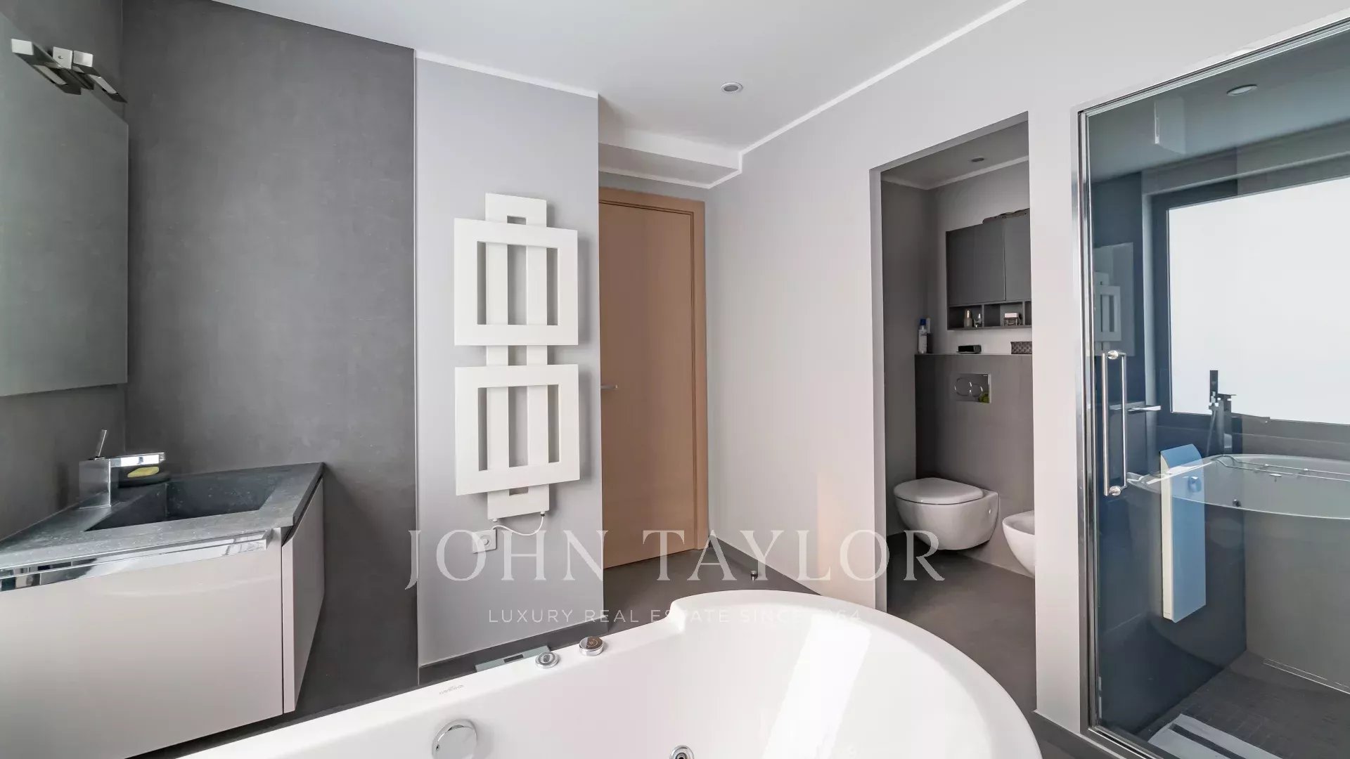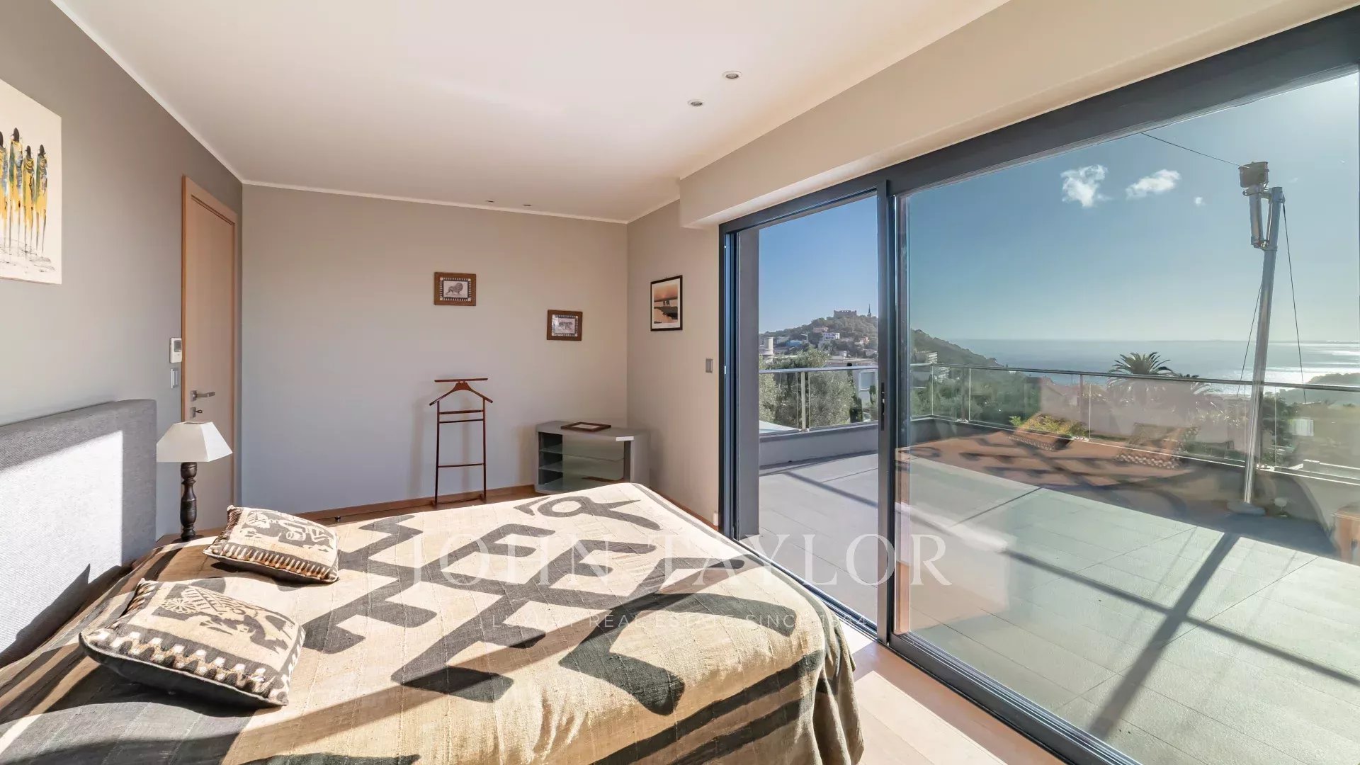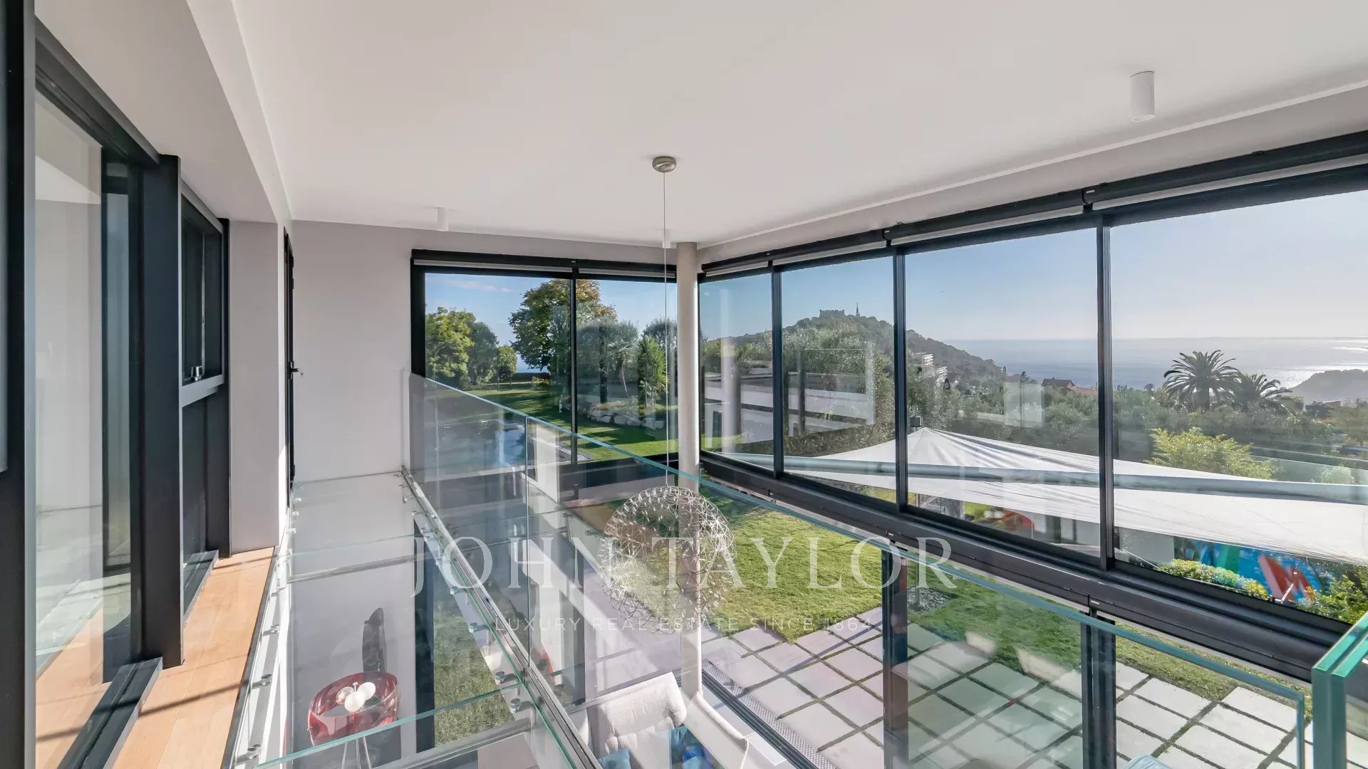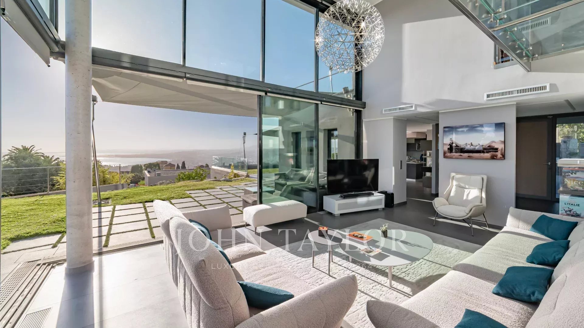 Alle Wohnräume haben einen Blick auf das Meer und die Berge und öffnen sich zu den großen Terrassen und dem Garten. Eine Glastreppe führt zu allen Stockwerken.