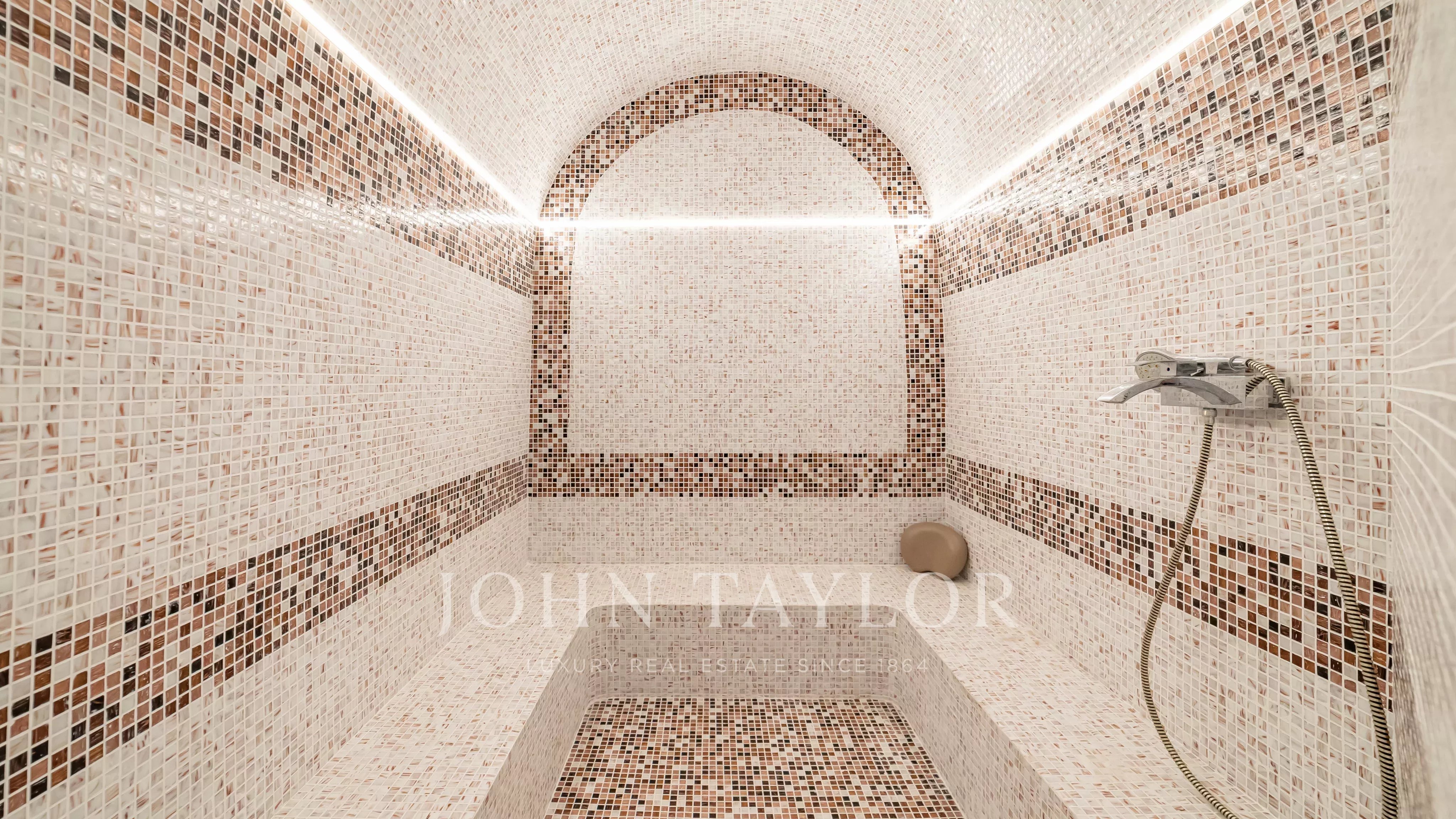 Das Gartengeschoss schließlich ist ganz dem Wohlbefinden und der Entspannung gewidmet, mit einem großen Wellnessbereich mit Jacuzzi, Fitnessraum, Massagebereich und Hammam. Ein großes Schlafzimmer mit Duschbad und direktem Zugang zum Garten vervollständigt diese Ebene.