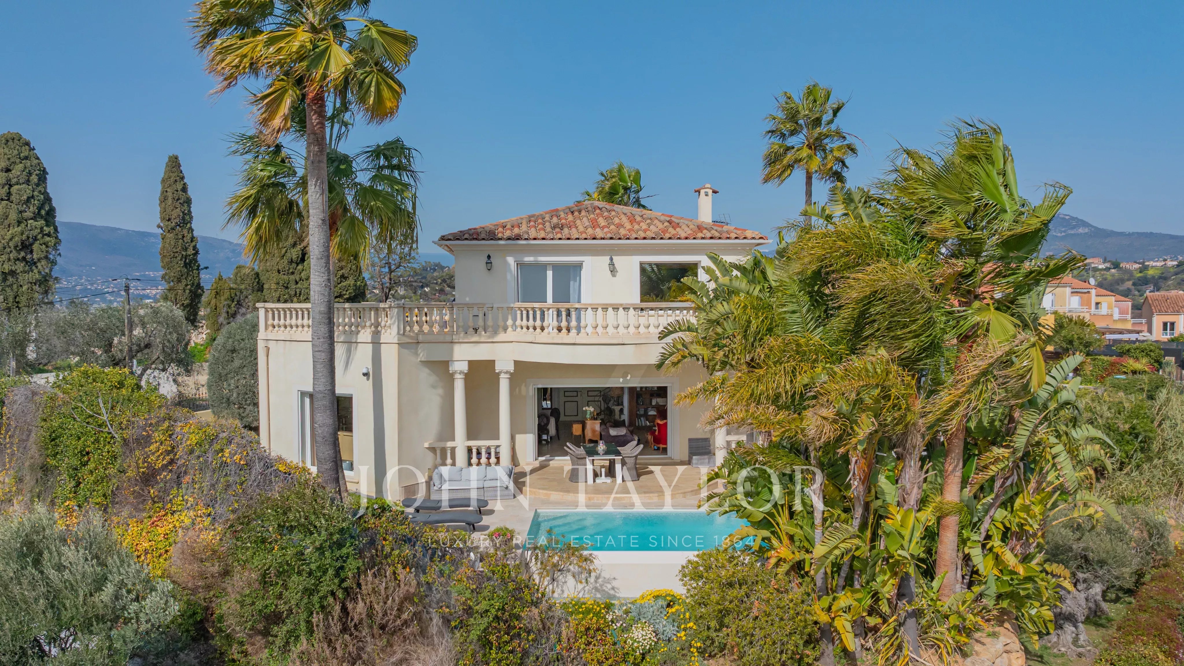 In den Höhen von Nizza, in einer gesuchten Wohn- und Familienumgebung, in absoluter Ruhe und in unmittelbarer Nähe der International School of Nice (ISN) und der Geschäfte, genießt diese 2013 erbaute zeitgenössische Villa einen freien Blick auf das Meer, die Stadt und die umliegenden Hügel, während sie nur wenige Minuten vom Flughafen Nizza Côte d'Azur entfernt ist.
