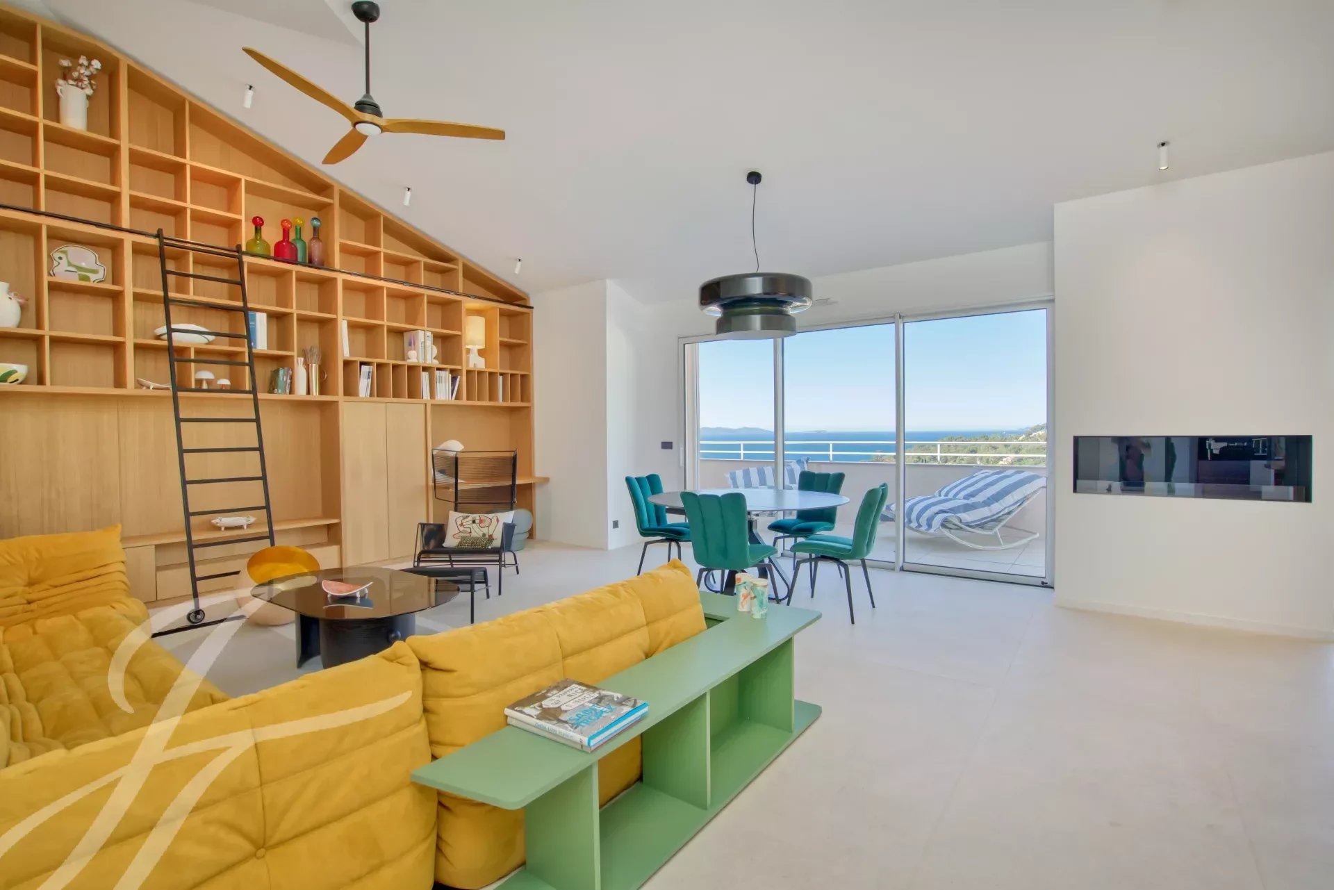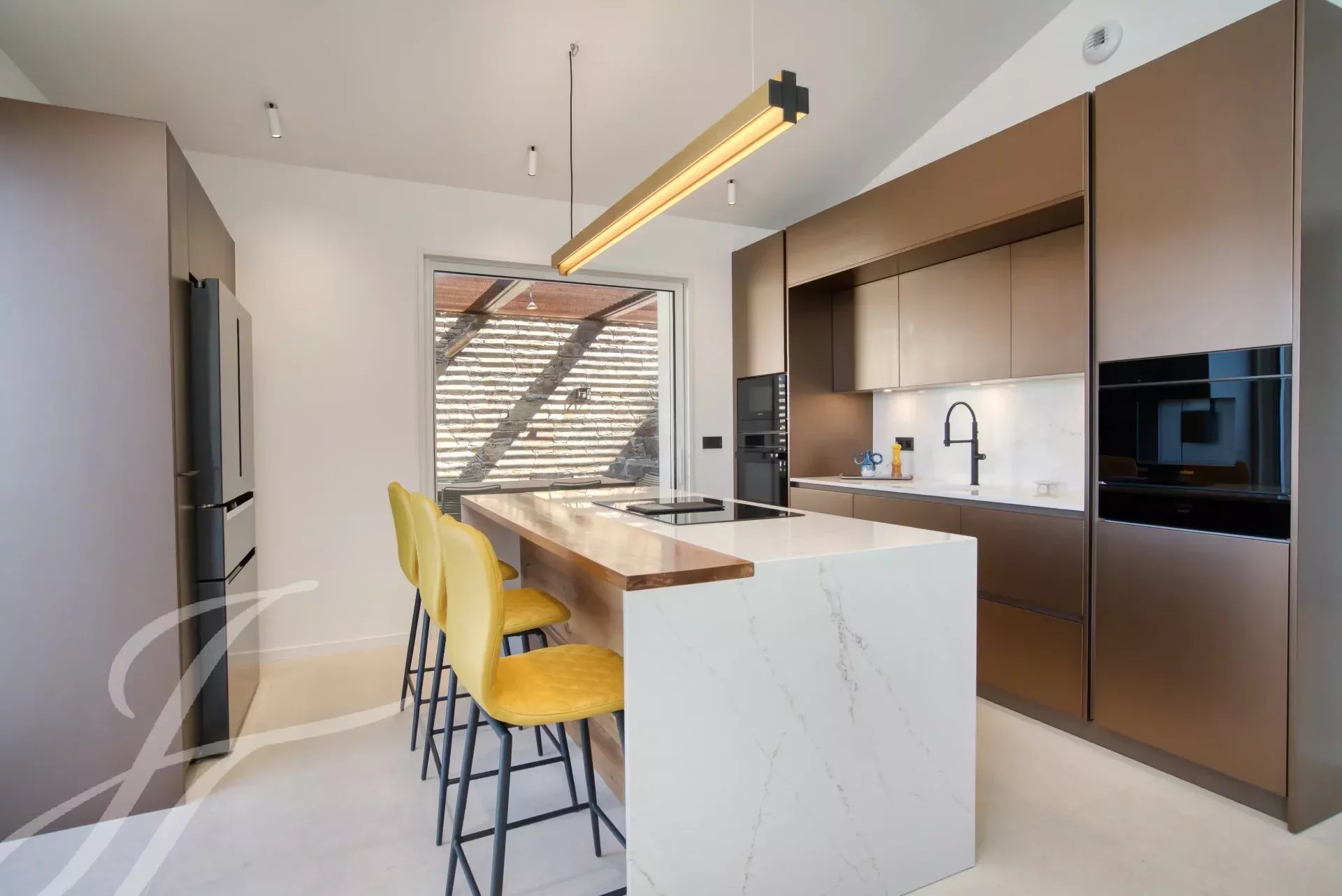 Die Hauptterrasse verfügt über eine elektrische Markise auf der gesamten Fassade, das Wohnzimmer ist mit einem Ethanol-Kamin ausgestattet.