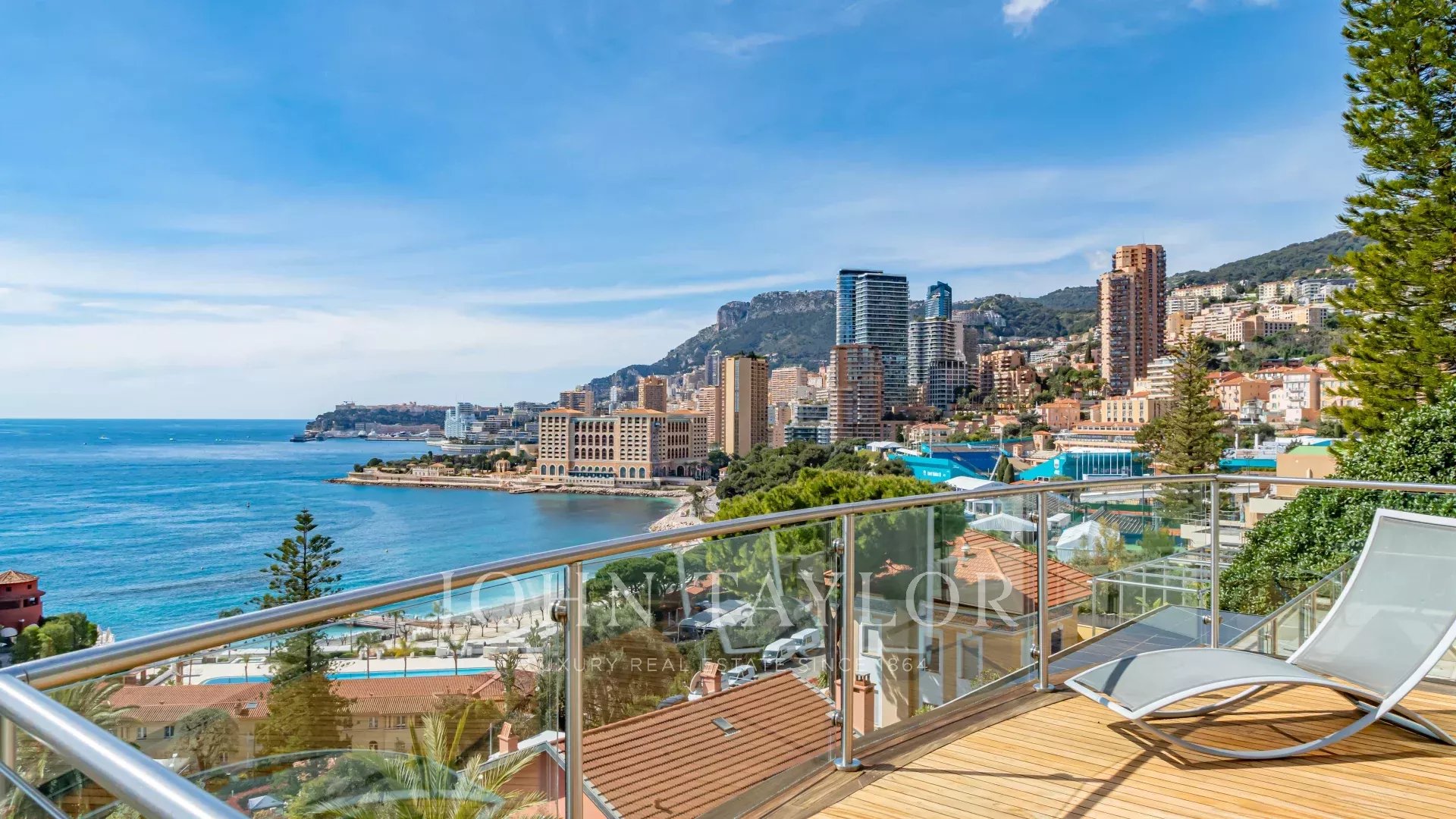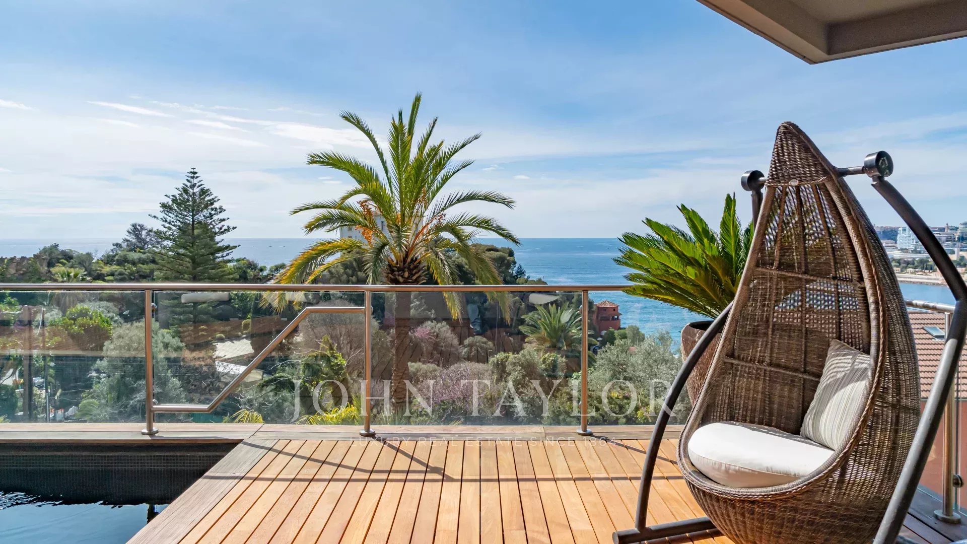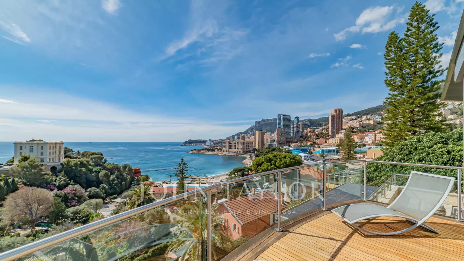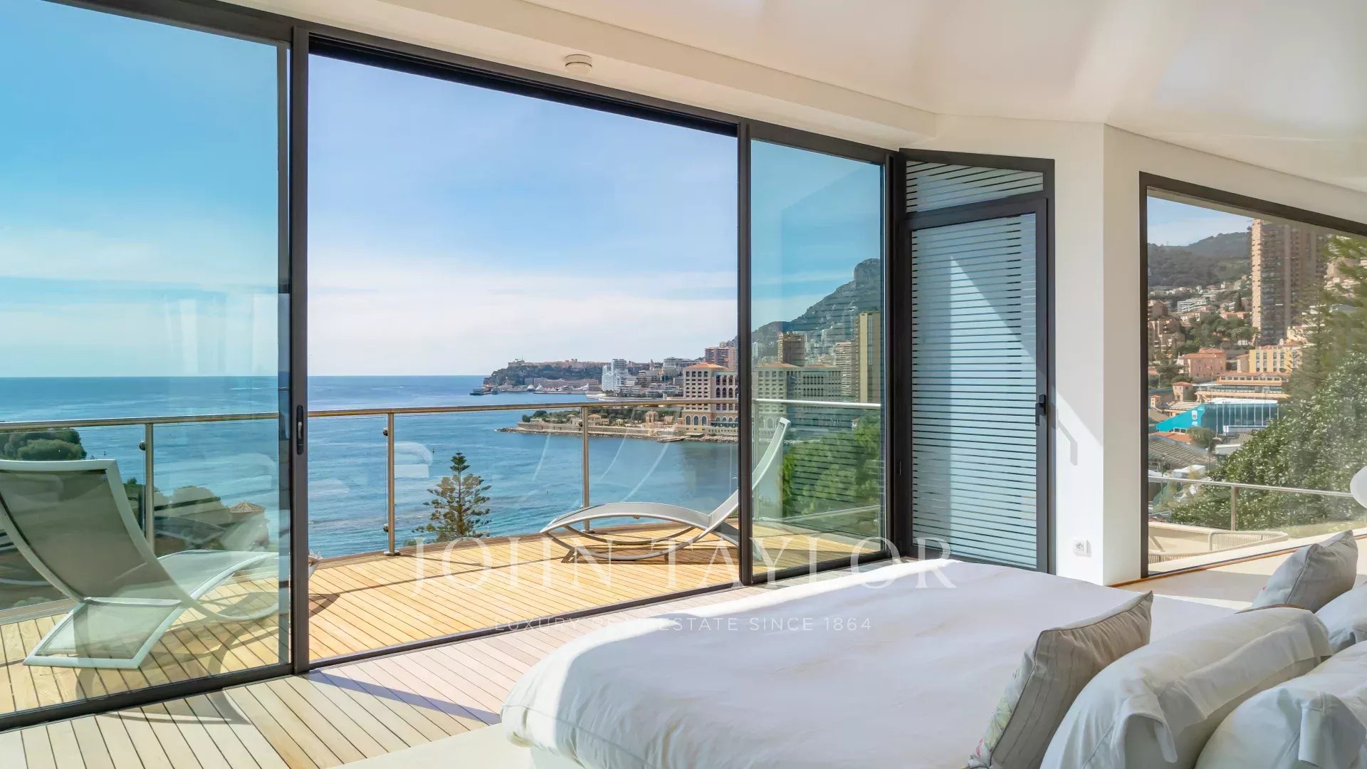 Die Wohnfläche von 580 m² verteilt sich auf 5 Ebenen und besteht aus 5 Schlafzimmern, darunter ein Hauptschlafzimmer mit Panoramablick auf das Meer und Monaco.