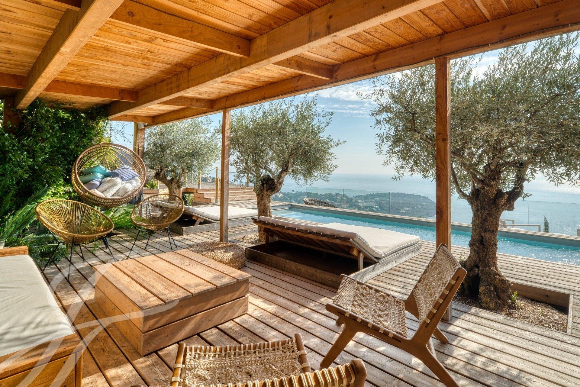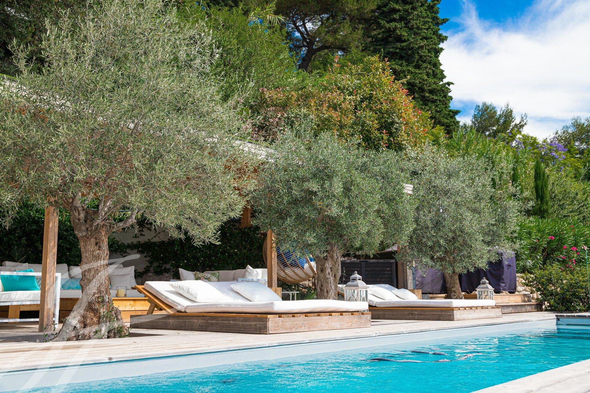 Diese Villa bietet einen zeitlosen Lebensrahmen und verfügt über große Terrassen mit einem sehr schönen Poolbereich mit Poolhaus und Sommersalon, einer erhöhten Terrasse mit märchenhaftem Meerblick, einem Essbereich im Freien mit dem Charme der Provence und Panoramablick auf das Meer.