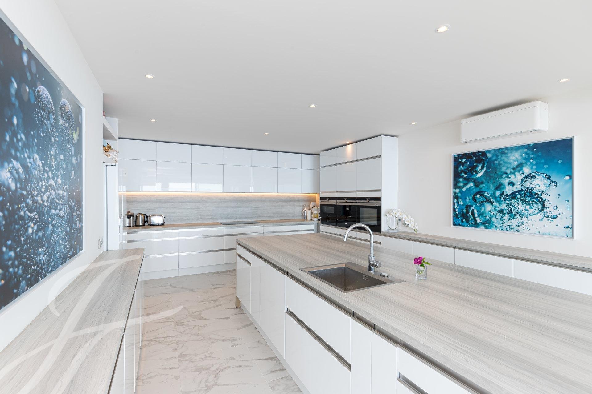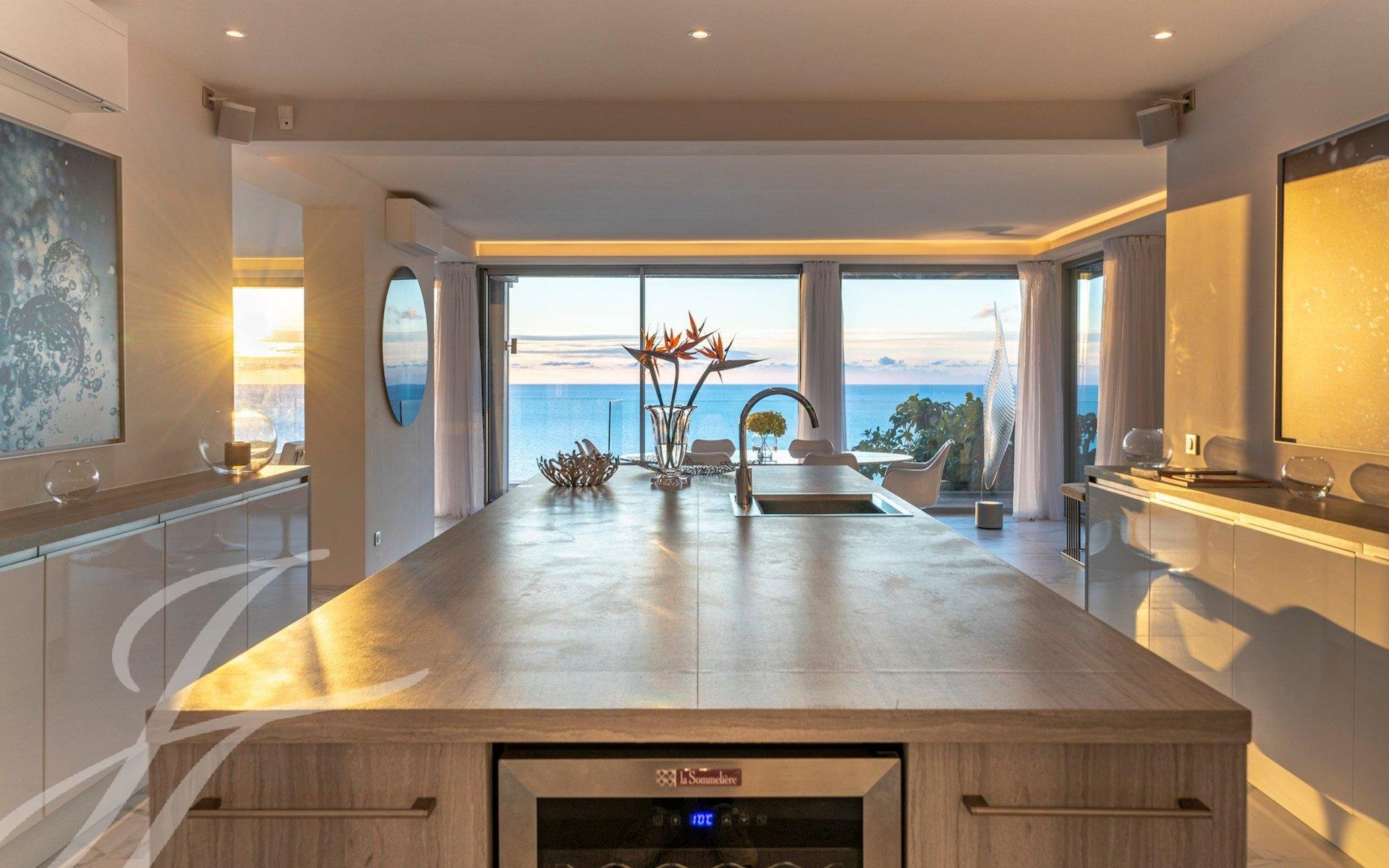Eingang zu einem dreifachen Wohnzimmer, darunter ein Fernsehzimmer mit seinem Kamin (doppelseitiger Einsatz), ein zweites Wohnzimmer, ein Esszimmer, eine hochwertige, voll ausgestattete amerikanische Küche, die sich zu einer Terrasse mit Meerblick öffnet.