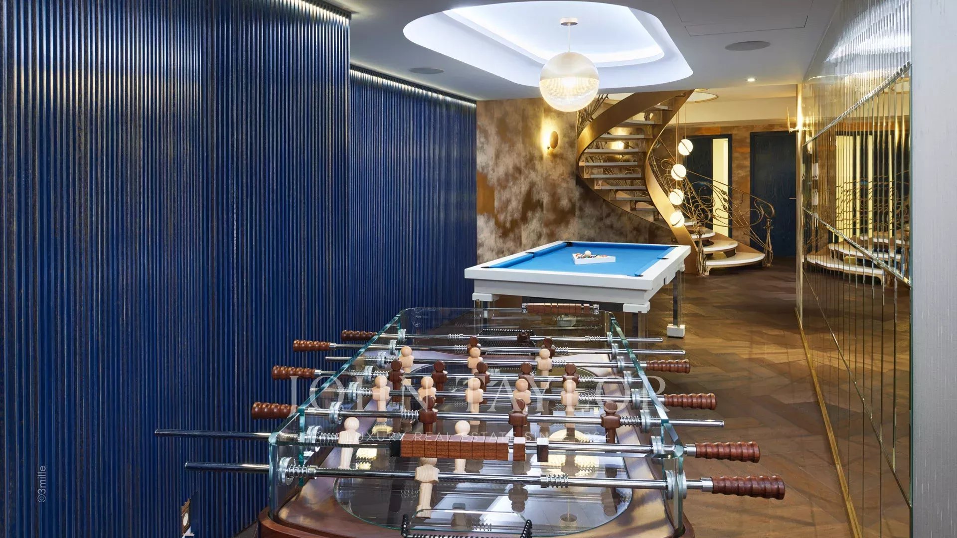 Dieses Anwesen bietet außerdem einen umfassenden Wellnessbereich mit einem voll ausgestatteten Fitnessraum, einem Dampfbad, einer Sauna und einem Massageraum.