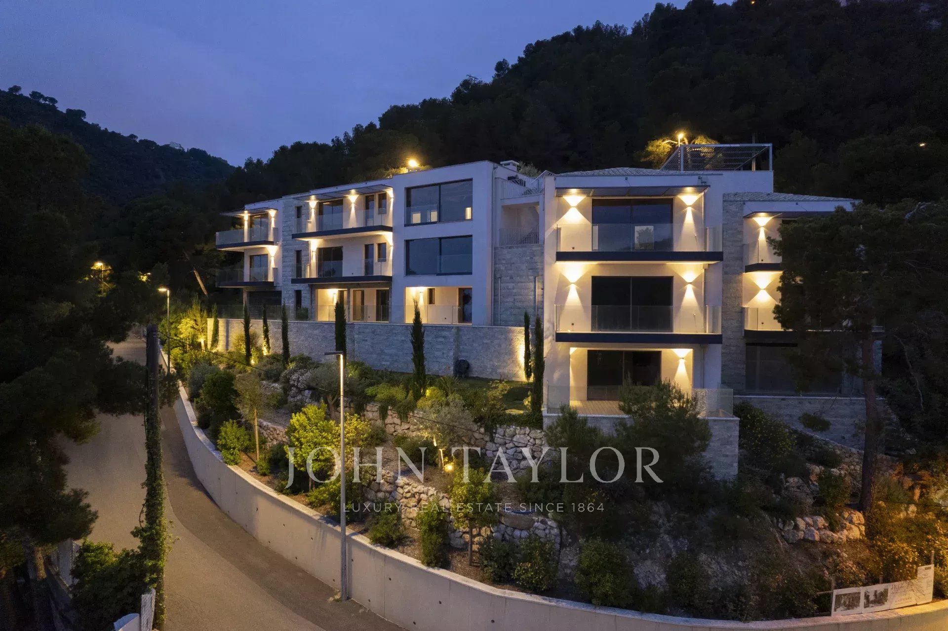 Das Gebäude ist neu und die Außenanlagen sind bereits mit einem Landschaftsgarten, großen Terrassen und eleganten Zäunen gestaltet.