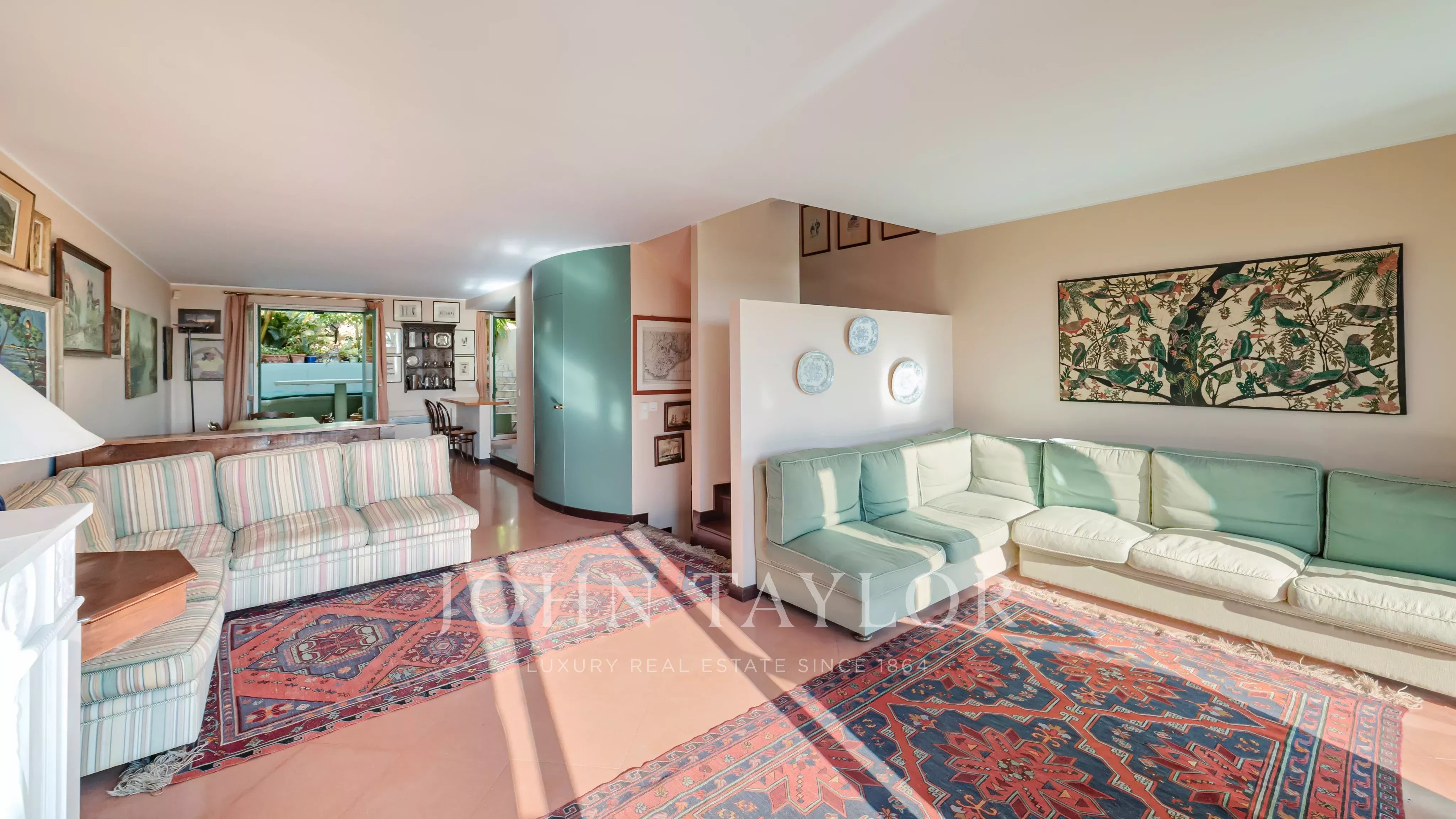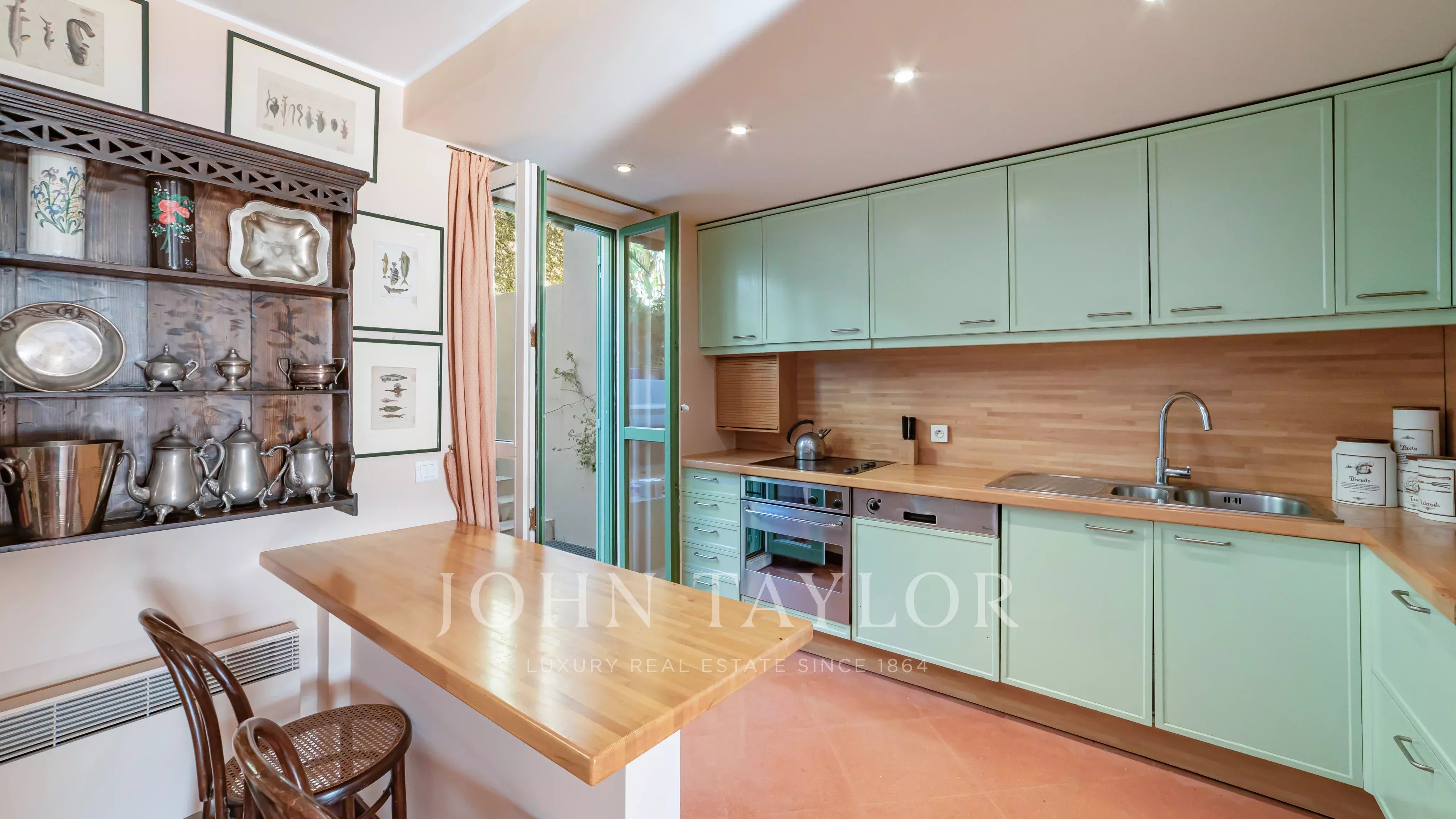 Das Esszimmer und die Küche, die etwas zurückgesetzt liegen, bieten Zugang zu einer zweiten Terrasse, die durch einen kleinen Garten verlängert wird und einen ruhigen und intimen Außenbereich bietet.