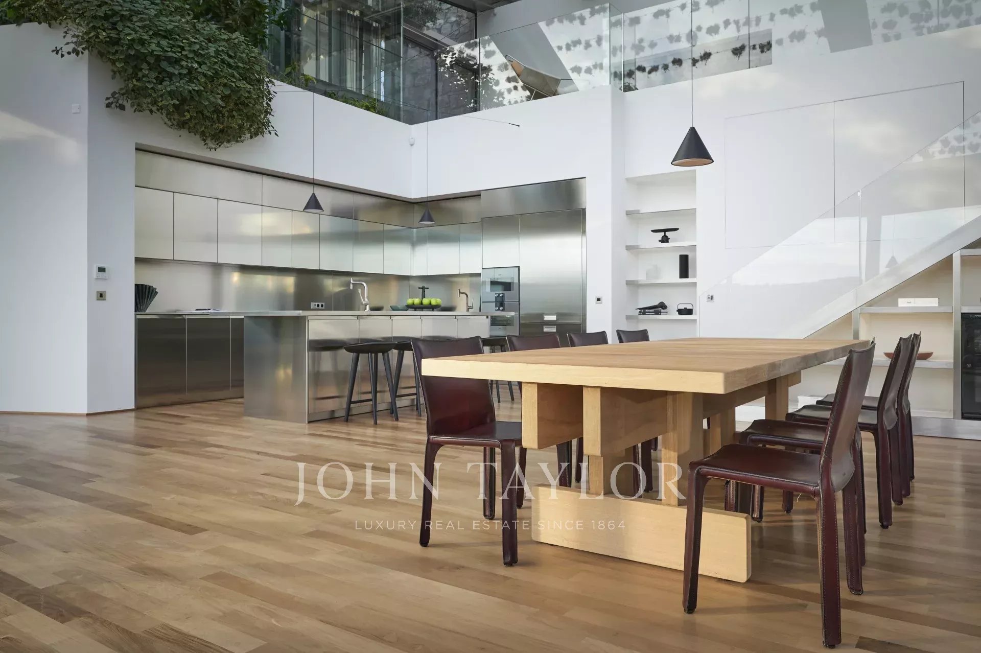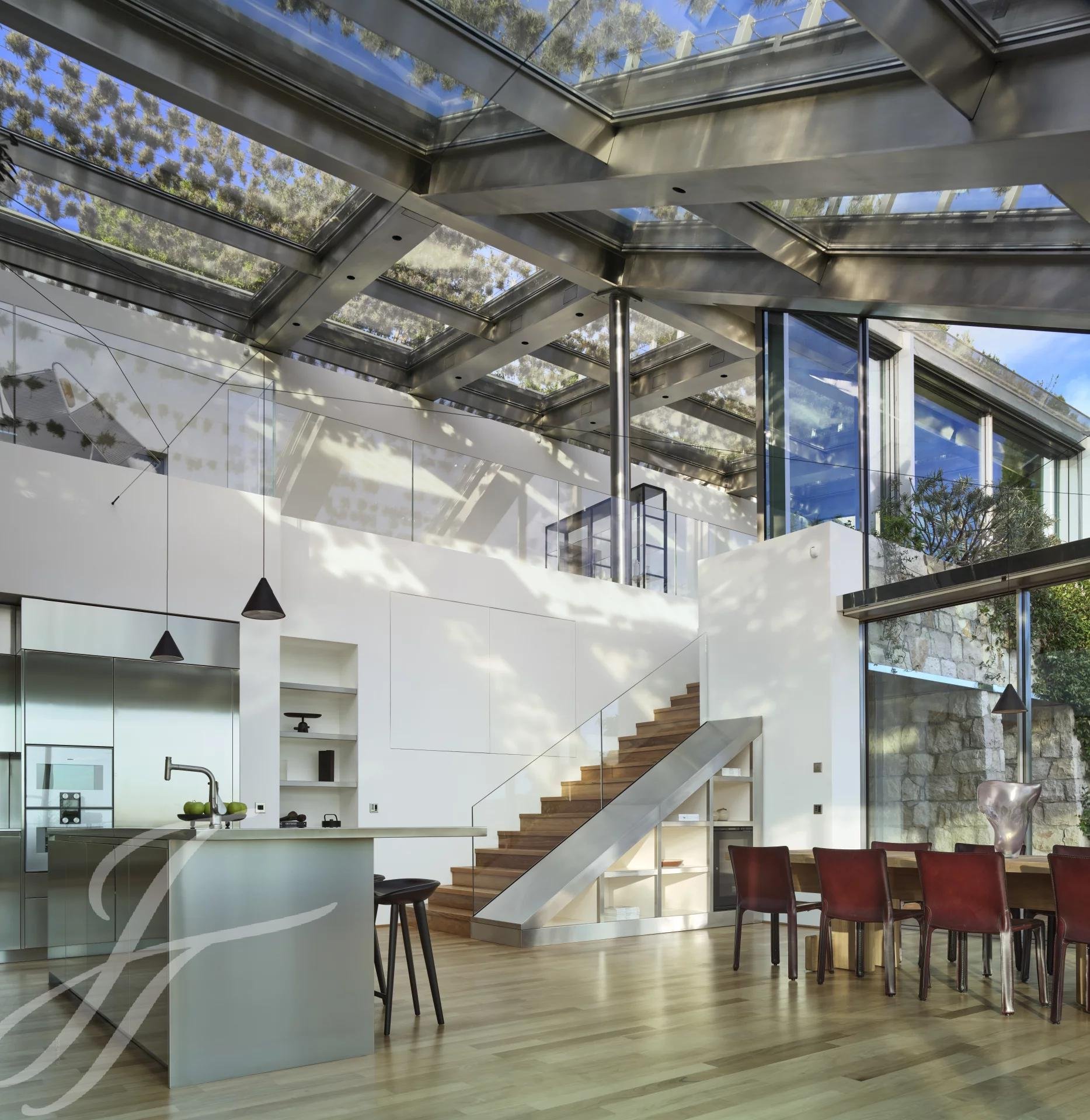 Das Wohnzimmer, das Esszimmer und die radikal moderne Küche verfügen über eine doppelte Deckenhöhe. Die Decke... aus Glas! Natürlich speziell behandelt und kann mit speziellen Jalousien abgedunkelt werden.