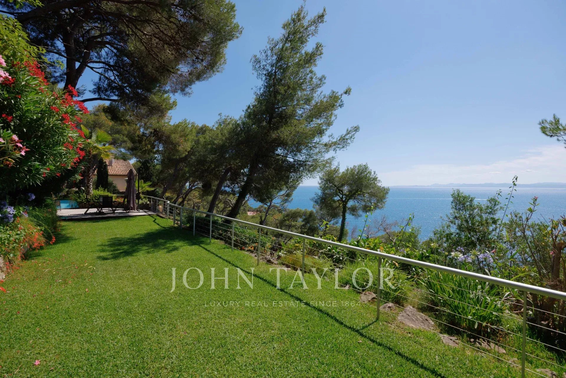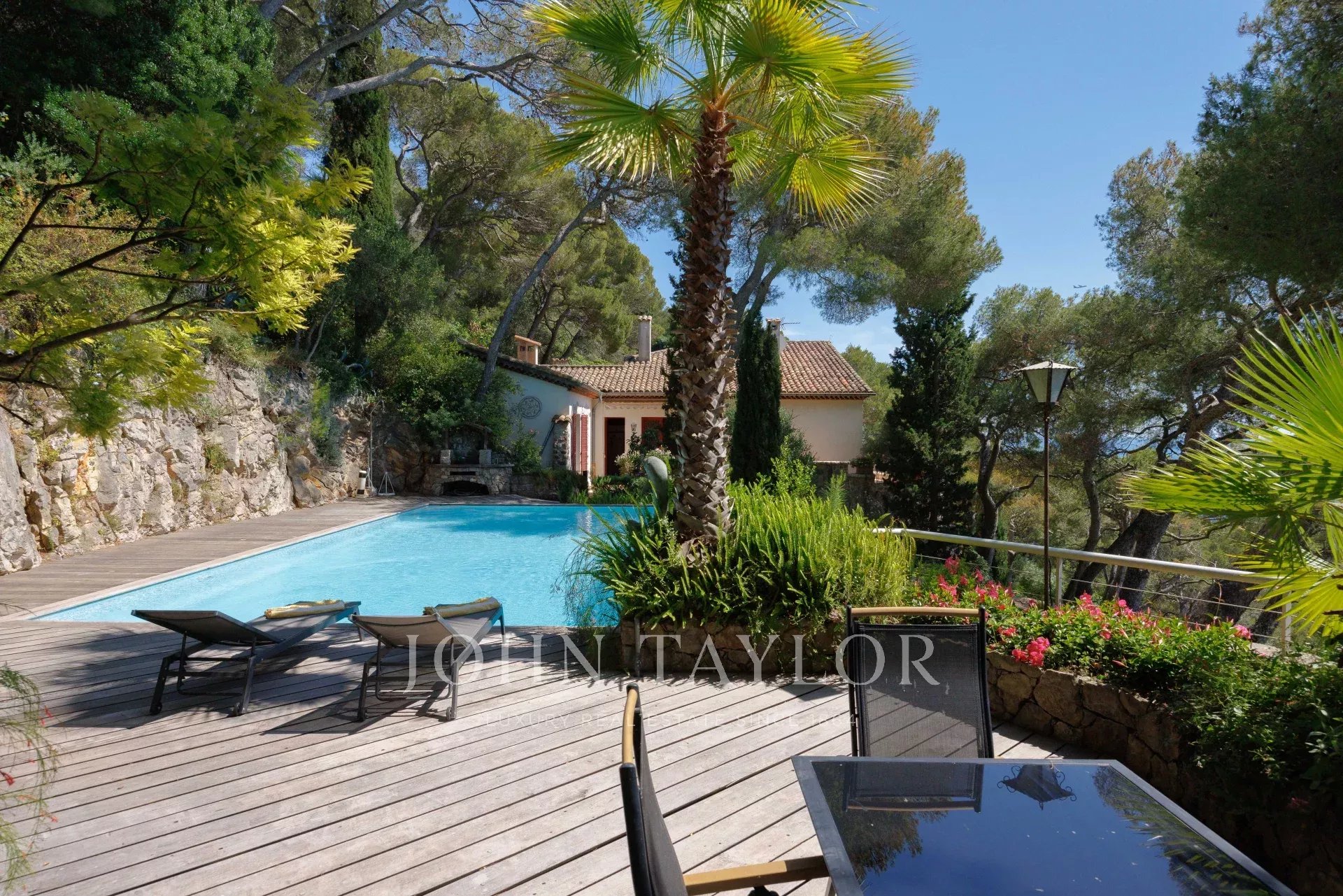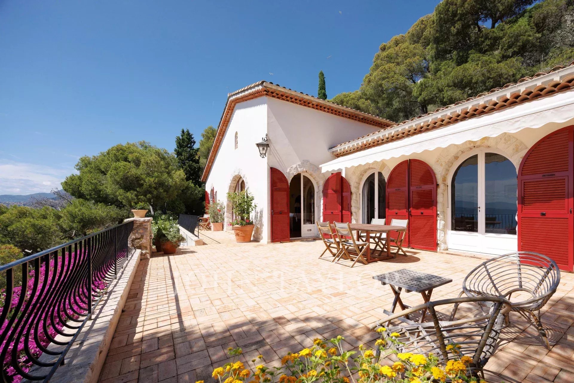 Die Villa auf zwei Ebenen ist in provenzalischer Architektur gehalten und voller Charme. Sie befindet sich am oberen Ende des wunderschönen Gartens. Sie verfügt über 5 Schlafzimmer und 3 Badezimmer, ein Wohn- und Esszimmer mit Zugang zu einer großen Terrasse mit einem Sommer-Esszimmer, das von einem spektakulären Meerblick profitiert, eine geräumige Küche und einen schattigen Innenhof...
