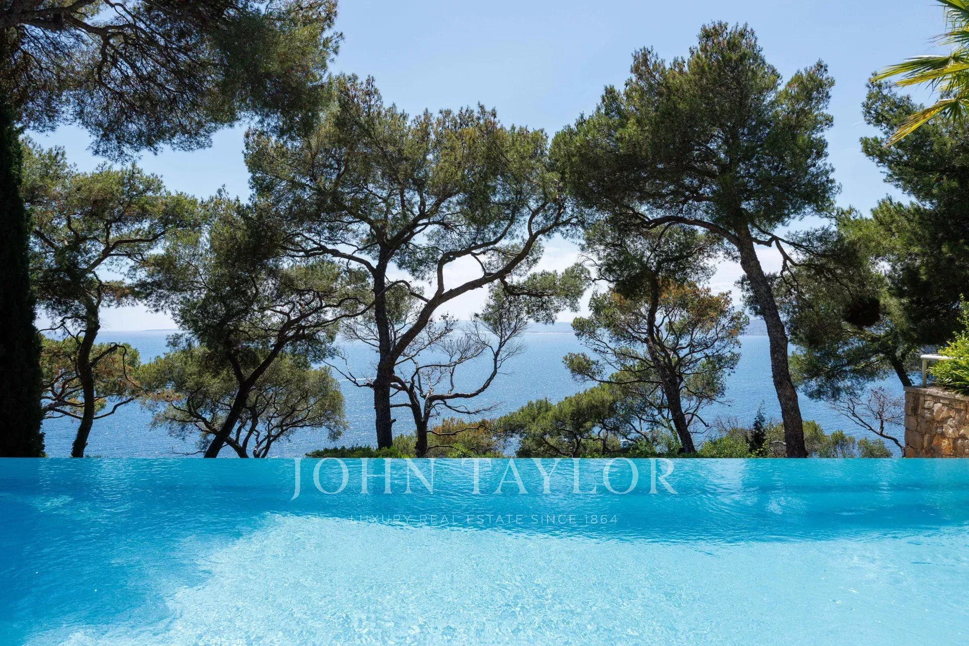 Ein sehr schöner beheizter Swimmingpool bietet einen eleganten Blick auf das Meer durch die Zweige der Pinien...