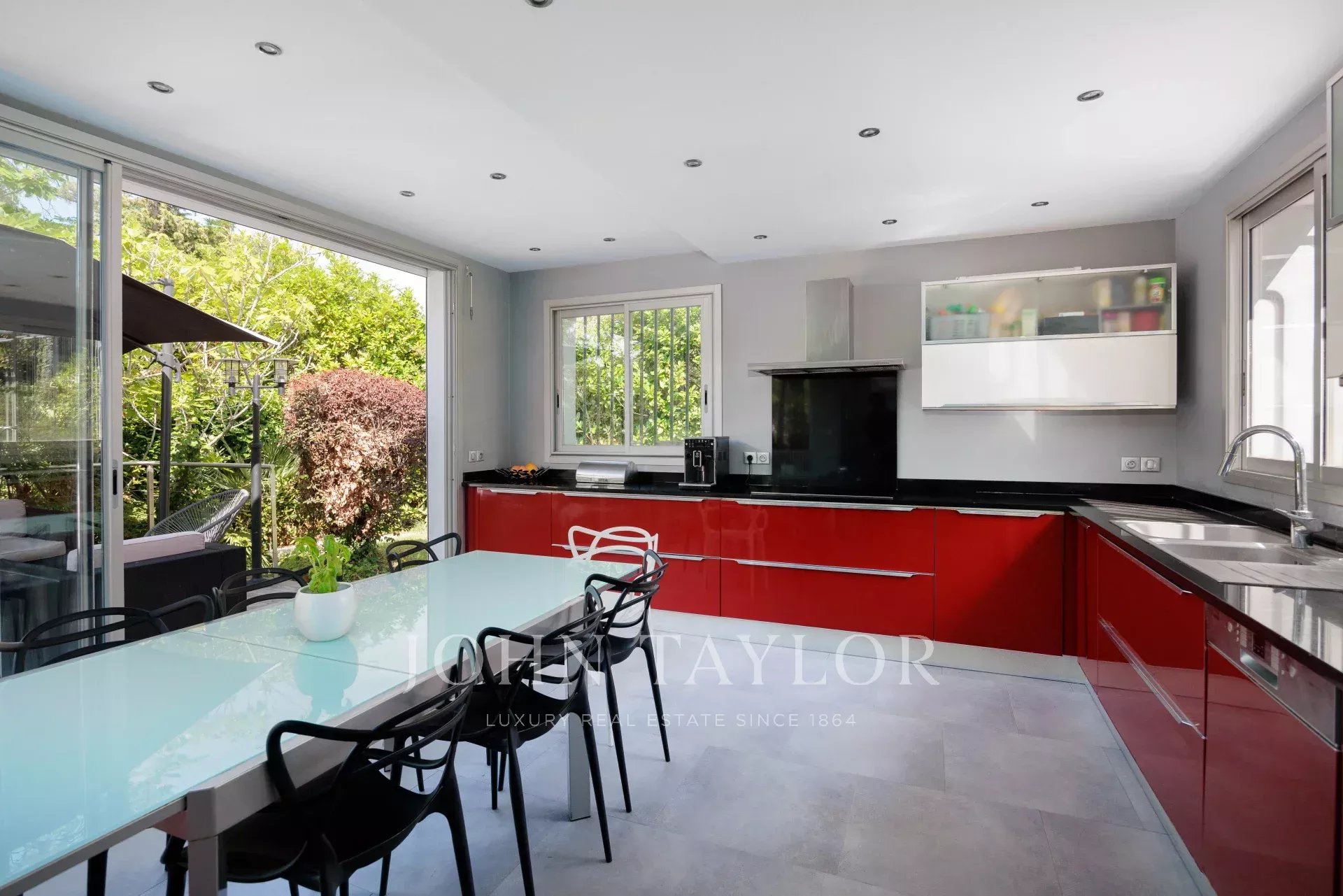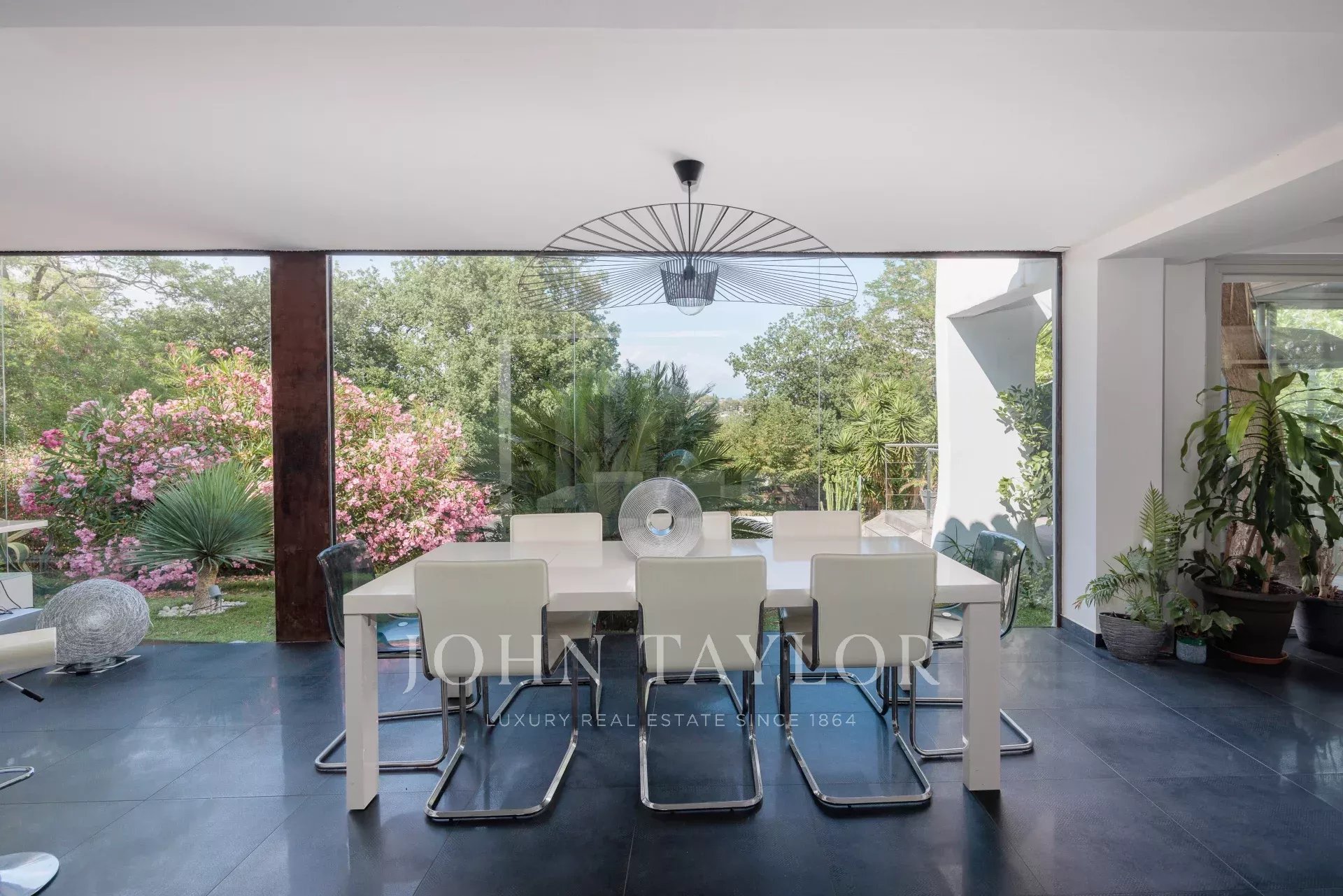 Exklusivität. Im begehrten Viertel Saint-Véran in Cagnes-sur-Mer, in unmittelbarer Nähe aller Annehmlichkeiten, liegt dieses elegante Anwesen im Hacienda-Stil von ca. 406 m² auf einem Landschaftsgrundstück von 2.611 m², das eine grüne und geschützte Umgebung bietet.