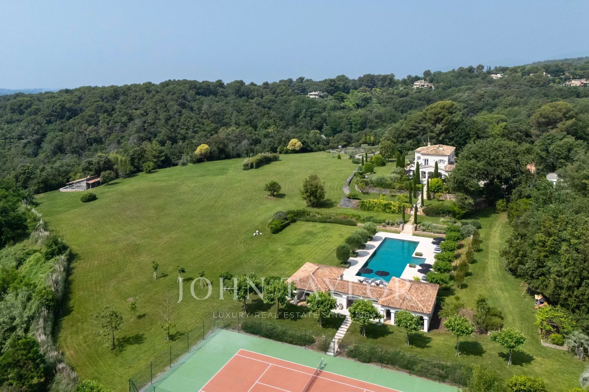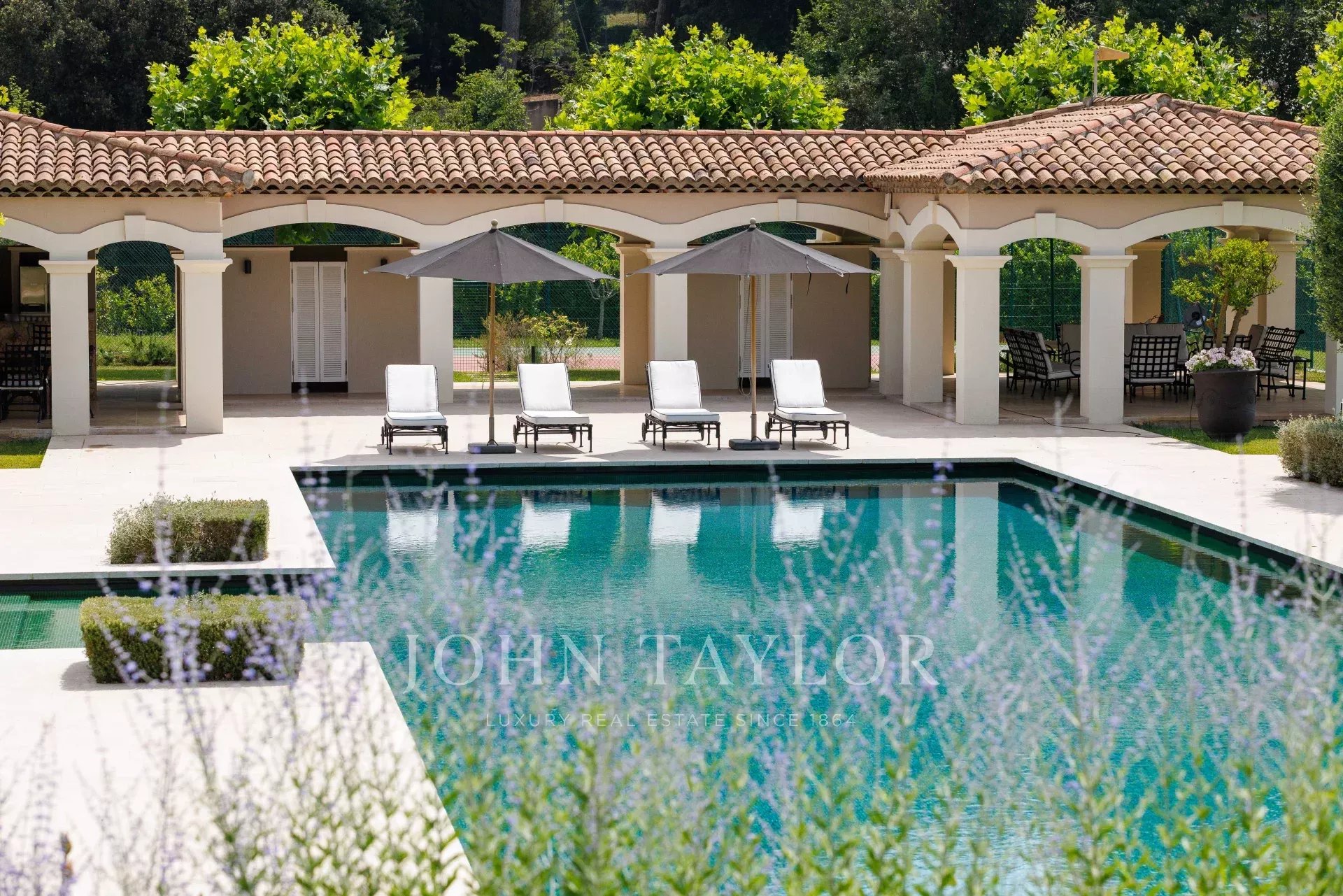 Die Außenanlagen sind angenehm und wir finden rund um die Villa überdachte und nicht überdachte Terrassen. Der Poolbereich im Freien verfügt über ein riesiges Poolhaus mit Sommerküche, Umkleideräumen und überdachter Terrasse. Der Pool ist 25m x 8m groß und befindet sich auf der Höhe des Poolhauses. Leicht zugänglich ist der Tennisplatz.