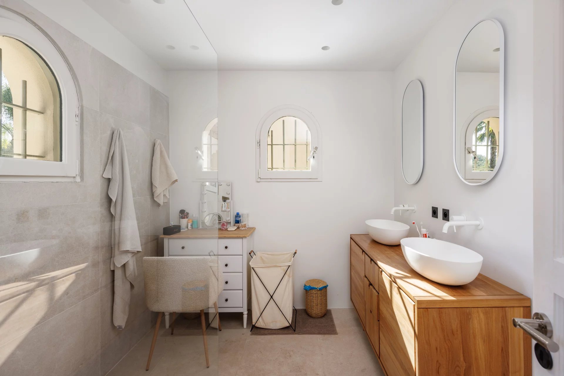 Die Hauptvilla bietet großzügige, lichtdurchflutete Räume. Sie ist ebenerdig und besteht aus einem Eingangsbereich, einem sehr großen Wohnzimmer mit Küche und Hauswirtschaftsraum, einer prächtigen Mastersuite mit Duschbad, Ankleidezimmer und Boudoir mit Kamin sowie zwei weiteren Schlafzimmern mit zwei Badezimmern/Duschen. Im Obergeschoss befinden sich ein viertes Schlafzimmer und ein großes Zwischengeschoss, das sich perfekt als Büro oder Spielzimmer eignet.