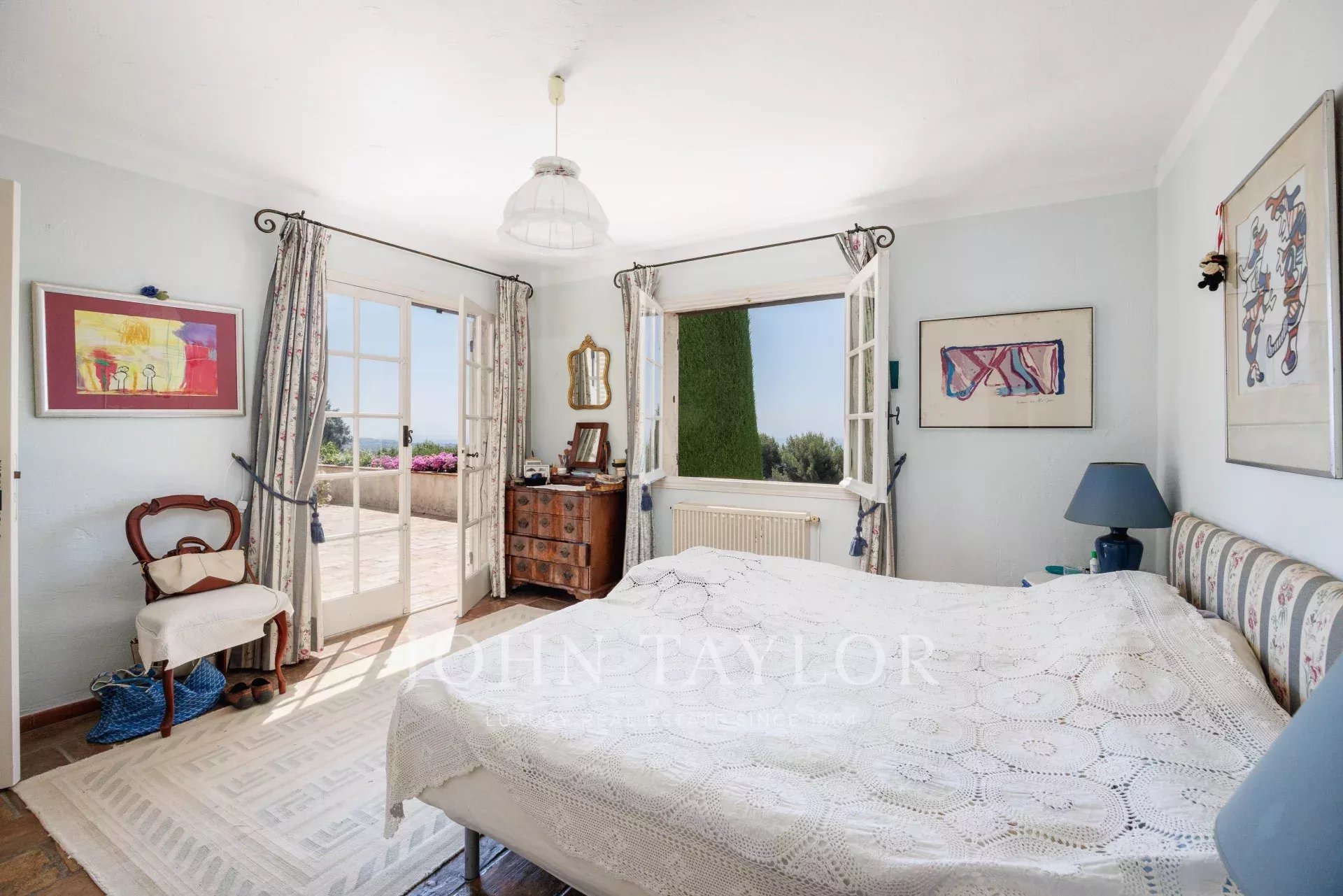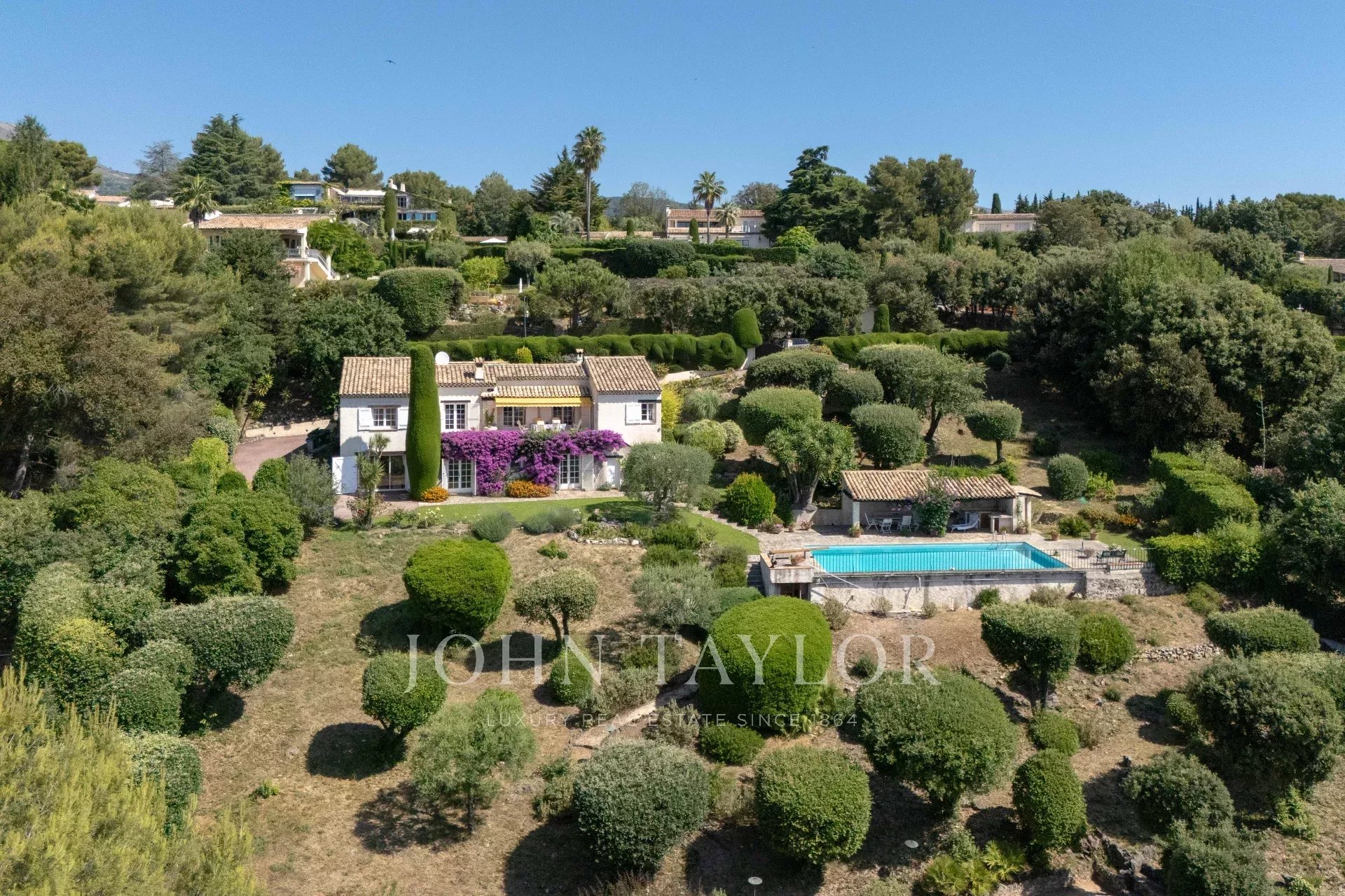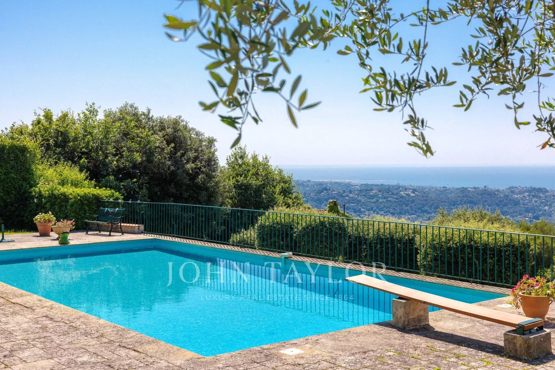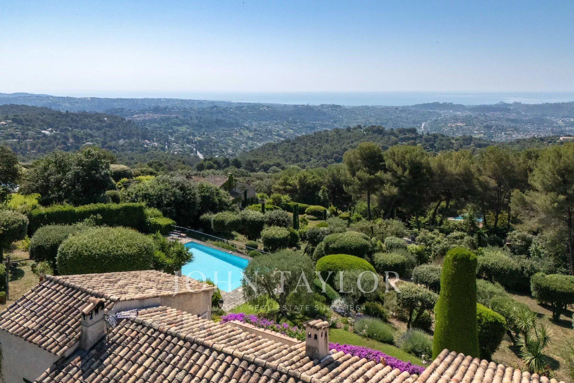 Charmantes Haus von ca. 238 m² in der renommierten, gesicherten Domäne Hauts de Saint-Paul, in absolut ruhiger Lage mit einem atemberaubenden Panoramablick auf das Meer und das Dorf Saint-Paul de Vence. Es liegt inmitten eines wunderschön angelegten Grundstücks von 3.837 m², das mit einem Pool, einem Poolhaus und einem Boulespielplatz ausgestattet ist.