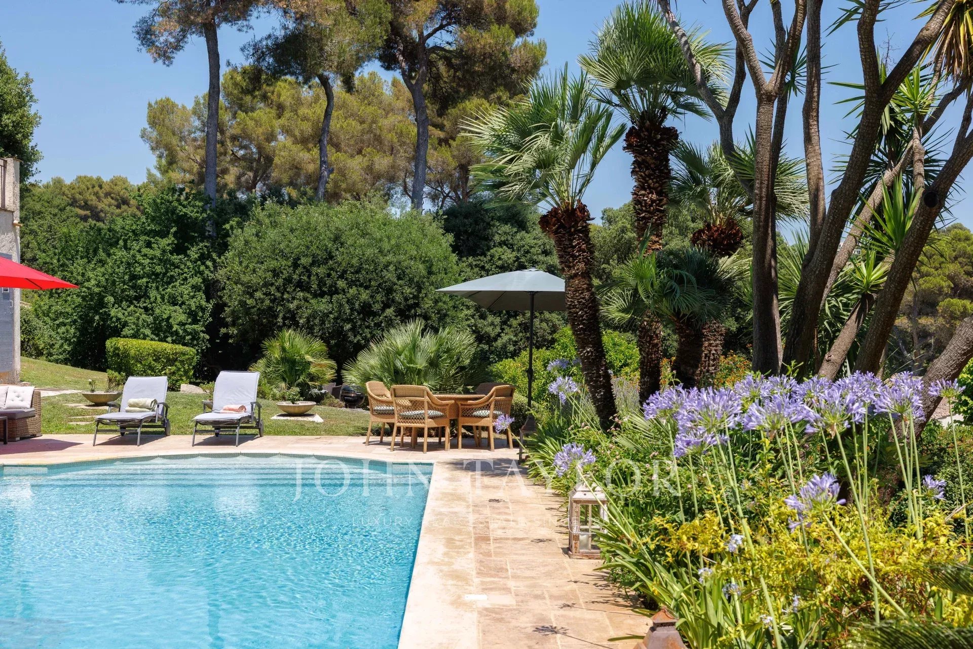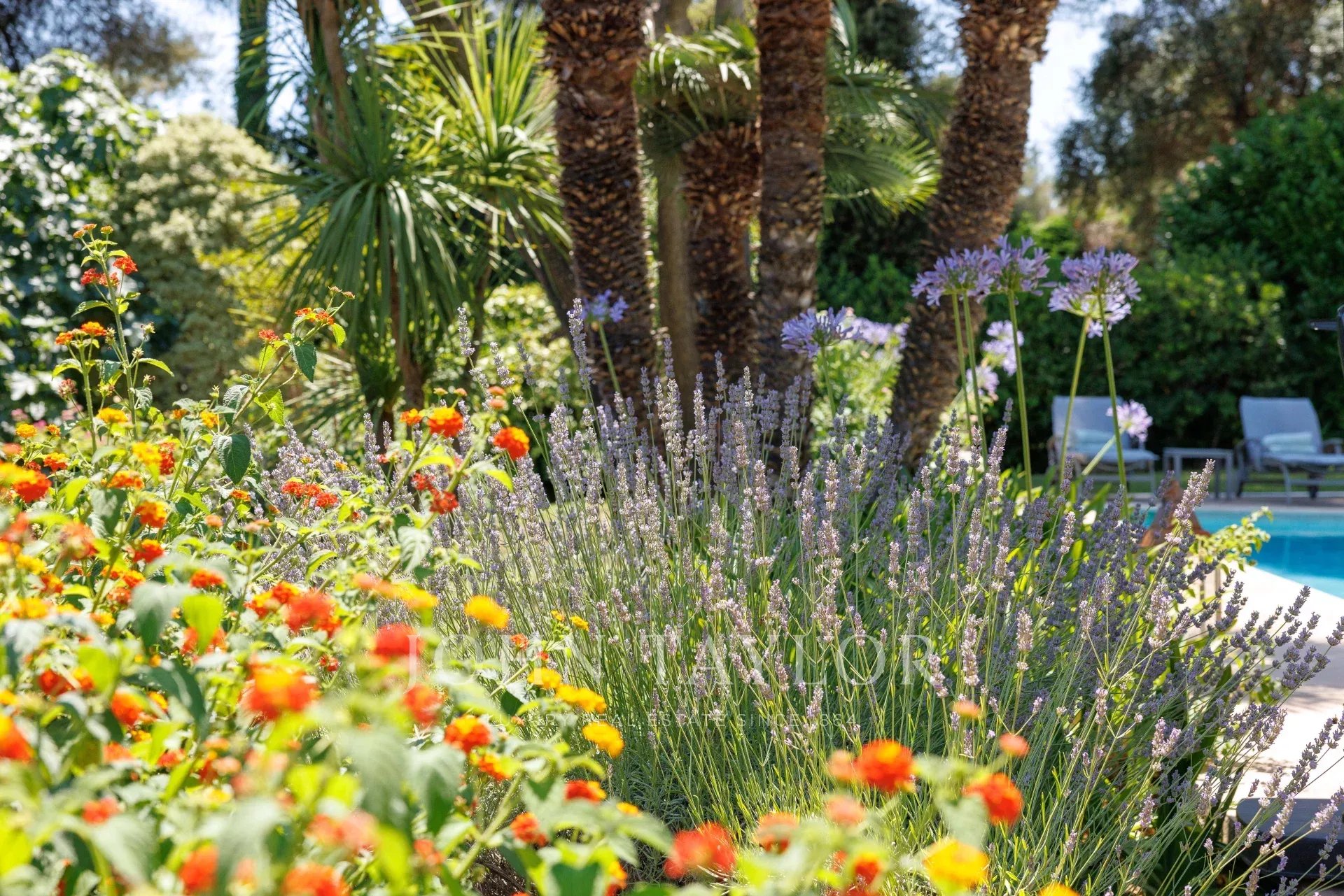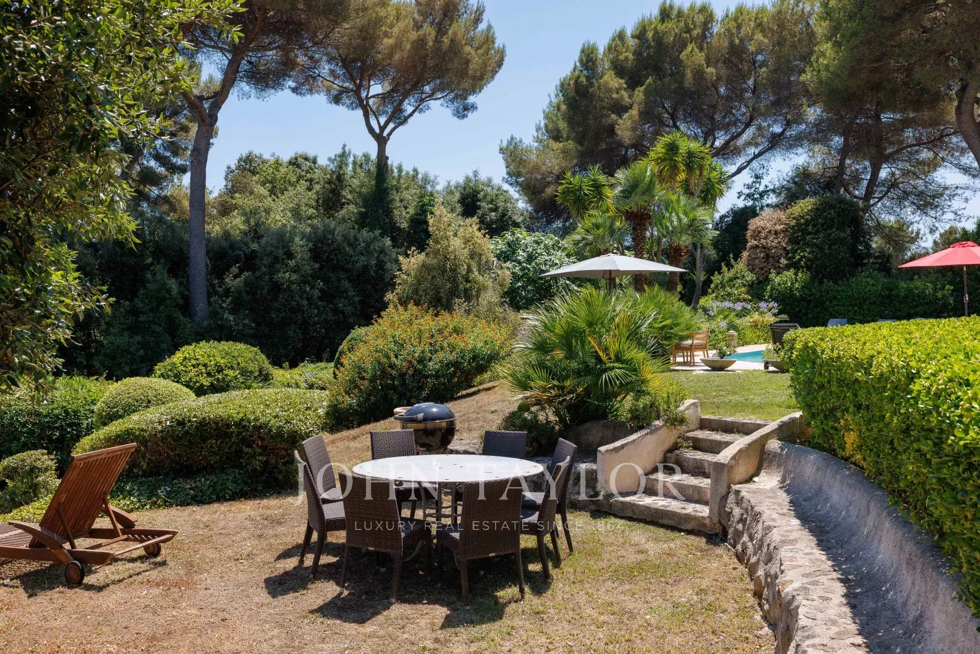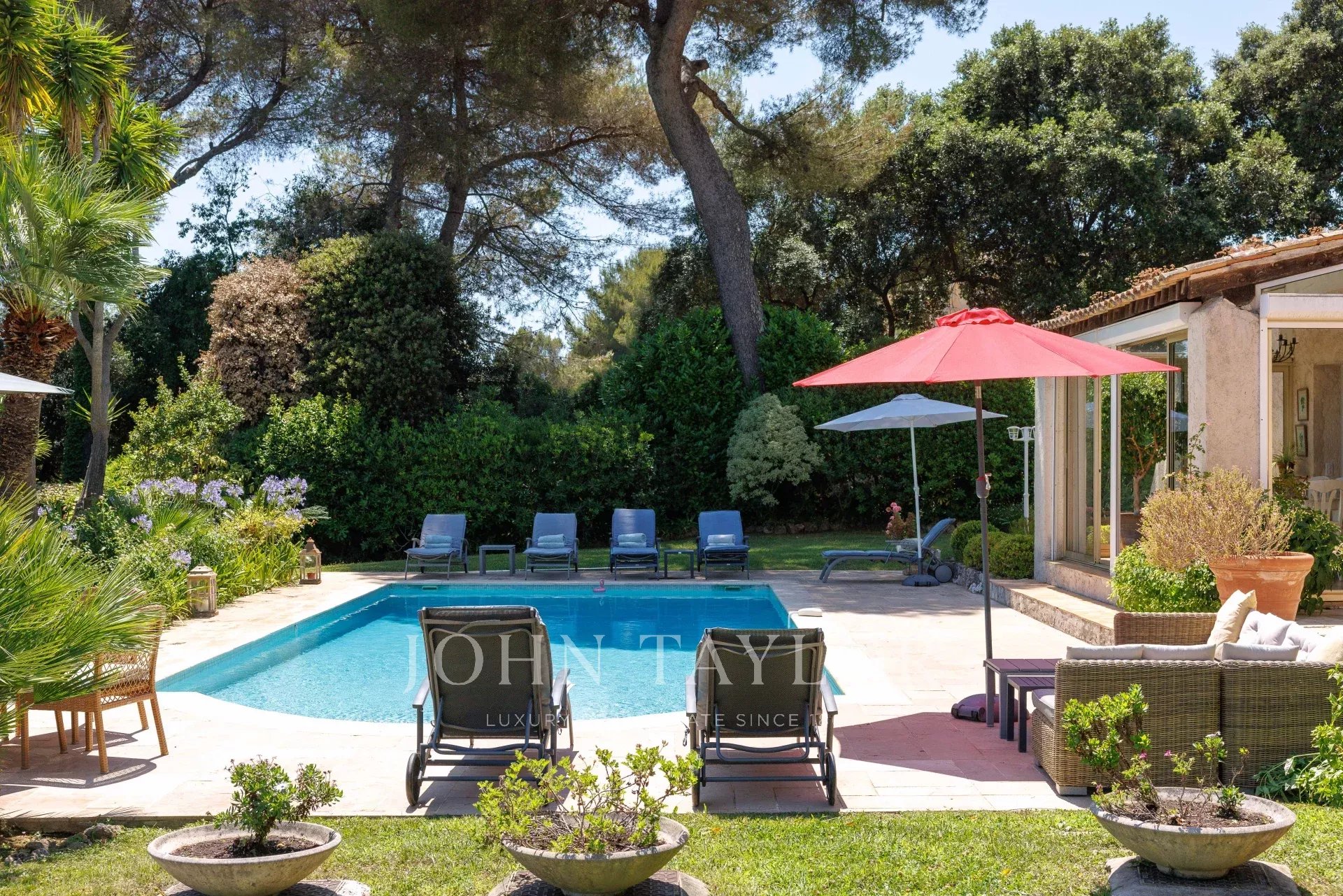 Im Außenbereich bietet der perfekt gepflegte Garten verschiedene Atmosphären: ein von Terrassen gesäumter Pool, eine große Rasenfläche mit einem zweiten Entspannungsbereich sowie ein Empfangsbereich auf der Rückseite des Hauses.
