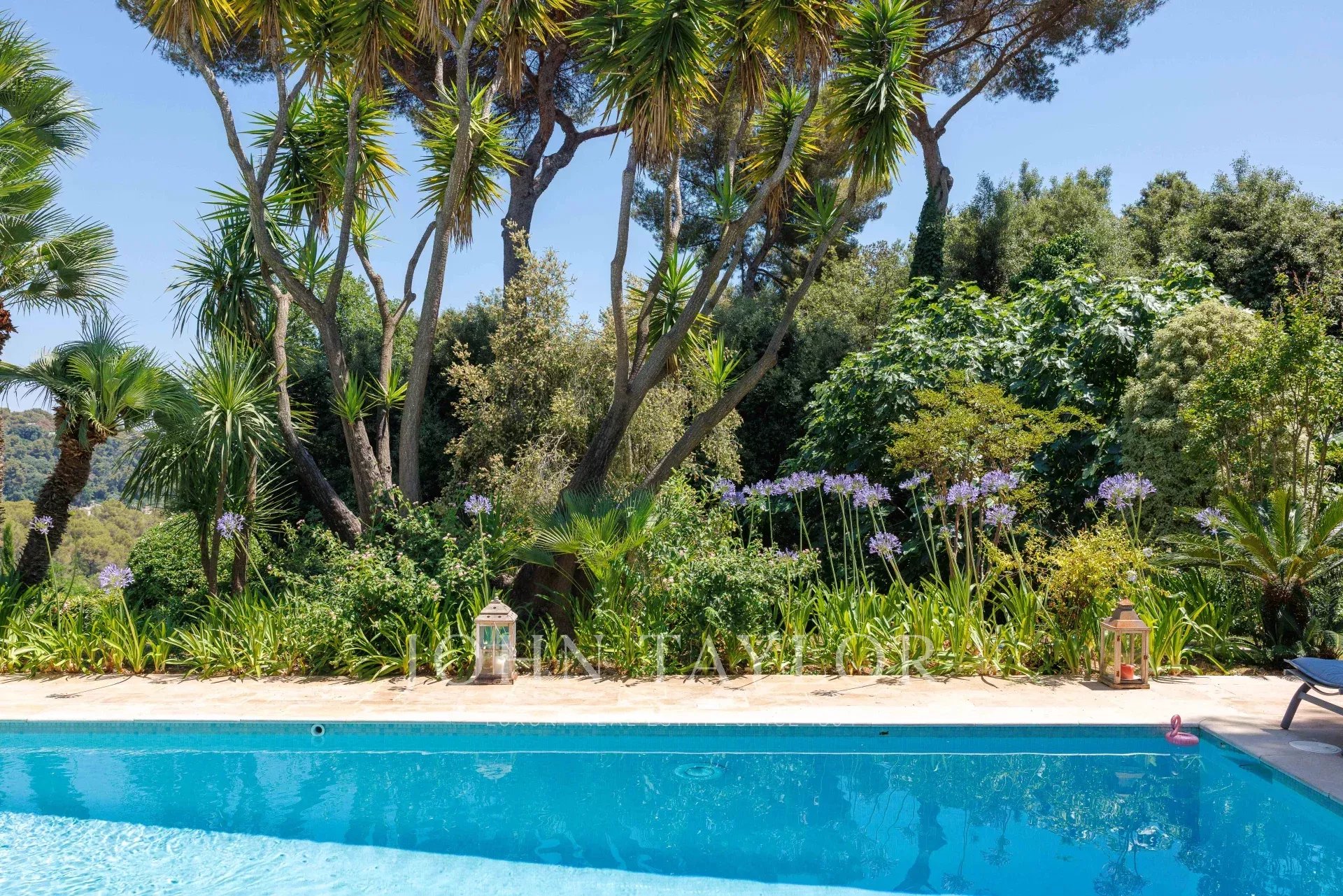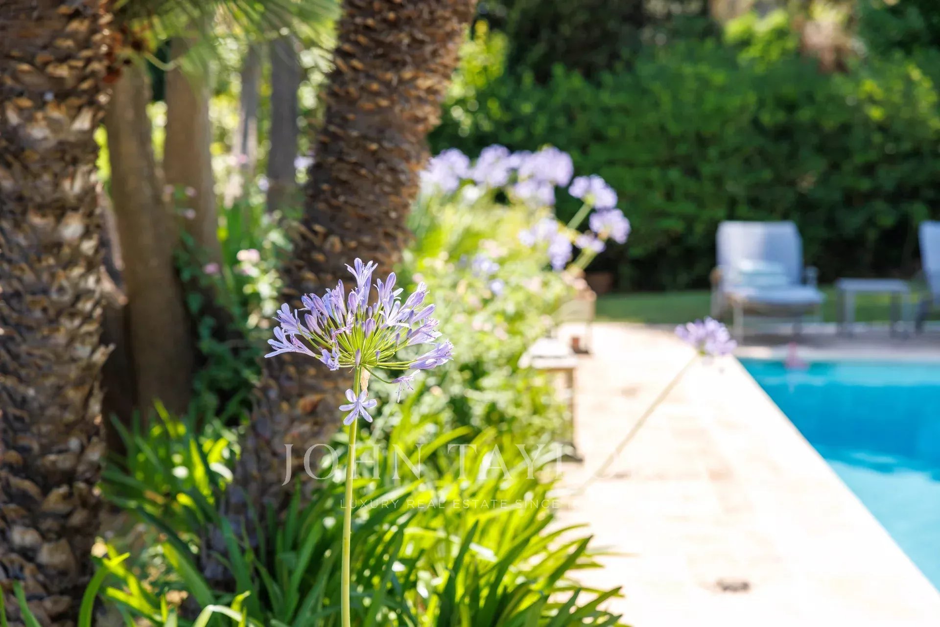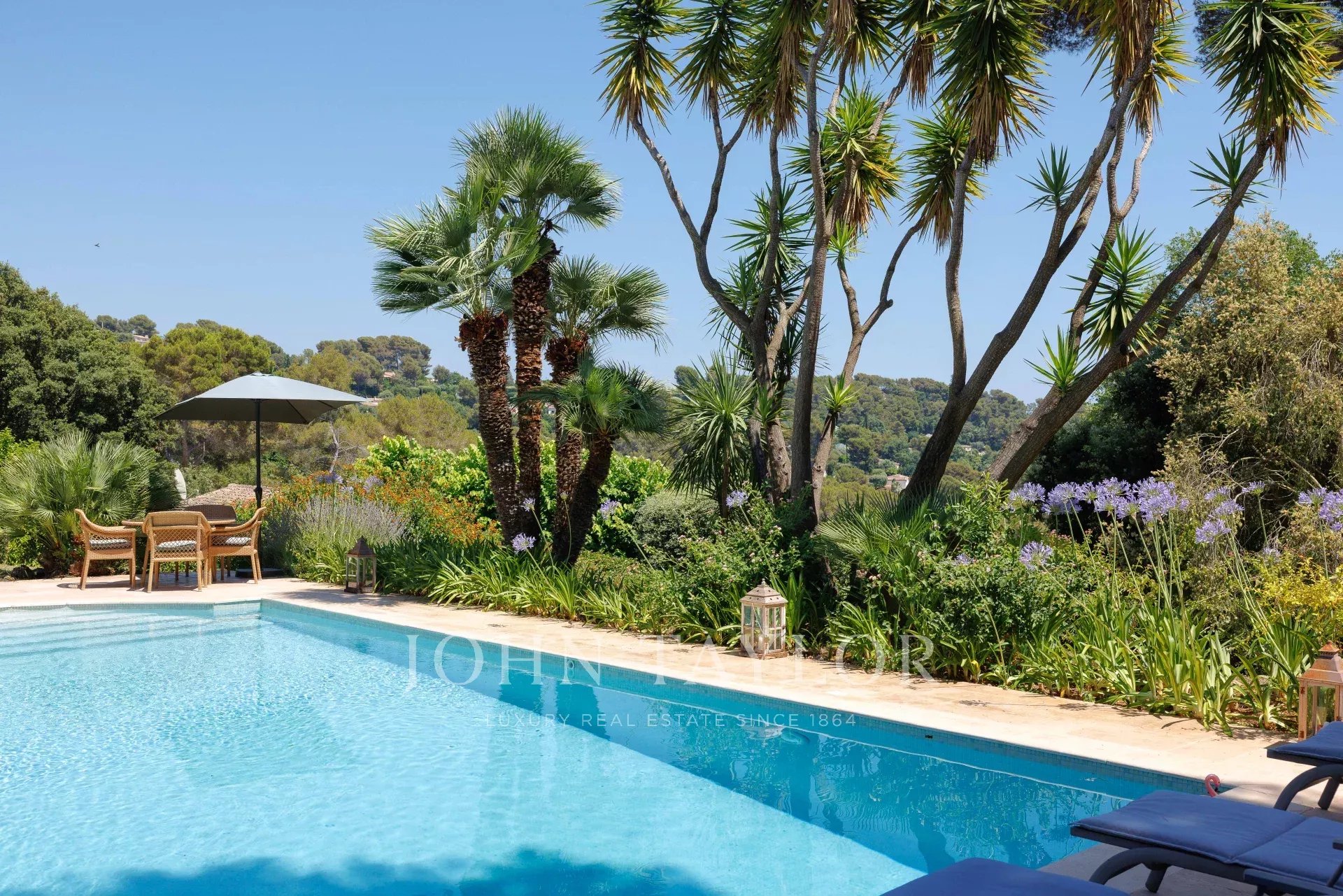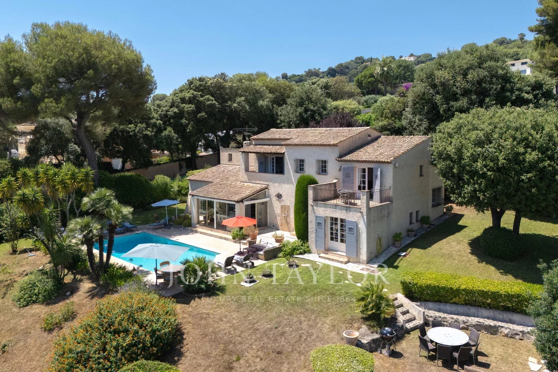Im Außenbereich bietet der perfekt gepflegte Garten verschiedene Atmosphären: ein von Terrassen gesäumter Pool, eine große Rasenfläche mit einem zweiten Entspannungsbereich sowie ein Empfangsbereich auf der Rückseite des Hauses.