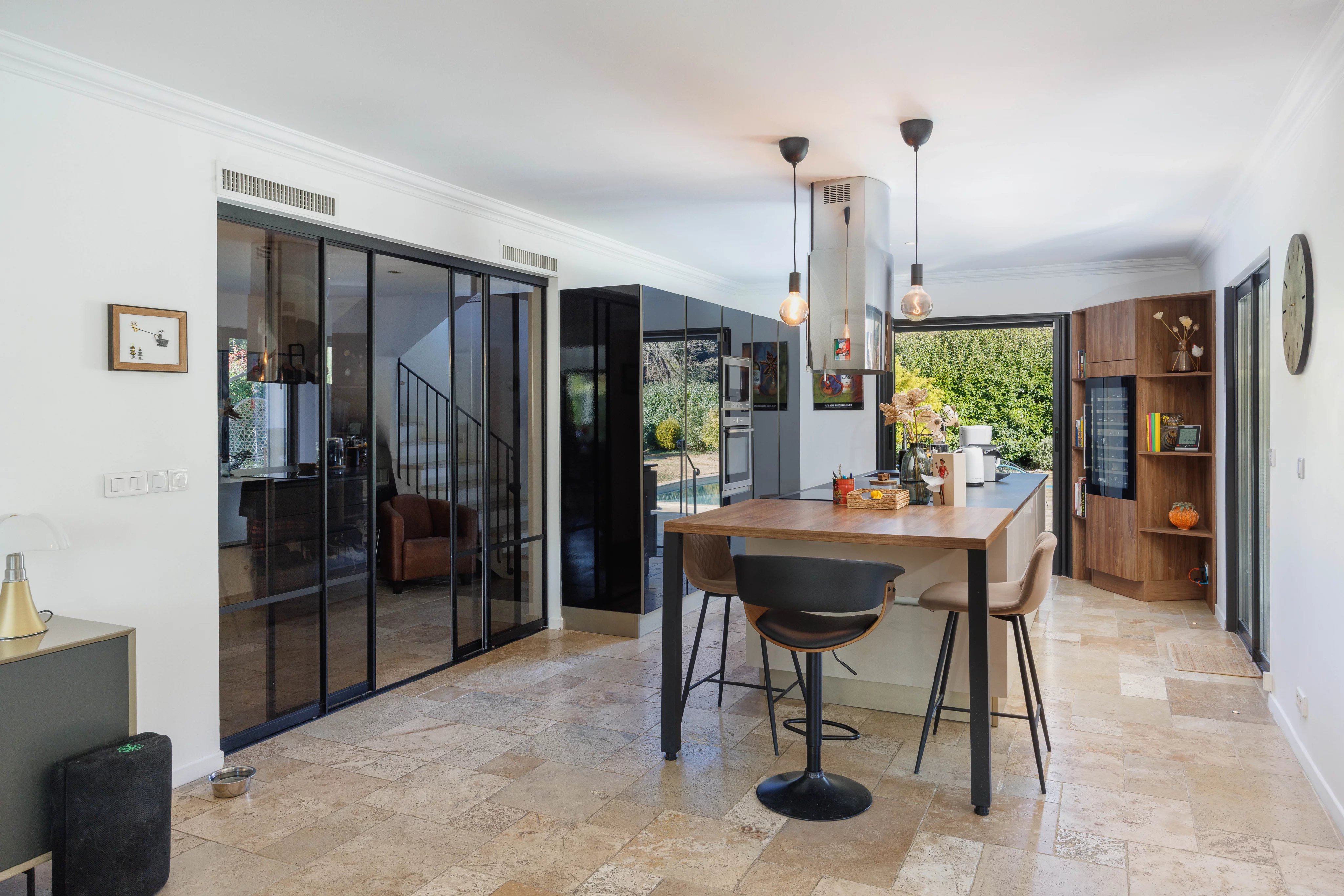 Der Eingangsbereich öffnet sich zu einem großen, lichtdurchfluteten Wohnbereich mit einem Wohnzimmer und einer offenen Küche mit zentraler Kochinsel, die dank der großen Panoramafenster weitgehend nach außen geöffnet sind. Das Esszimmer ist durch ein Atelierglasdach elegant vom Wohnbereich getrennt, was dem Ganzen Fluidität, Perspektive und Helligkeit verleiht.