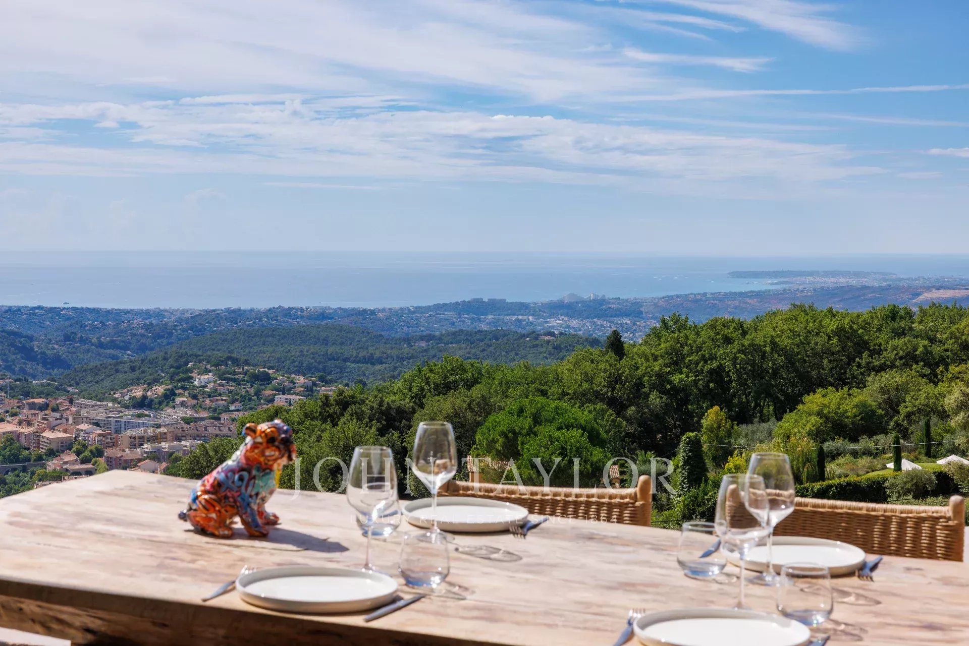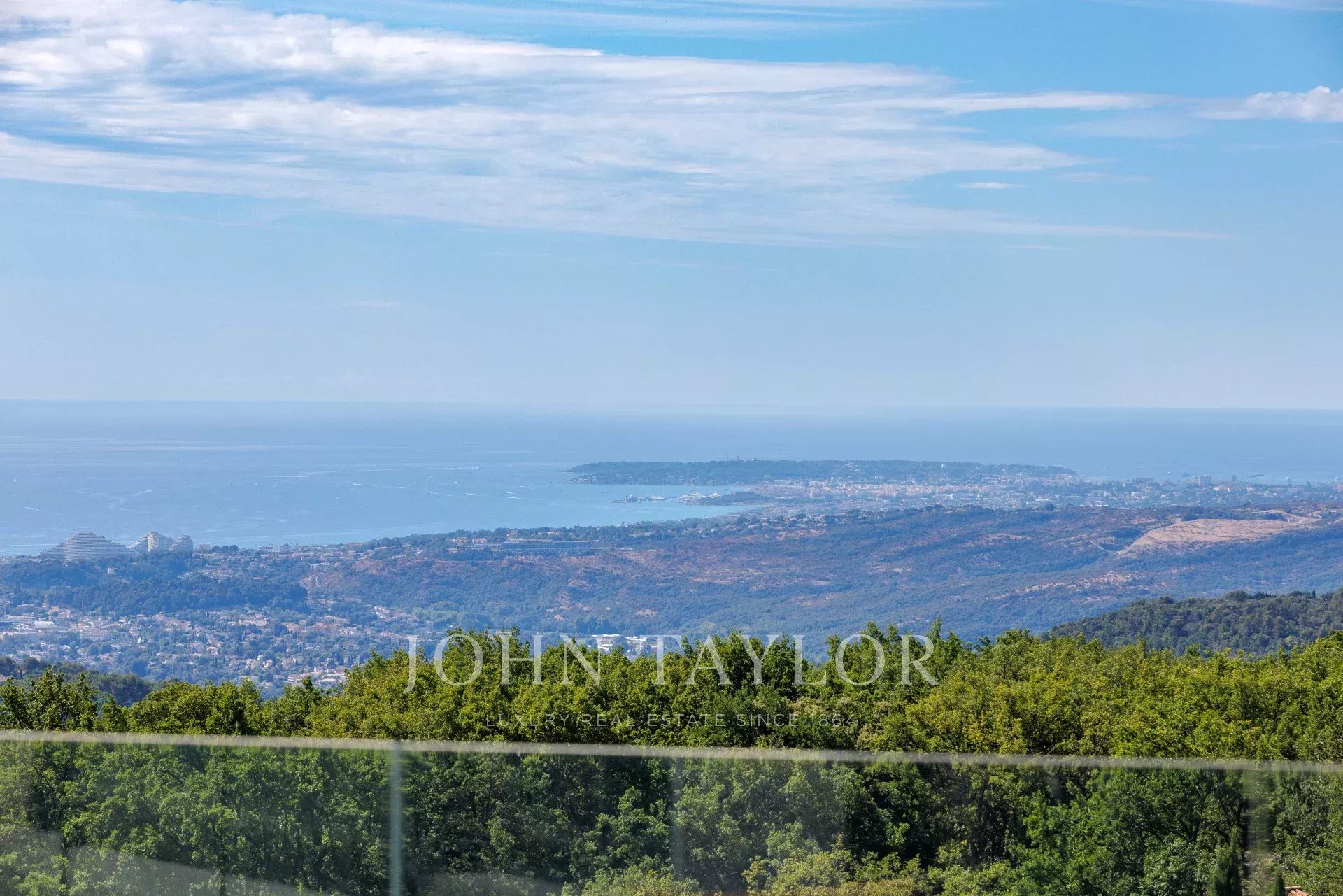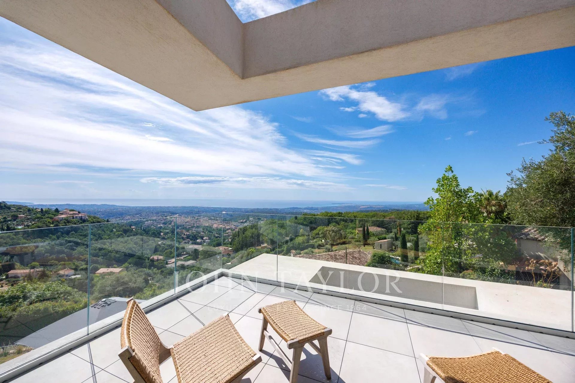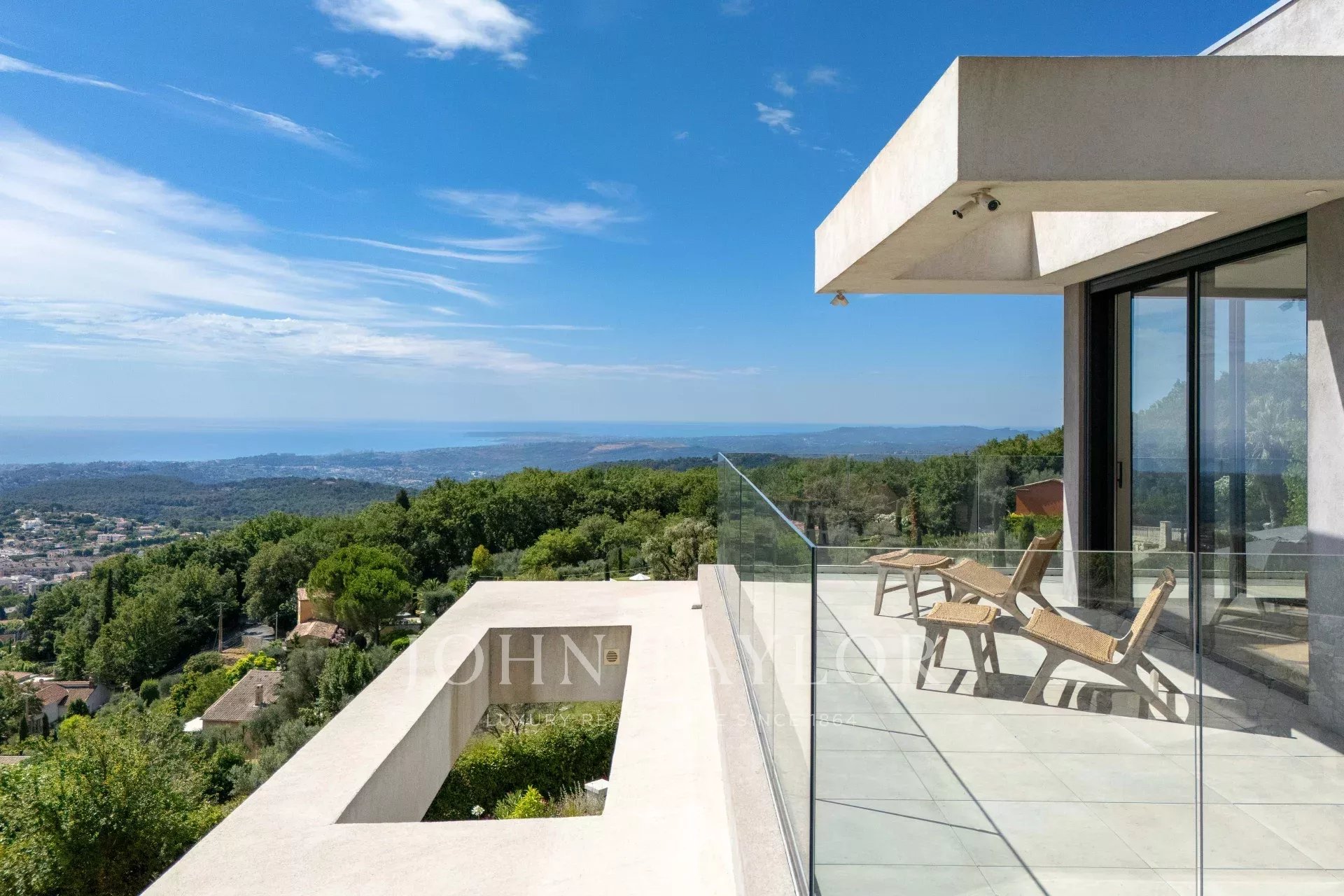 Diese wunderschöne, neu gebaute, 355 m² große zeitgenössische Villa liegt ideal auf den Anhöhen von Vence inmitten eines 4000 m² großen Landschaftsgrundstücks. Sie bietet einen außergewöhnlichen Rahmen mit Postkartenblick auf das Meer - vom Cap d'Antibes über die Baie des Anges bis hin zum Cap Ferrat - sowie auf die umliegenden Berge.