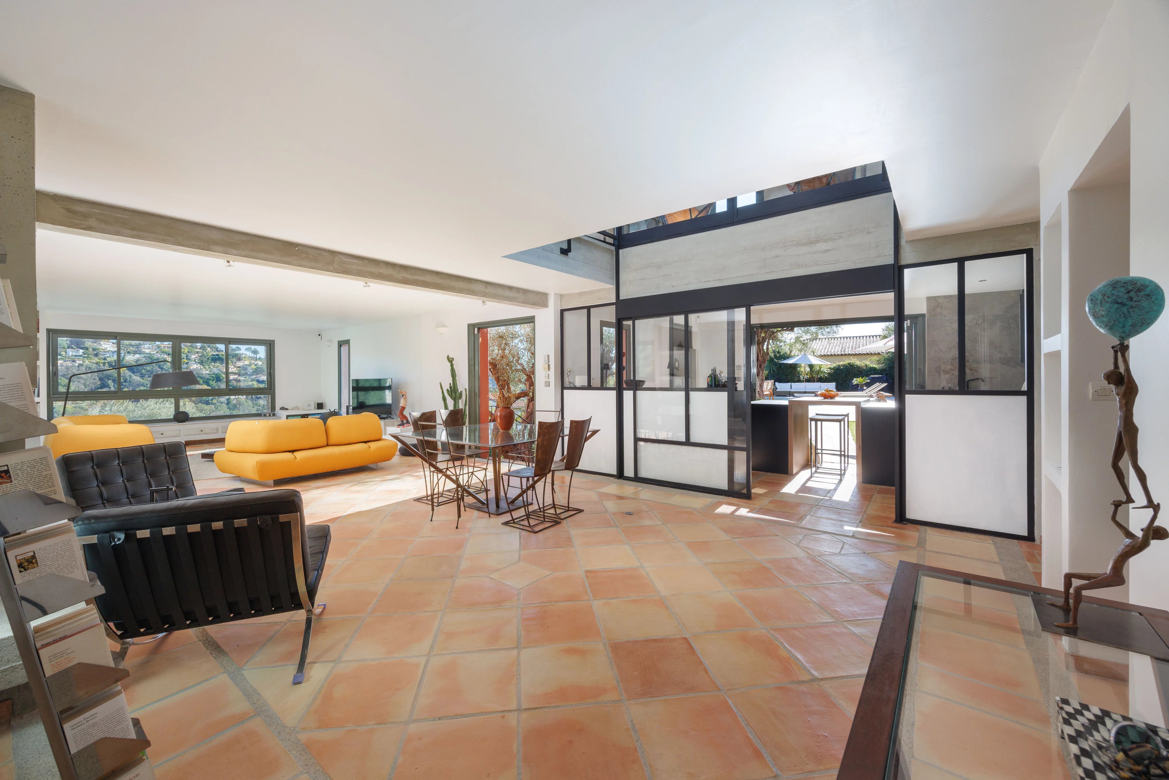 Der Wohnbereich von ca. 70 m² besticht durch sein Volumen, seine zeitgenössische Architektur und seinen authentischen Terrakotta-Boden. Große Fensterfronten öffnen einen freien Panoramablick auf die umliegende Natur.