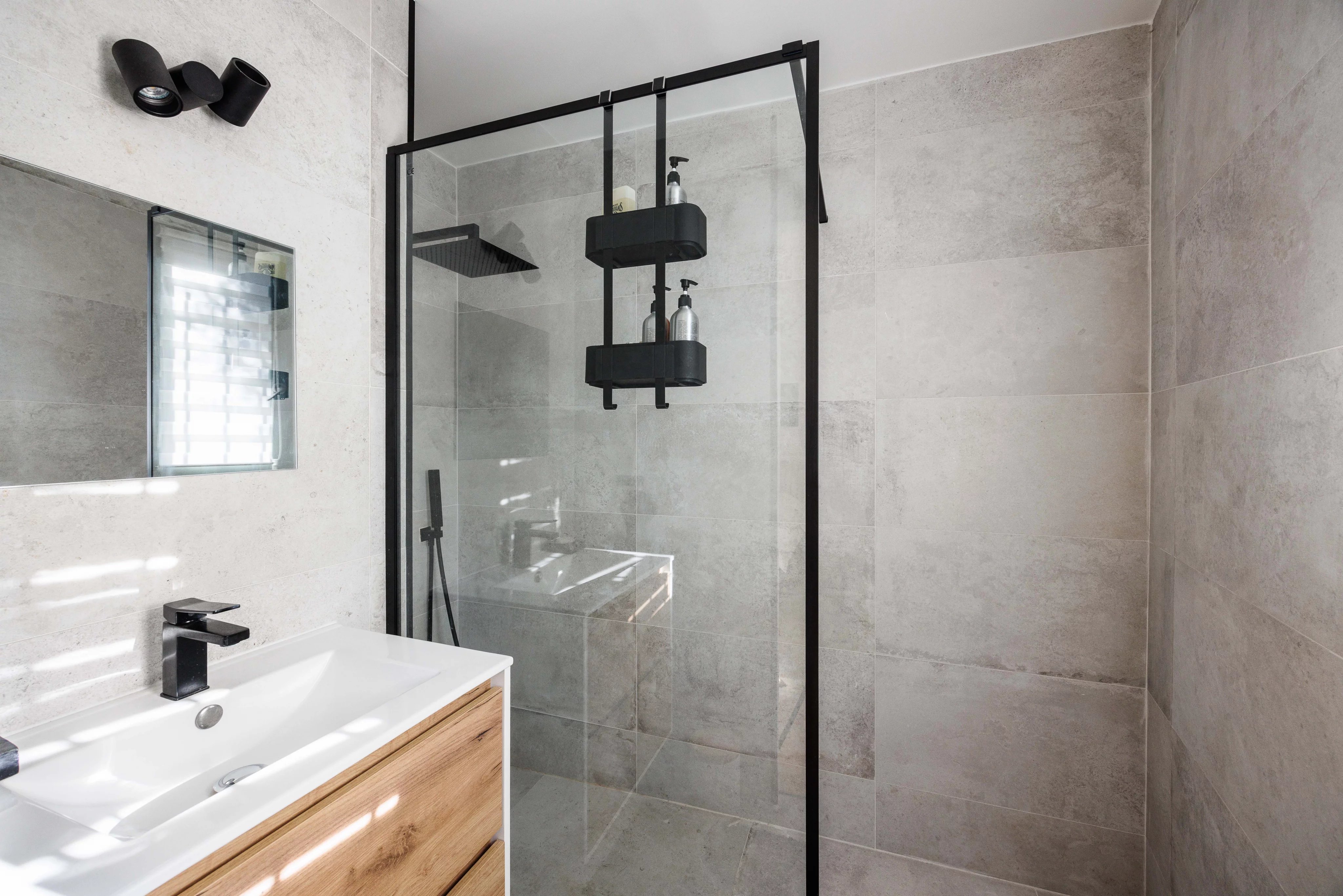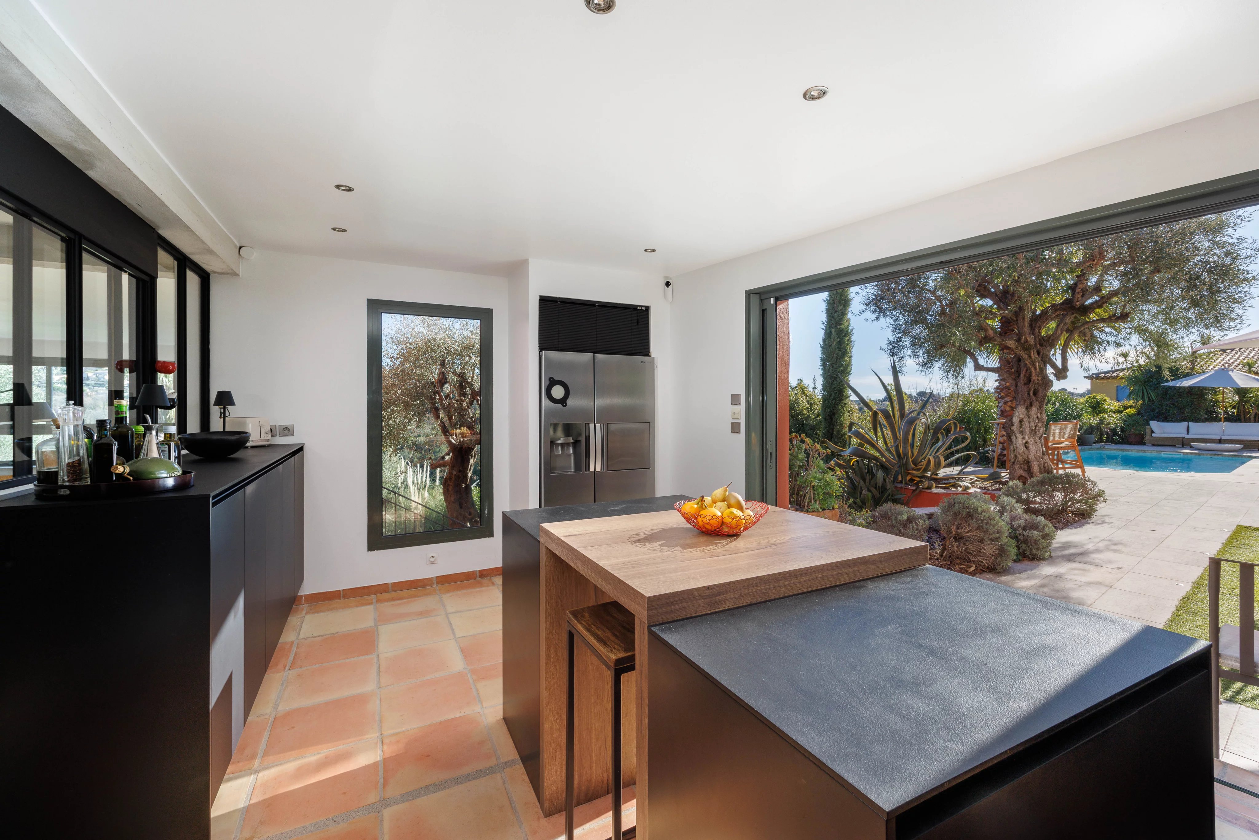 Die halboffene Küche, die mit einer zentralen Insel ausgestattet ist und durch ein Atelier-Glasdach hervorgehoben wird, öffnet sich direkt auf eine große, nach Süden ausgerichtete Terrasse. Ein Gäste-WC und Stauraum vervollständigen diese Ebene.