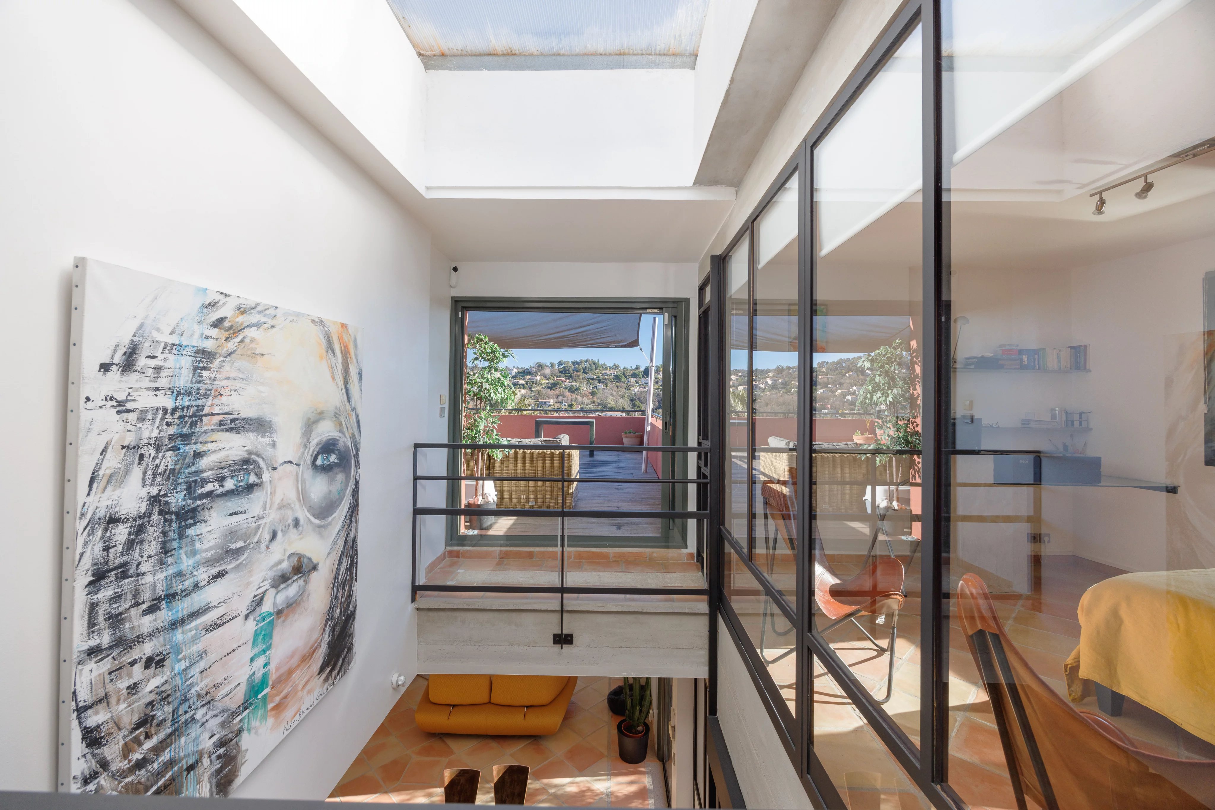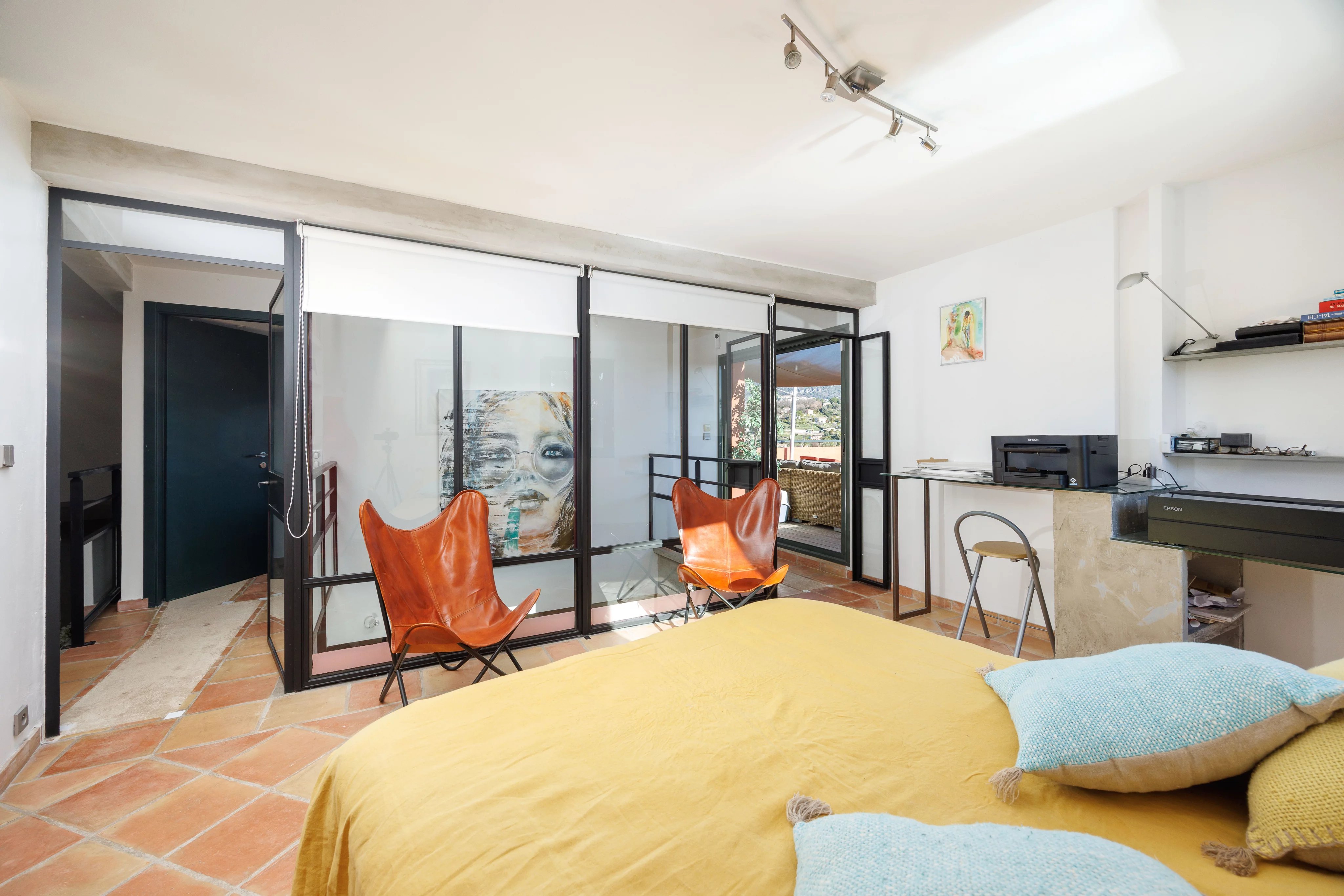 Im Obergeschoss befindet sich ein Wohnzimmer mit Oberlicht, das zu einem Schlafzimmer mit Bad und Zugang zu einer 45 m² großen Südostterrasse führt.