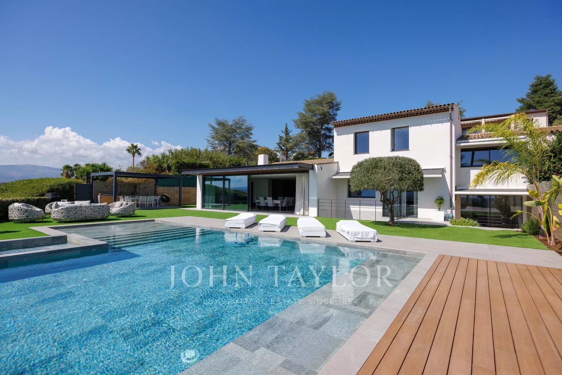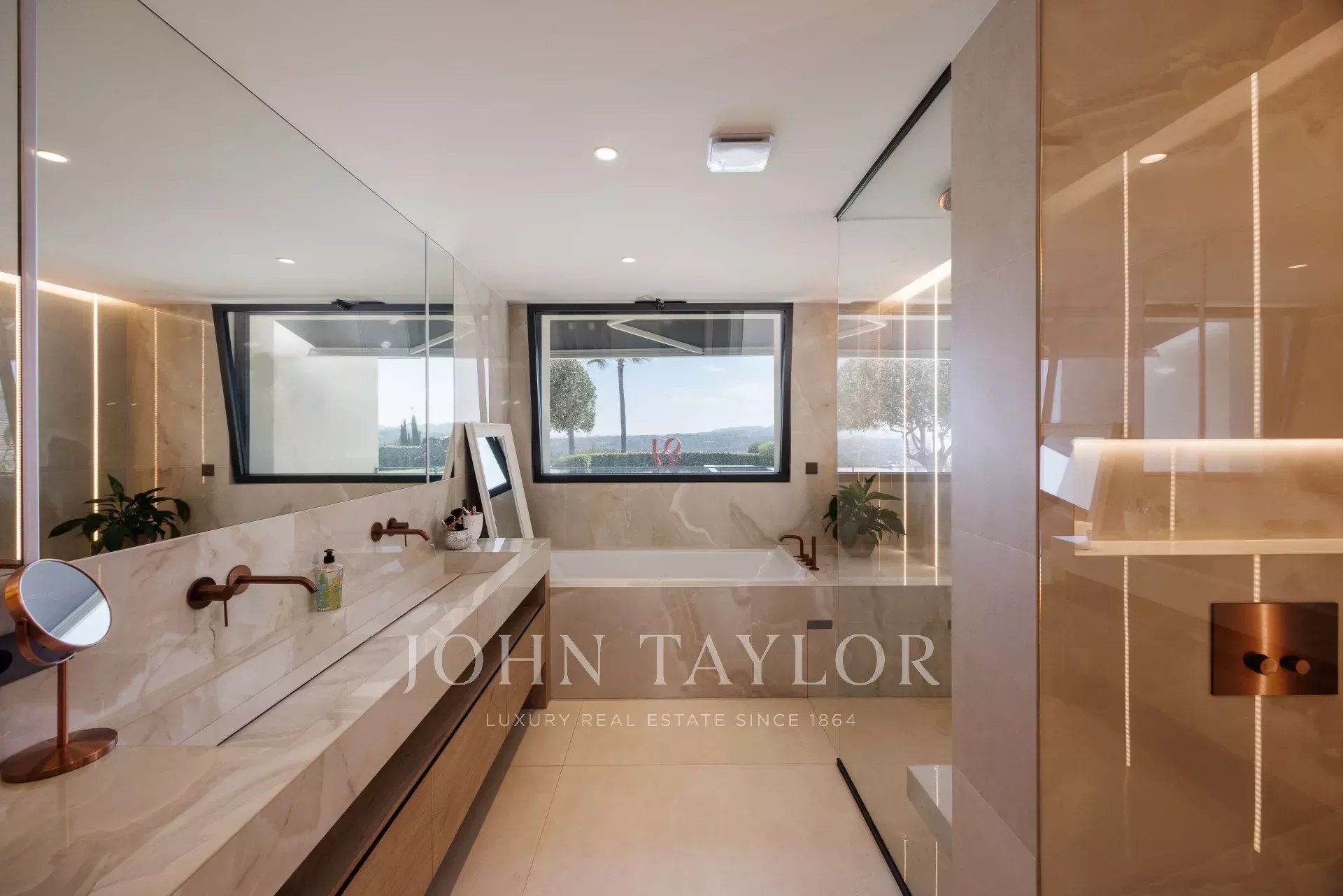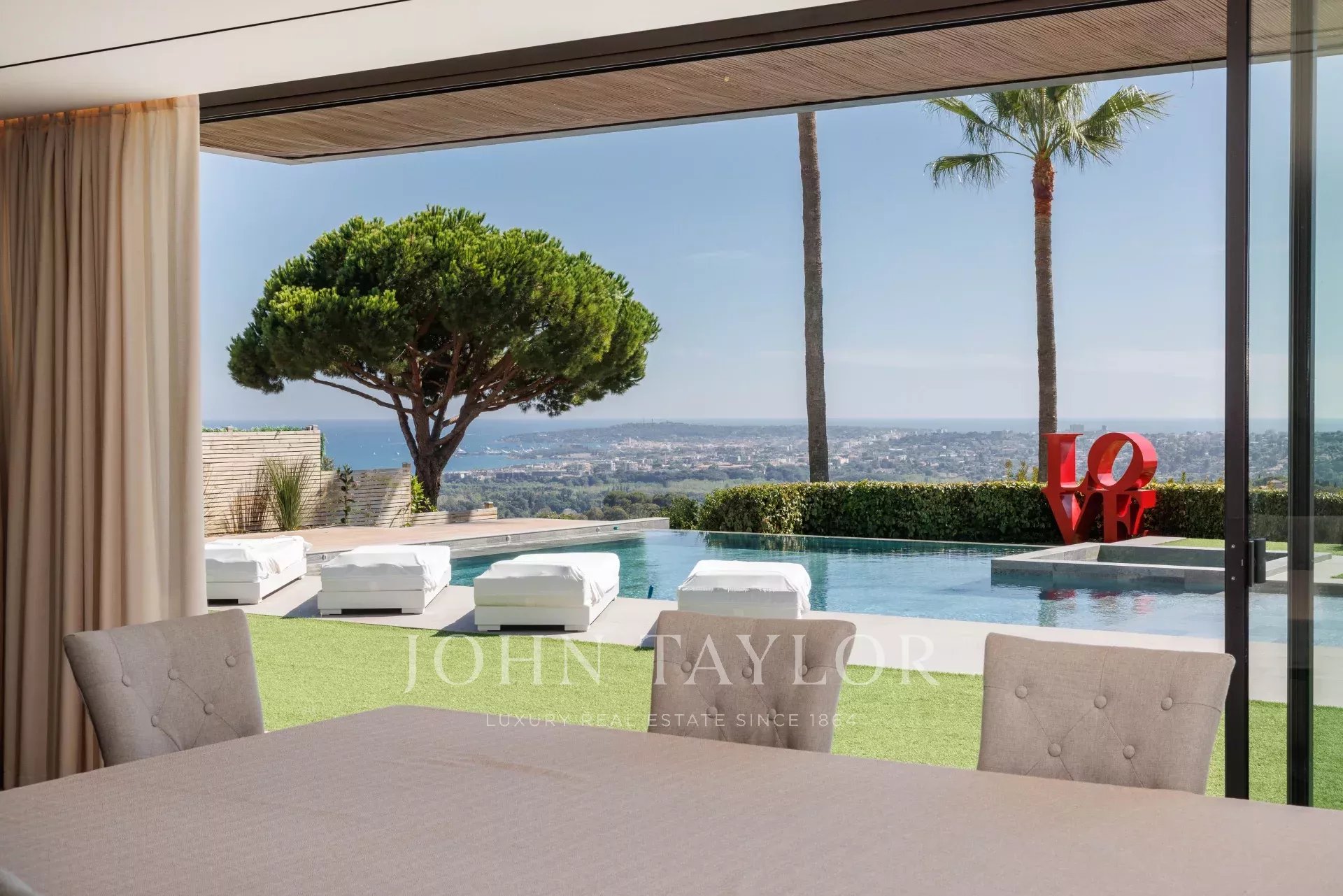 In einem der begehrtesten Gebiete der Côte d'Azur, in absoluter Ruhe und wie auf einem Hügel gelegen, bietet diese 2024 komplett neu gebaute Villa von fast 400 m² mit großem Pool und Jacuzzi in Südwestlage ein atemberaubendes Panorama auf Cap d'Antibes, das Meer und die umliegenden Hügel.