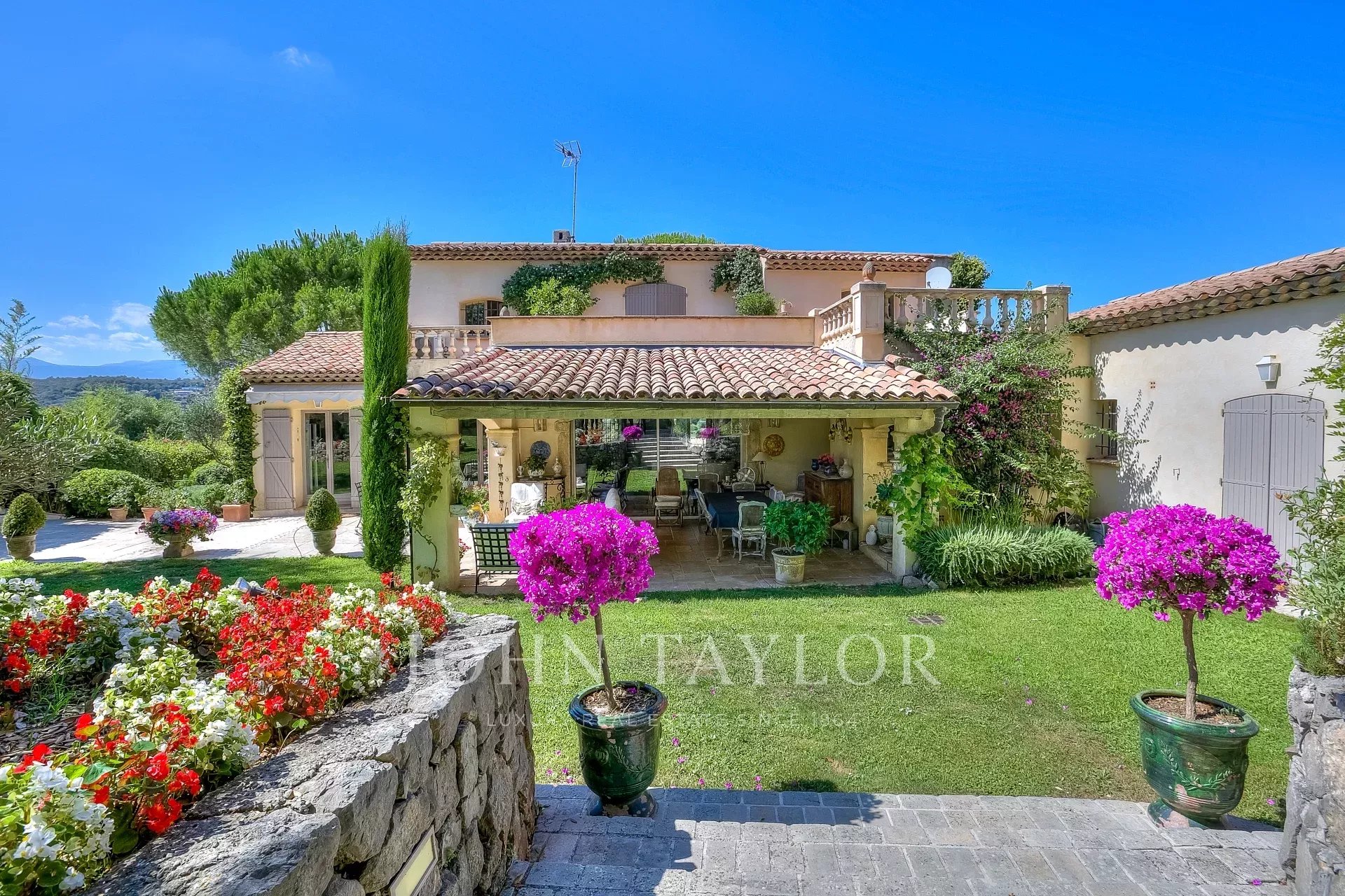 Diese attraktive Immobilie mit Doppelgarage und zahlreichen Parkplätzen besticht nicht nur durch ihren Charme sondern auch durch ihre ideale Lage – nur 25 Minuten vom Flughafen Nizza und 5 km vom Meer entfernt.