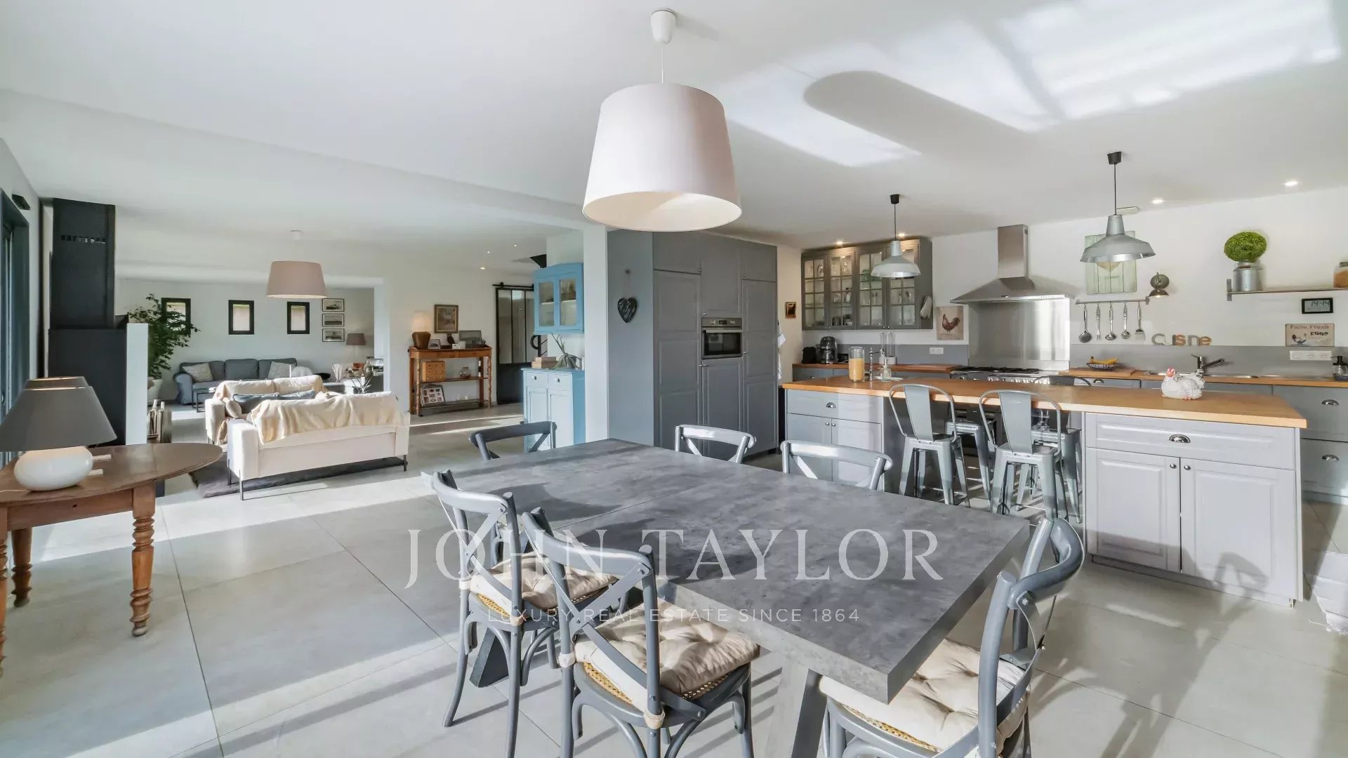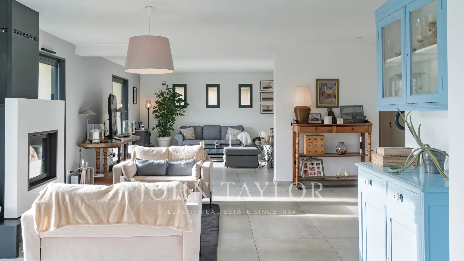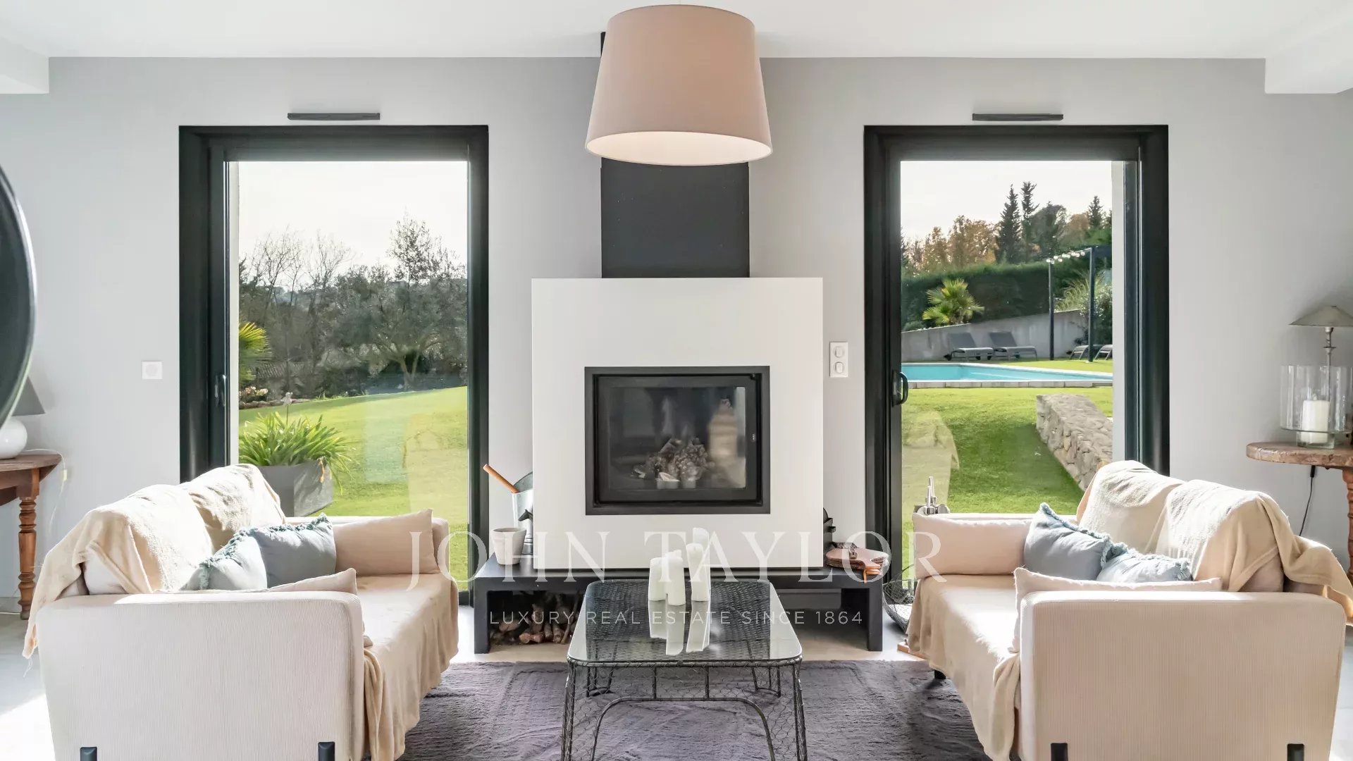 Das Erdgeschoss ist um ein über 100 m² großes Wohnzimmer mit Kamin angeordnet. Die großen Schiebefenster sorgen für viel Licht und ermöglichen den Zugang zum Außenbereich.