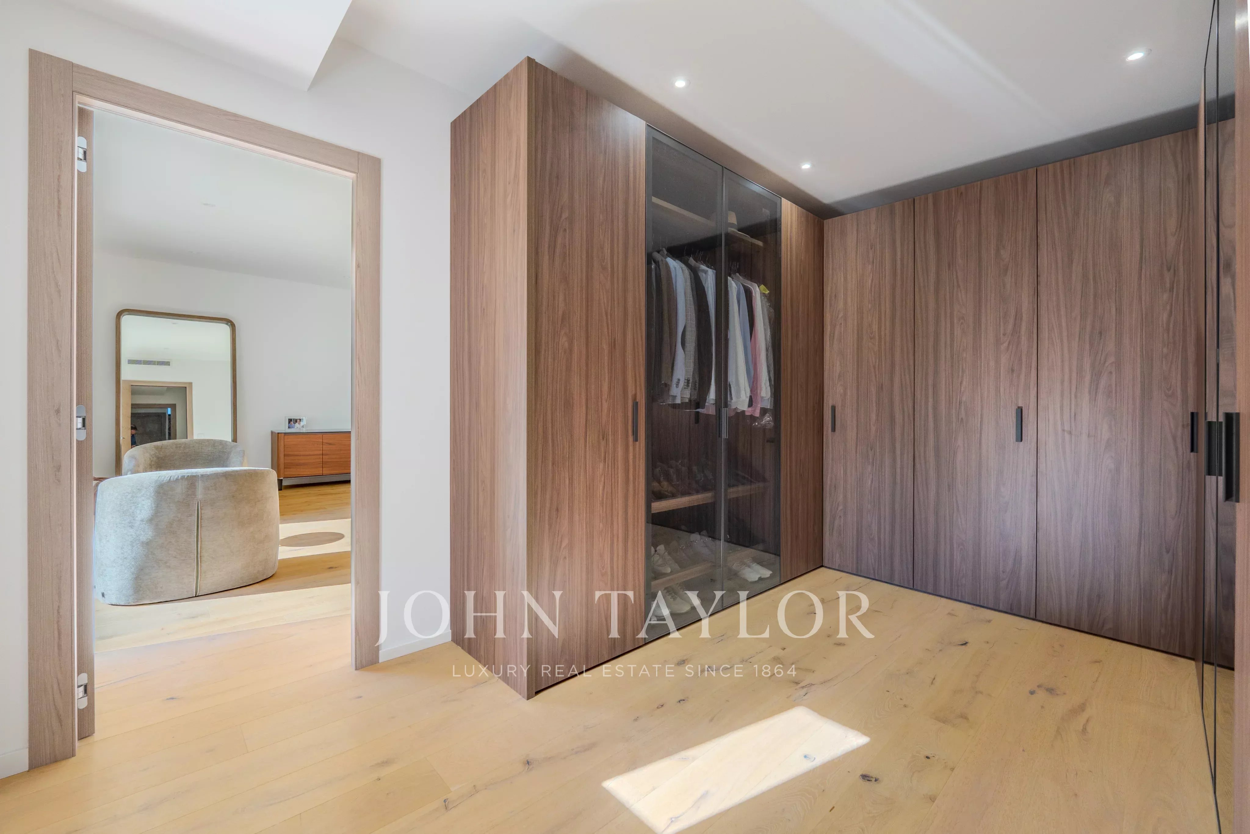 Schließlich stellt eine große geschlossene Garage, die bis zu fünf Fahrzeuge aufnehmen kann, einen besonders begehrten Vorteil in diesem Viertel dar. Die Villa verfügt außerdem über modernen Komfort mit Vollklimatisierung, elektrischen Rollläden und Alarmsystem, alles in einer erstklassigen Wohnumgebung in absoluter Ruhe.