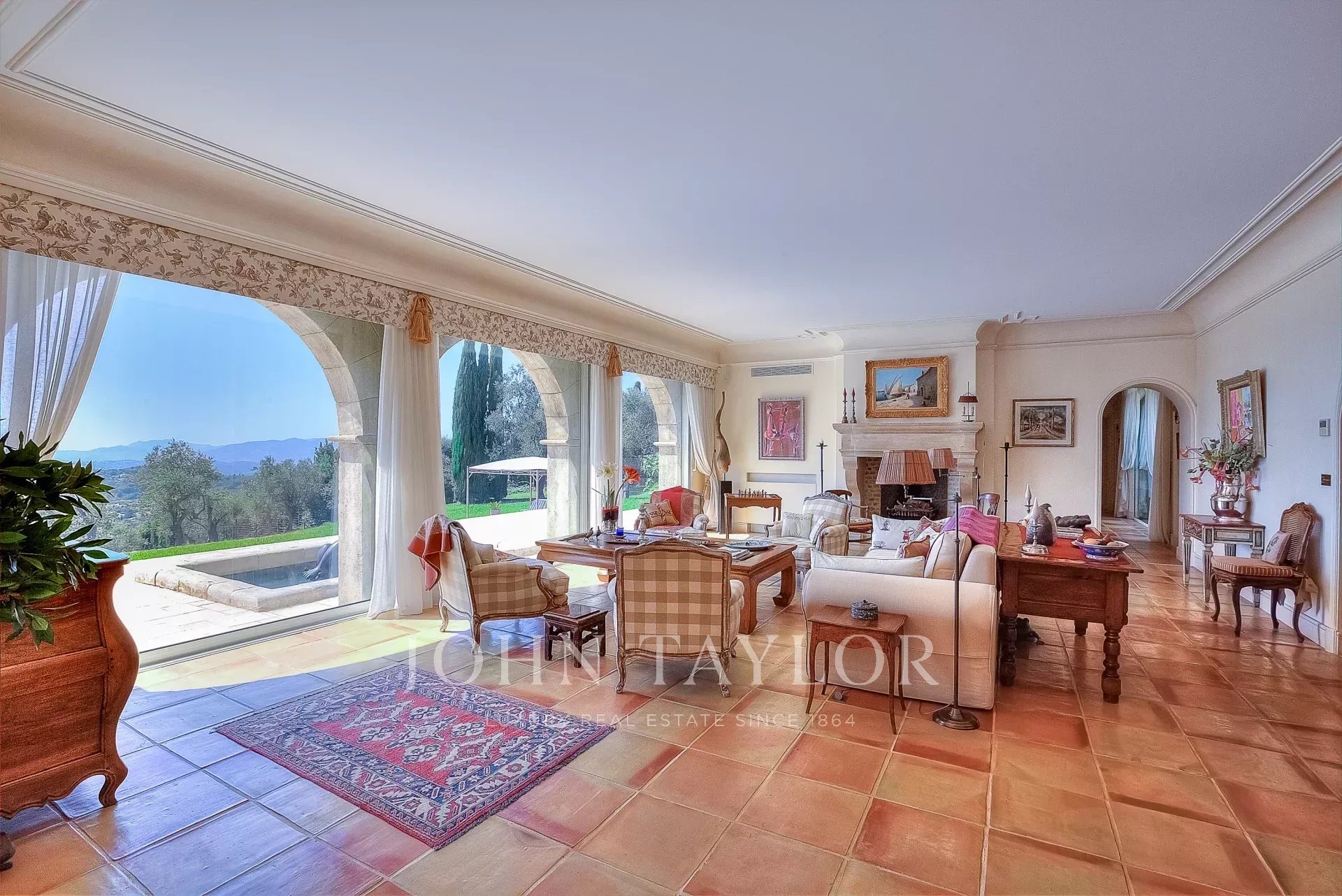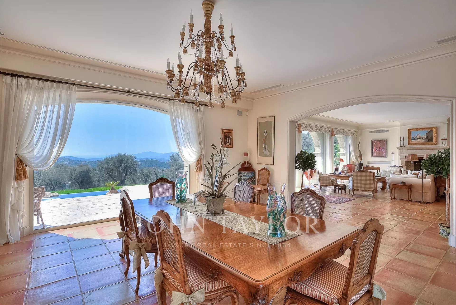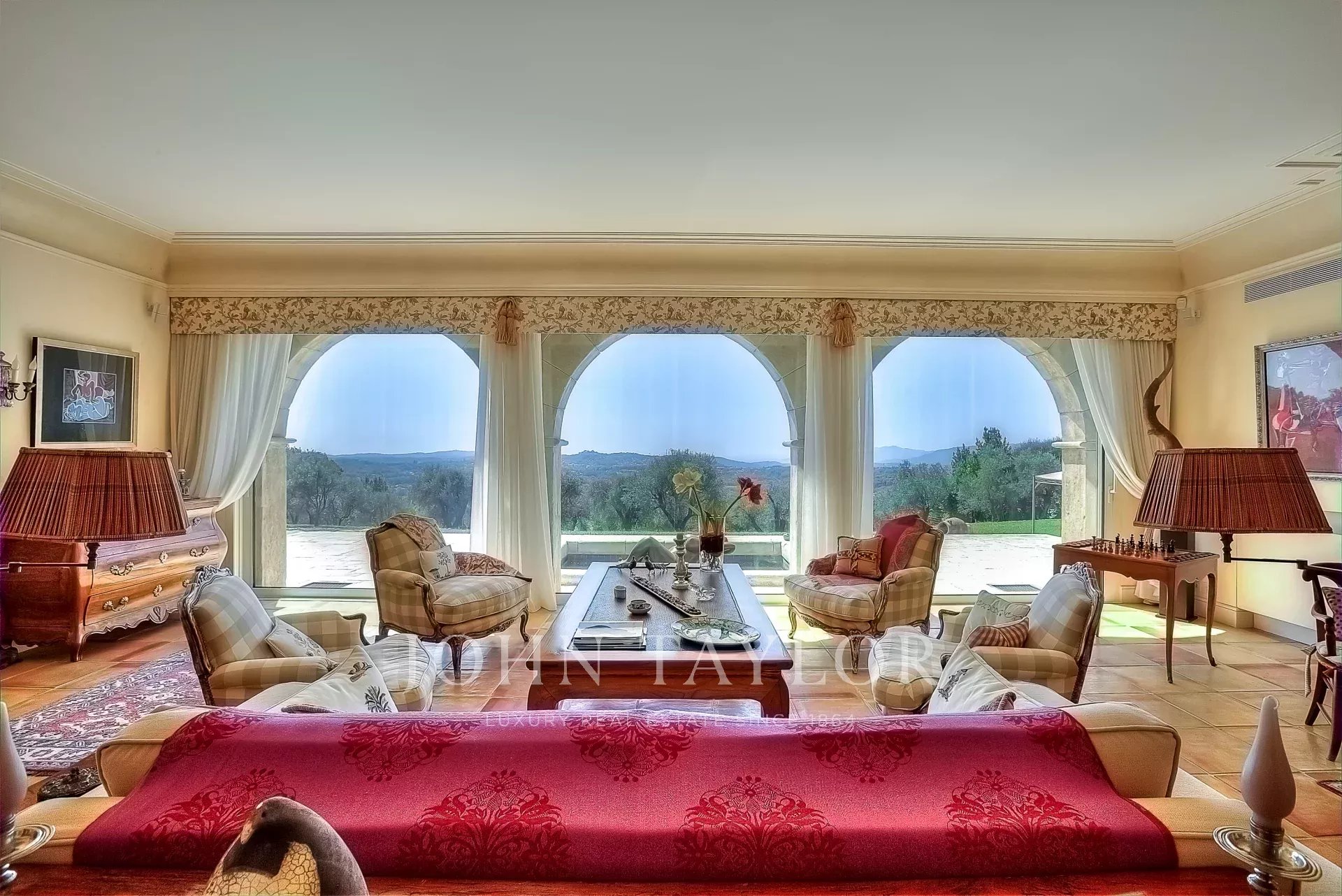 Dieses Prestigeobjekt, das Raffinesse, Komfort und Sicherheit vereint, erstreckt sich über ca. 600 m² Wohnfläche und bietet einen atemberaubenden Blick auf den Golfplatz und das herrliche Mittelmeerpanorama von der Bucht von Nizza bis Mandelieu.